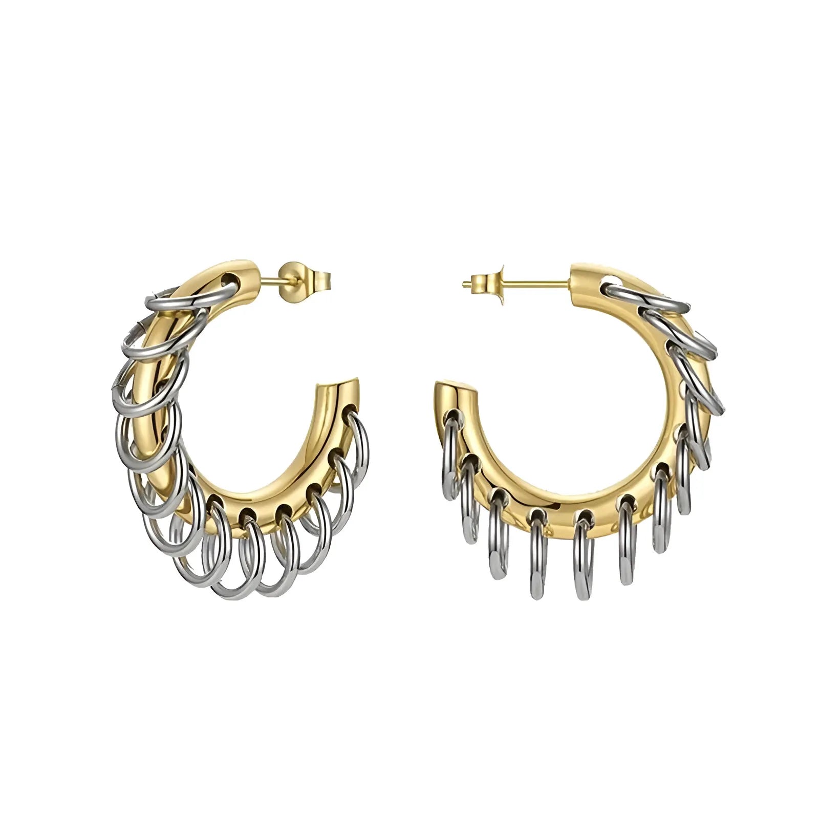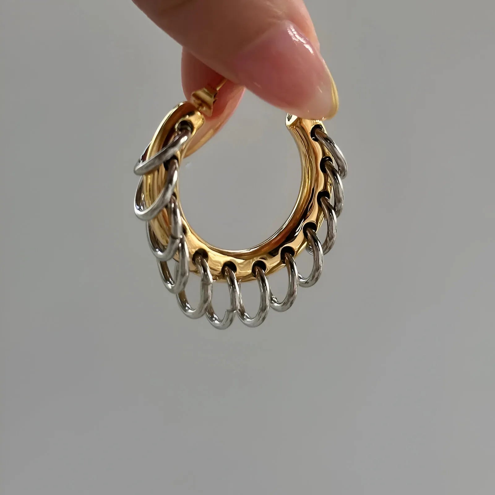 Zarif zincir detaylarıyla tasarlanmış bu halka küpeler, ışığı her açıdan yansıtarak dikkat çeker. Hem günlük kombinlerle hem de özel günlerde rahatlıkla kullanılabilir. Hafif yapısı sayesinde gün boyu konfor sağlar.