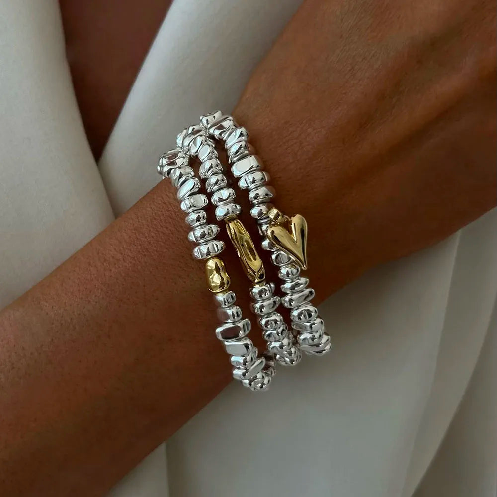 Her bileklik parlak gümüş boncuklarla tasarlanmıştır ve ışığı mükemmel şekilde yansıtarak dikkat çeker. Setin içerisindeki altın kalp figürü, romantik ve zarif bir dokunuş sağlar. Esnek yapısı sayesinde her bileğe rahatça uyum sağlar. Dilerseniz tüm bileklikleri birlikte takabilir ya da farklı bilekliklerle kombinleyerek kişisel stilinizi yansıtabilirsiniz.