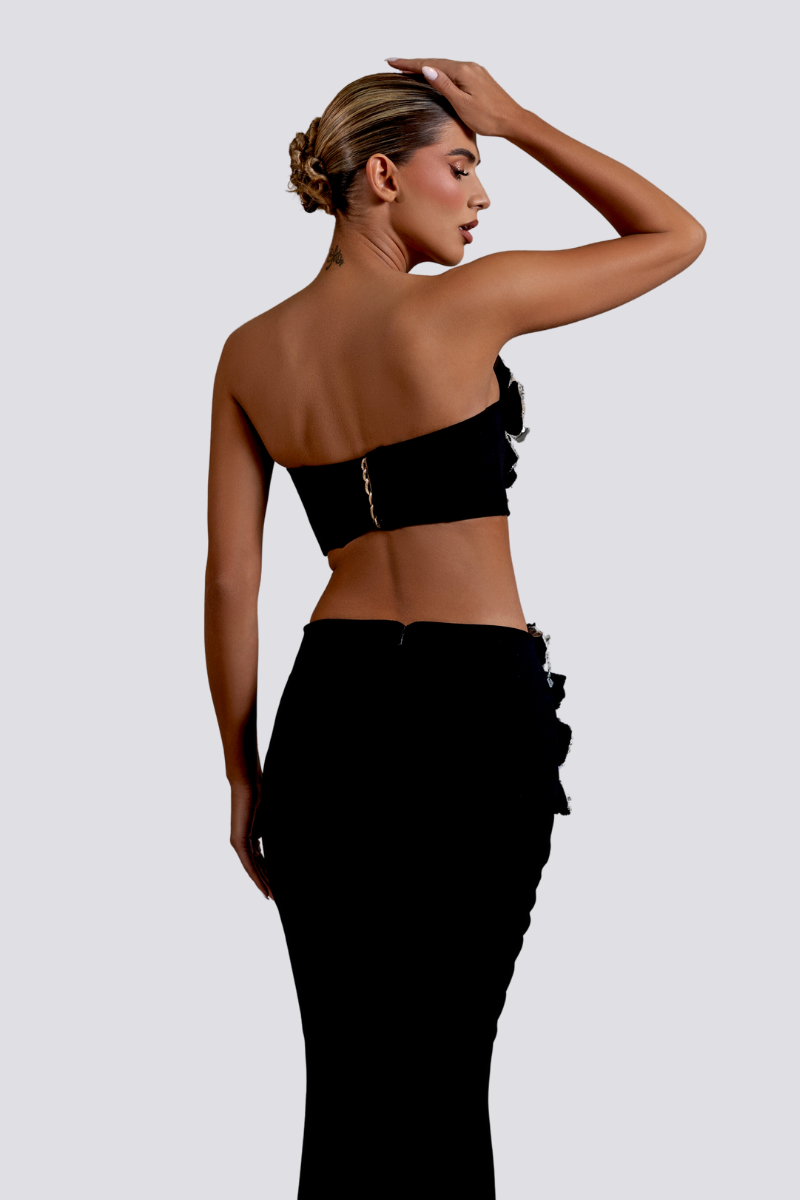 Işıltılı taş detaylı straplez crop top ve vücuda oturan bodycon etekten oluşan bu iki parçalı takım, tatil ve özel akşamlar için ideal. Parlak taşlar ışığı yakalar ve görünümünüze büyüleyici bir dokunuş katar.