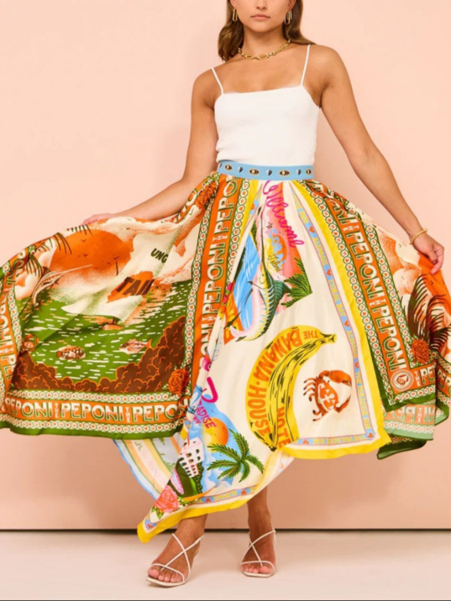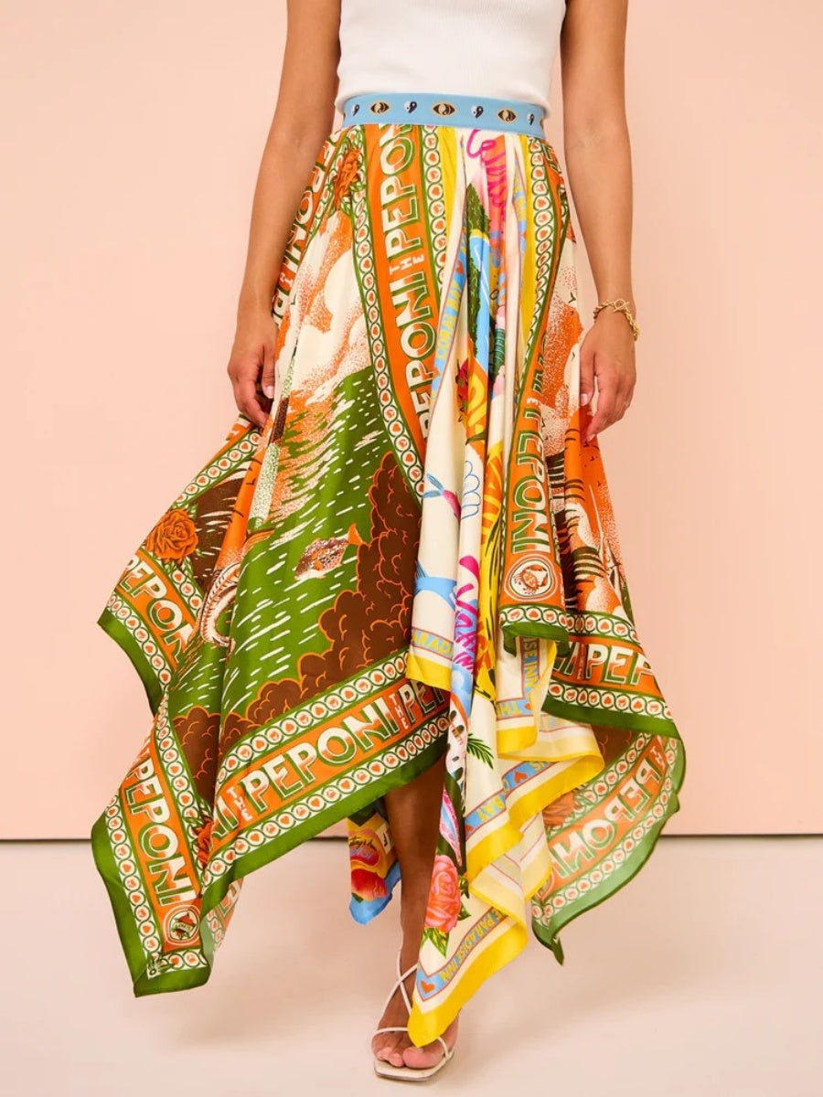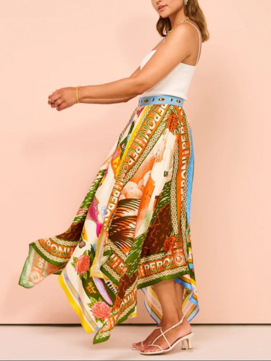 Canlı desenleri ve asimetrik eteğiyle enerjik bir tarz sunan bu maksi etek, yüksek bel kesimiyle zarif bir duruş kazandırır. Günlükten tatil stiline kadar her anınıza renk katmak için ideal.