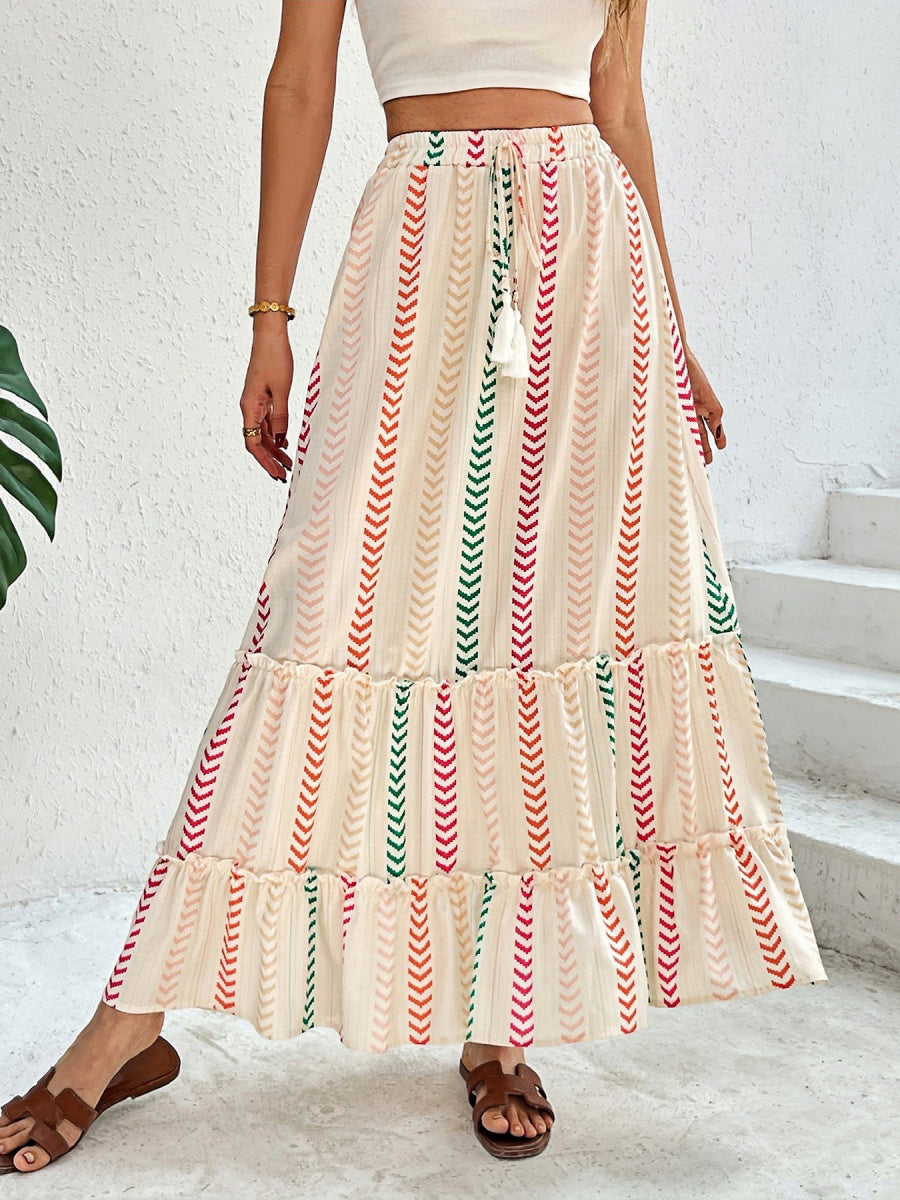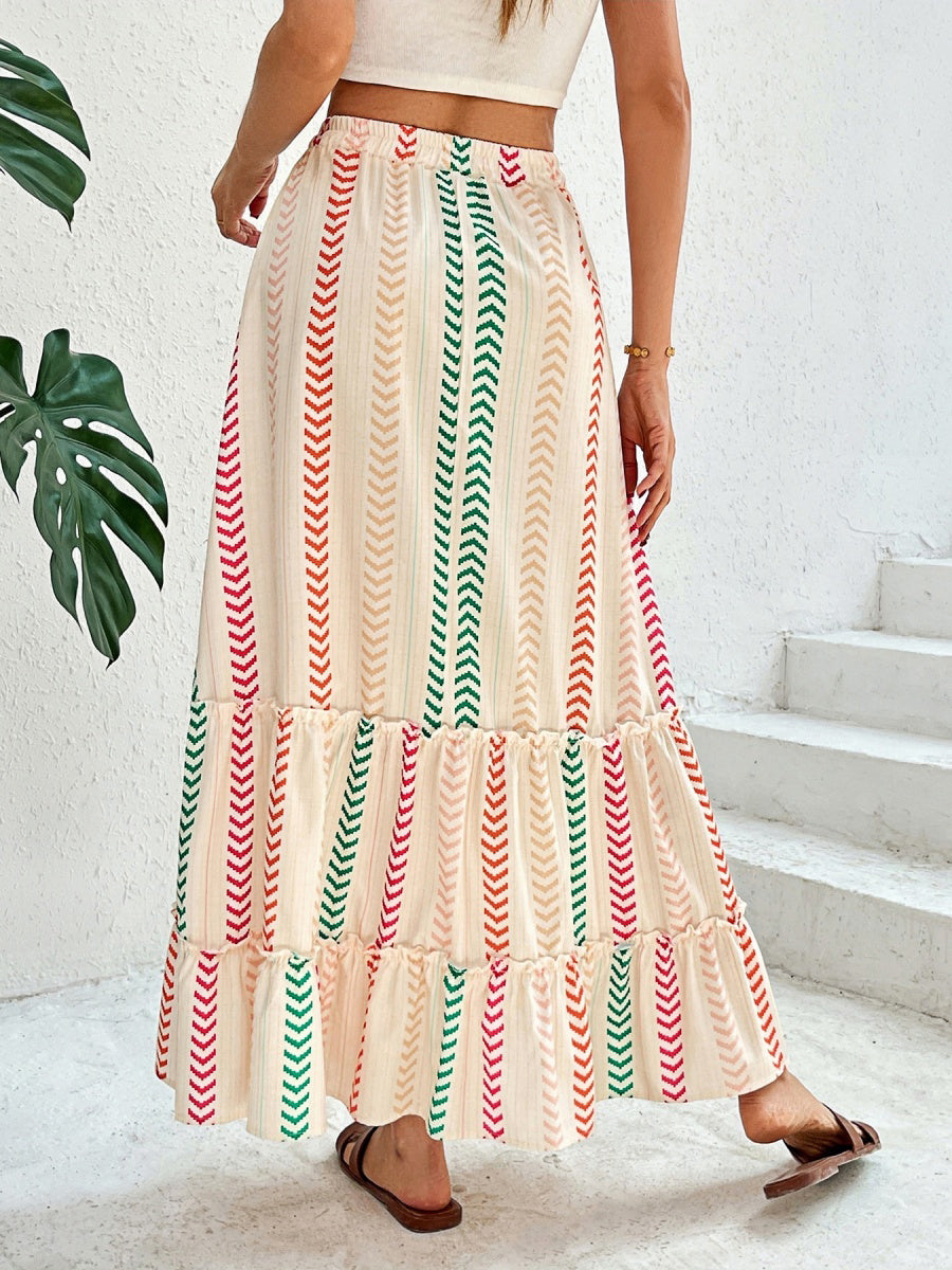 Enerjik ok desenleri ve A-kesim siluetiyle özgür ruhunuzu yansıtan bu yüksek bel uzun etek, her vücut tipine uyum sağlar. Günlük kullanımdan tatil stiline kadar stilinize renk katacak çok yönlü bir parça.