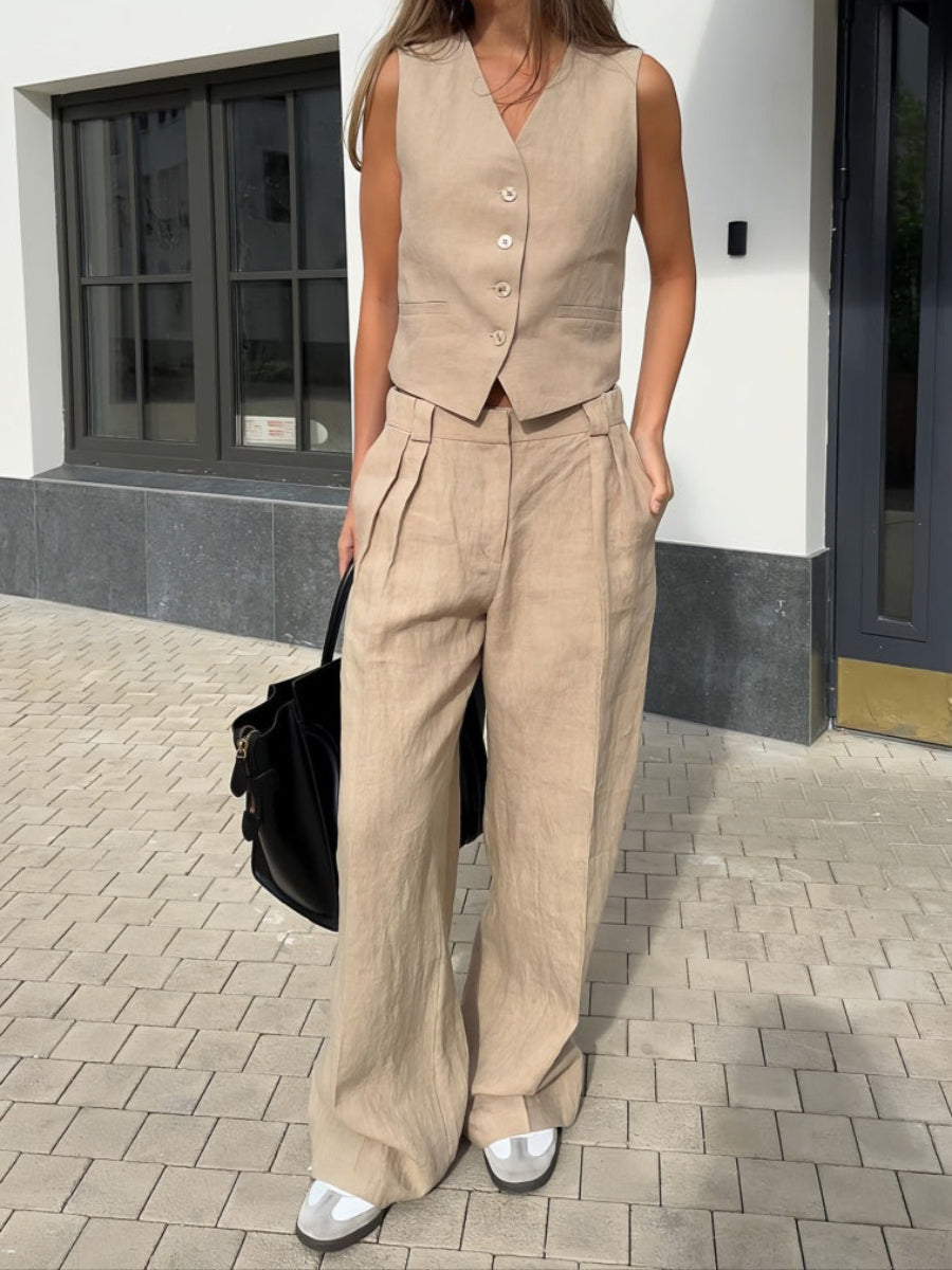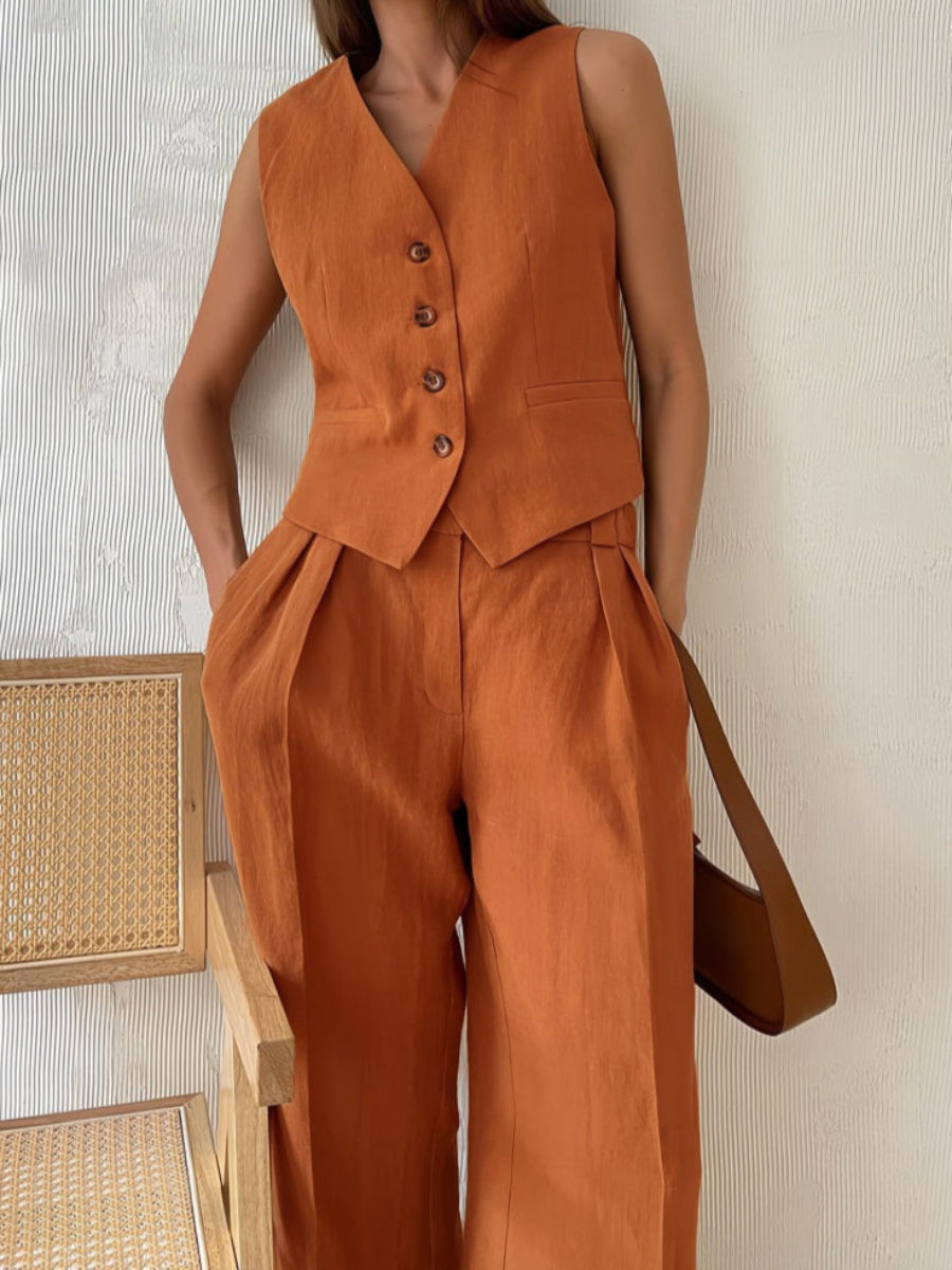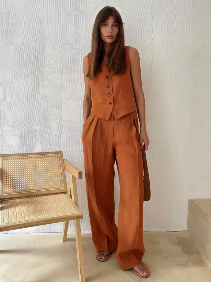 Şık düğme detaylarına sahip bu düz renk yelek ve rahat pantolon takımı, işten tatil günlerine kadar her ortamda stilinizi ön plana çıkarır. Konforlu kumaş karışımı ve oversize kesimiyle gün boyu rahatlık sağlar.