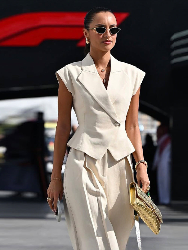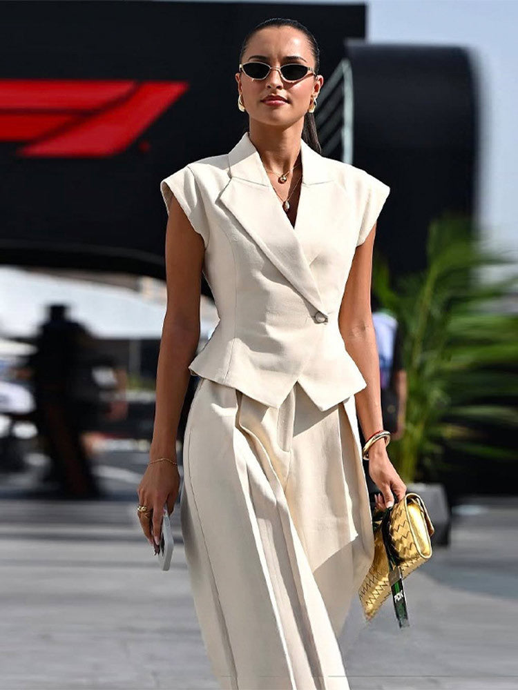 Pantolon, tam boy kesimi, Fransız tarzı bel bandı, ön pile detayları ve işlevsel ön cepleriyle özel bir görünüm sunarken, geniş paça silueti akıcı ve rahat bir duruş sağlar; sıcak havalar için idealdir. Üst ise takımınıza yapı ve hafiflik katarak uyumlu ve şık bir kombin yaratır.