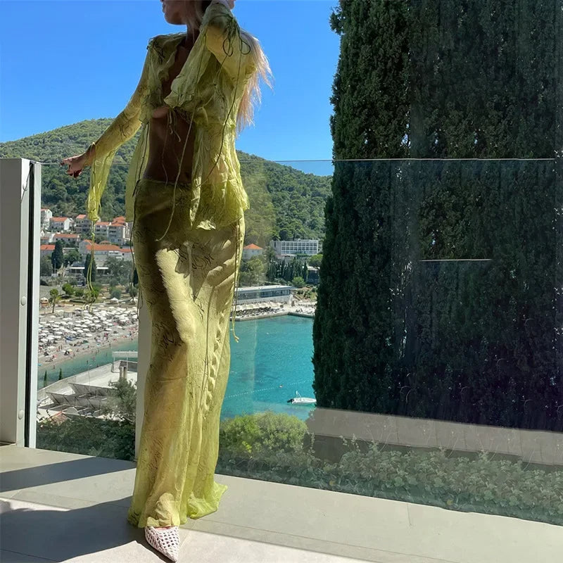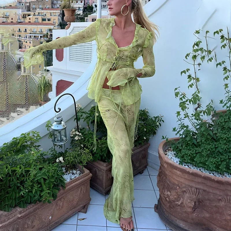 Baskılı Maxi Takım, polyester ve spandeks karışımıyla vücudu güzelce saran rahat bir kesim sunar. Tatil veya plajda şıklığı yakalamak isteyenler için tasarlanmış, dikkat çeken baskılı modeliyle fark yaratır. İnce askılı crop top ve geniş paça pantolon, zarif ve modern bir görünüm sağlar.