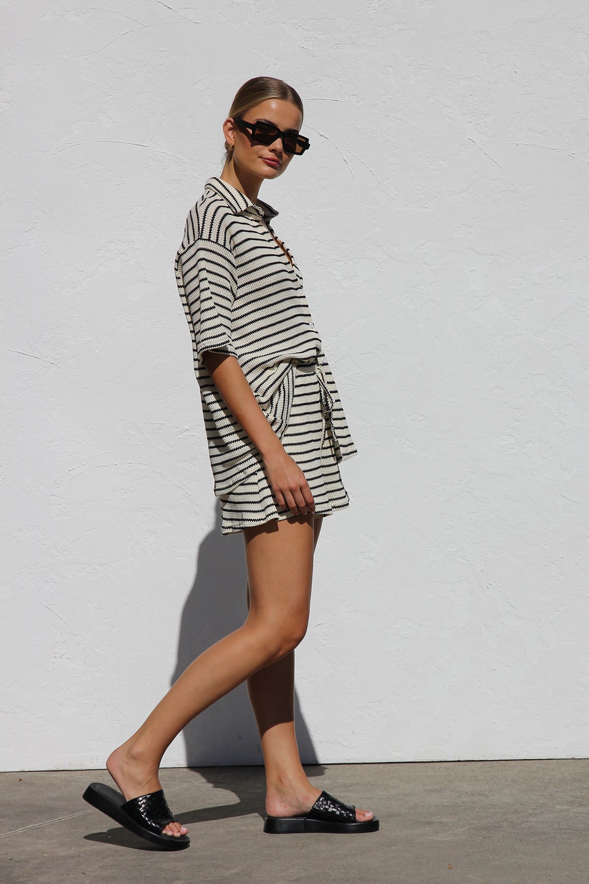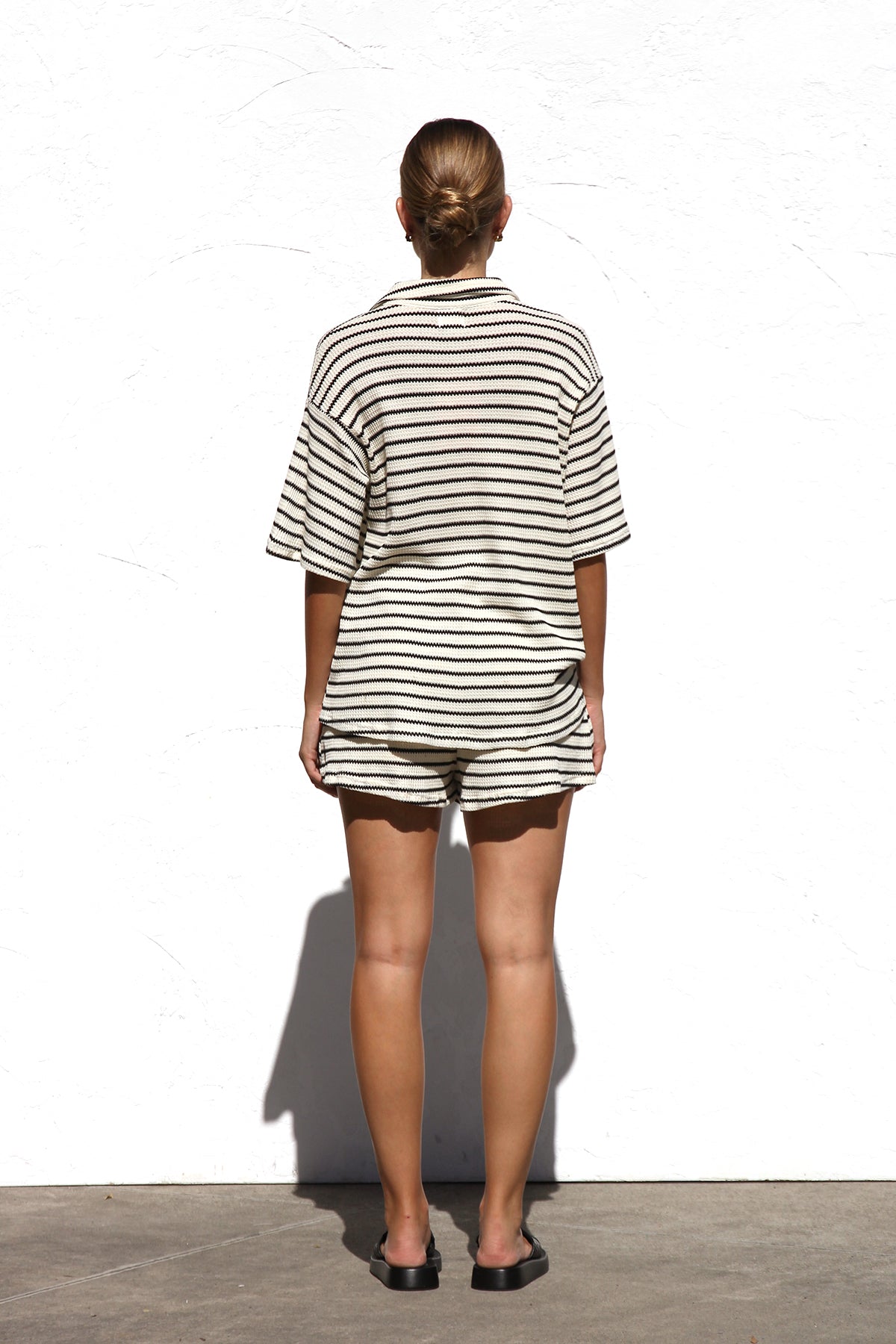 Zahmetsiz şıklığı, bej zemin üzerine dikkat çekici siyah çizgili hafif triko iki parçalı takım ile keşfedin. Takım, rahat kesimli yakalı düğmeli üstten oluşur. Üst, astarsız ve yarı transparan yapısıyla ferah ve günlük bir görünüm sunar.