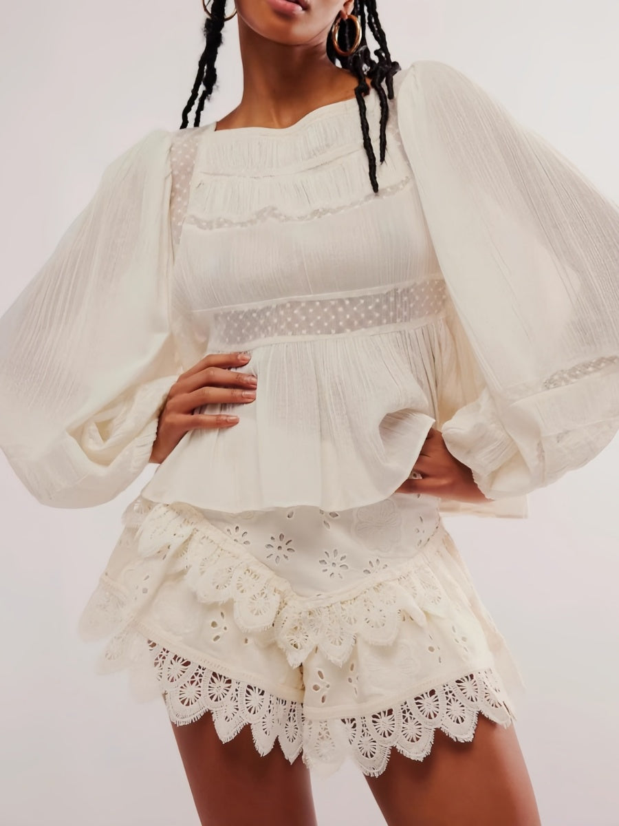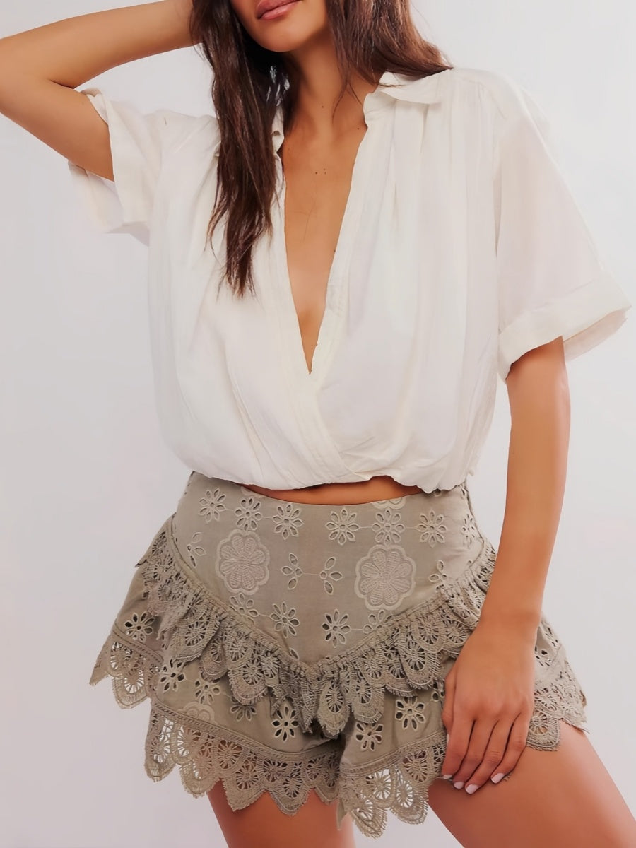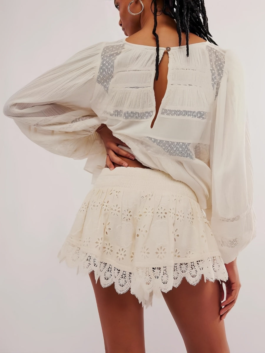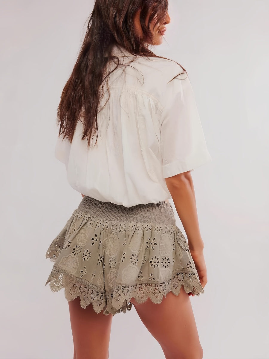 Dantel paça detayı ve zarif çiçek desenleriyle öne çıkan bu mini şort, yaz stilinize romantik ve enerjik bir hava katar. Yüksek bel kesimiyle vücuda oturur, tatilden günlük buluşmalara her ana uyum sağlar.