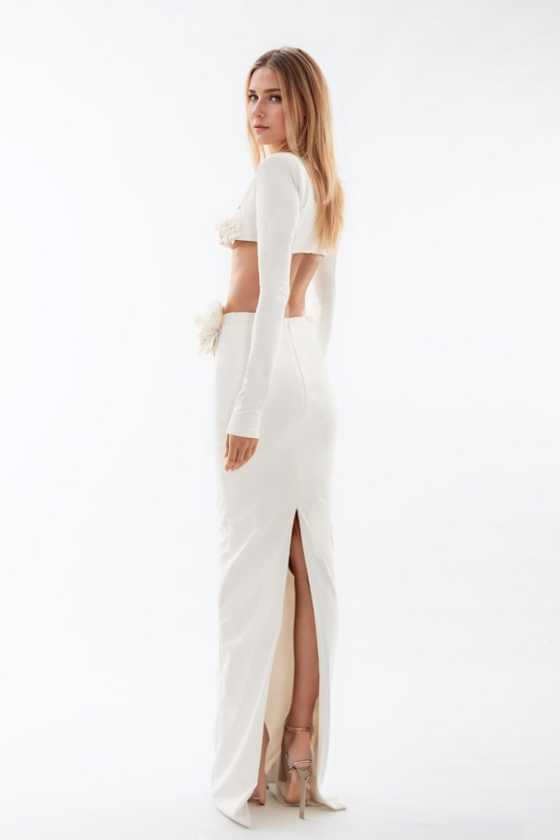 Uzun kollu, çiçek işlemeli crop top ile uzun düz etekten oluşan bu takım, sofistike bir şıklık sunar. Bandaj kumaşı hafif esnek yapısıyla konfor ve vücuda oturan bir kesim sağlar. Arka gizli fermuar, kusursuz bir siluet yaratır. Resmi davetler ve özel günler için ideal, topuklu ayakkabı ve sade takılarla tamamlanabilir.
