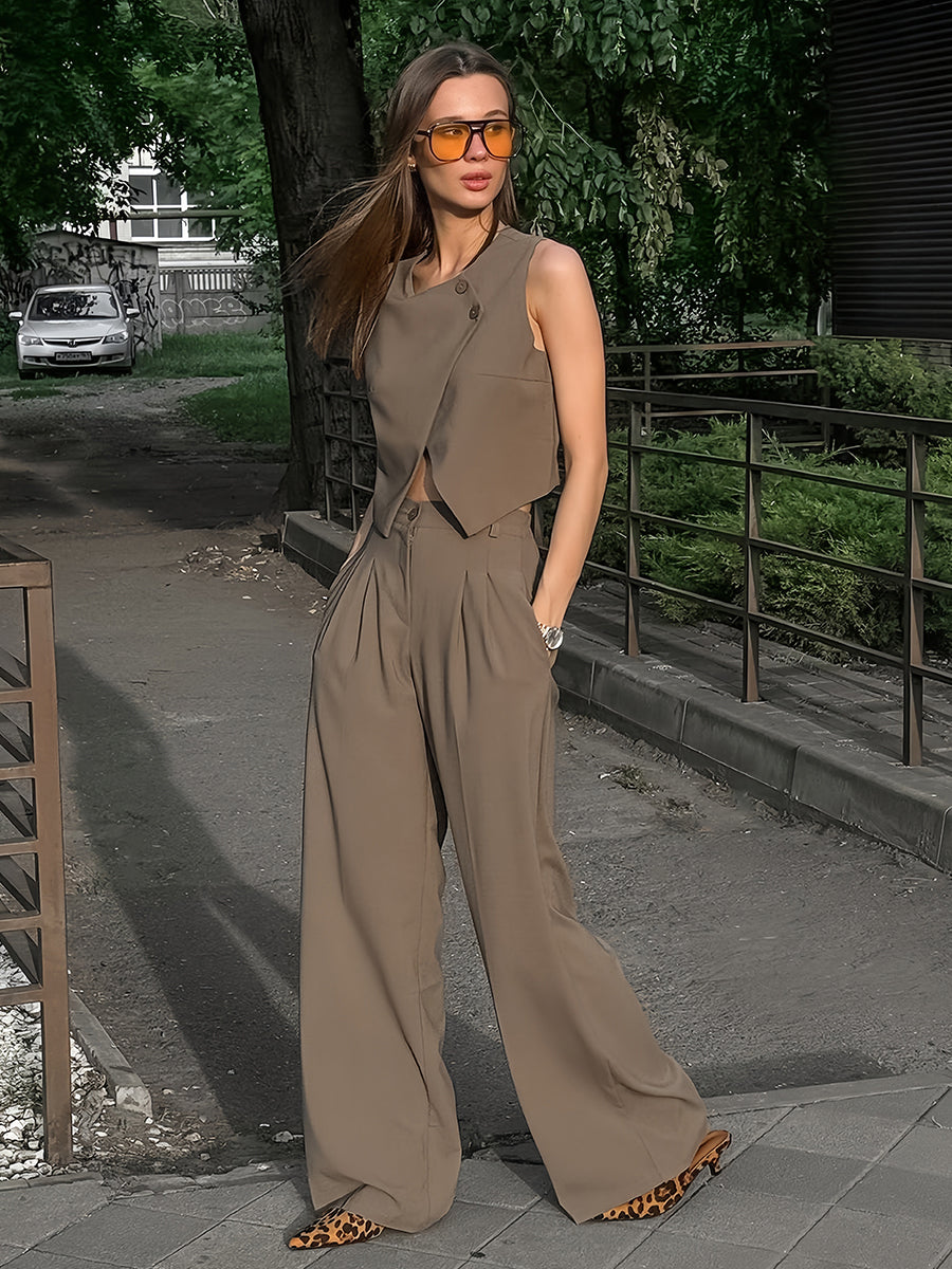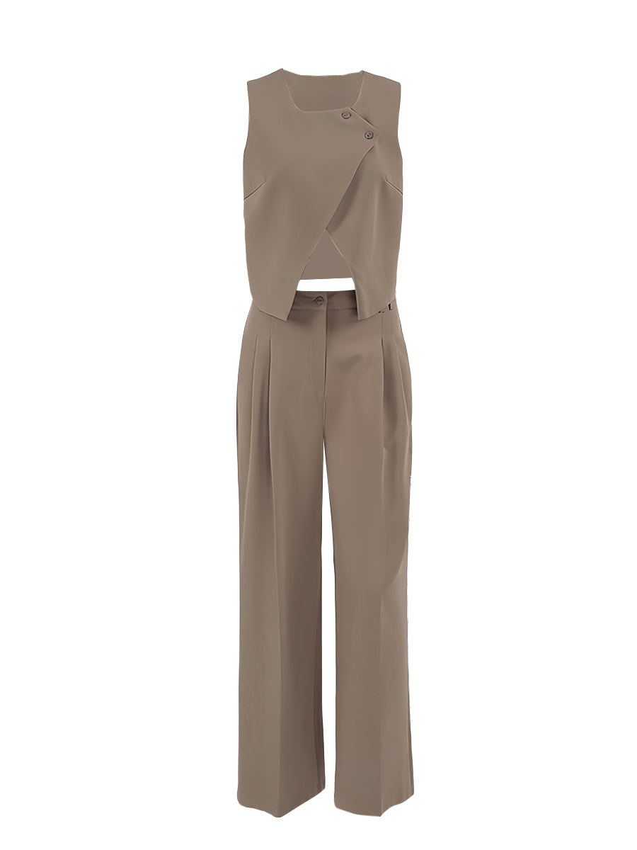 Düz renk, asimetrik detaylı kolsuz üst ve pantolon takımıyla tarzınızı konuşturun. Kendine özgü asimetrik kapama görsel bir çekicilik yaratırken, kolsuz tasarım size konfor sağlar. Mükemmel uyumlu pantolonla tamamlanan bu takım, şıklığı ve rahatlığı bir arada sunar.