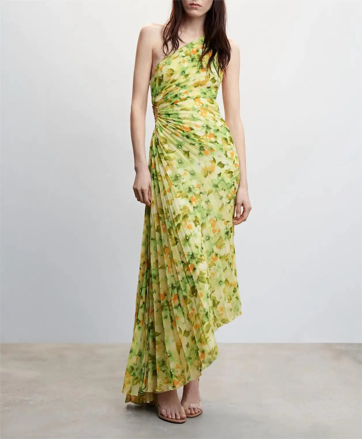 Zarif ve modern tasarımıyla öne çıkan bu kolsuz maxi elbise, pliseli detayları ve asimetrik etek ucu ile feminen bir siluet yaratıyor. Geniş askıları ve çiçek desenleri, şıklığınıza romantik bir dokunuş katarken, orta esnekliğe sahip kumaşı gün boyu rahatlık sağlar. Arka gizli fermuar kapanışı ile pratiklik sunan bu elbise, özel davetlerden yaz akşamlarına kadar her ortamda stilinizi tamamlayacak.
