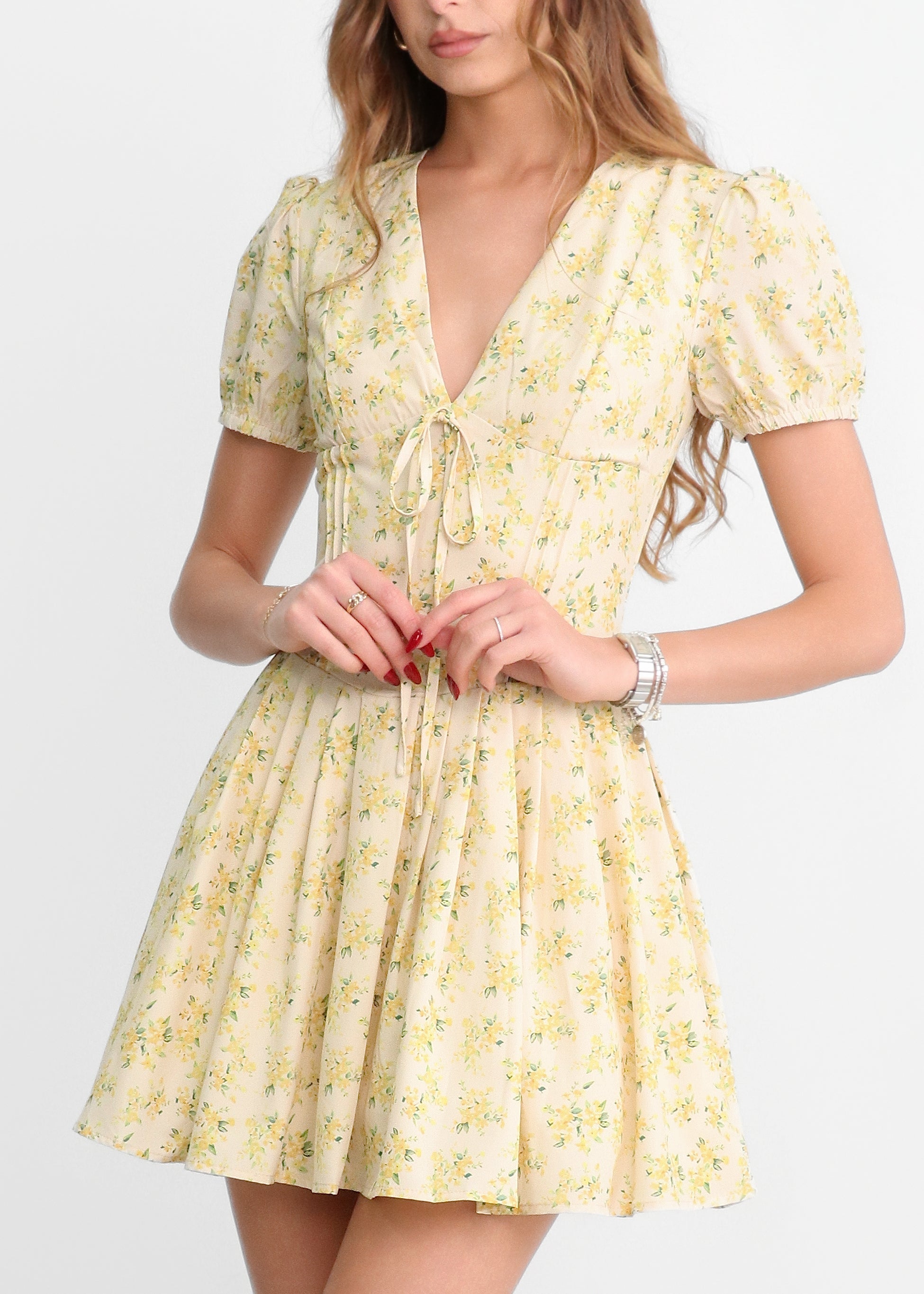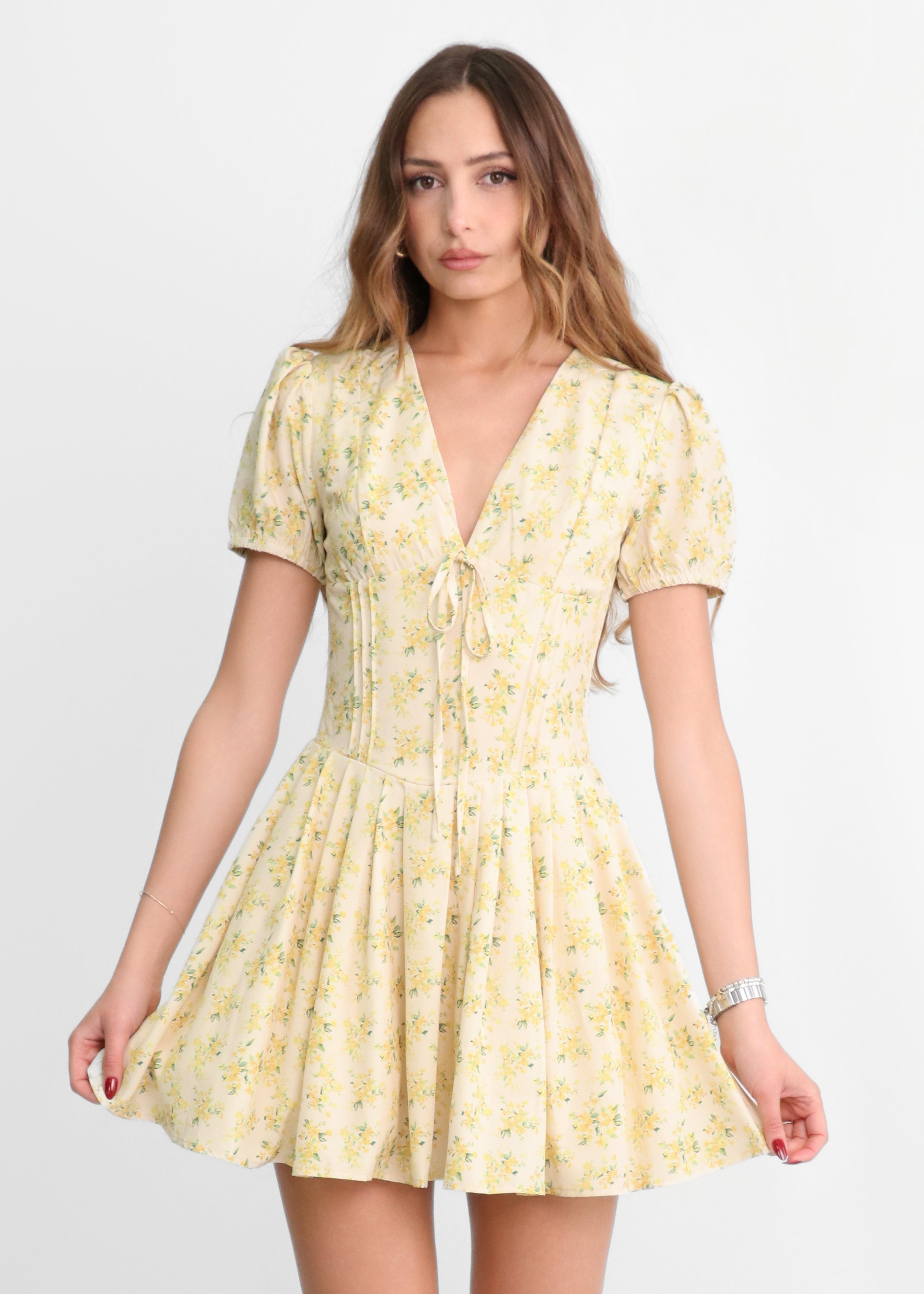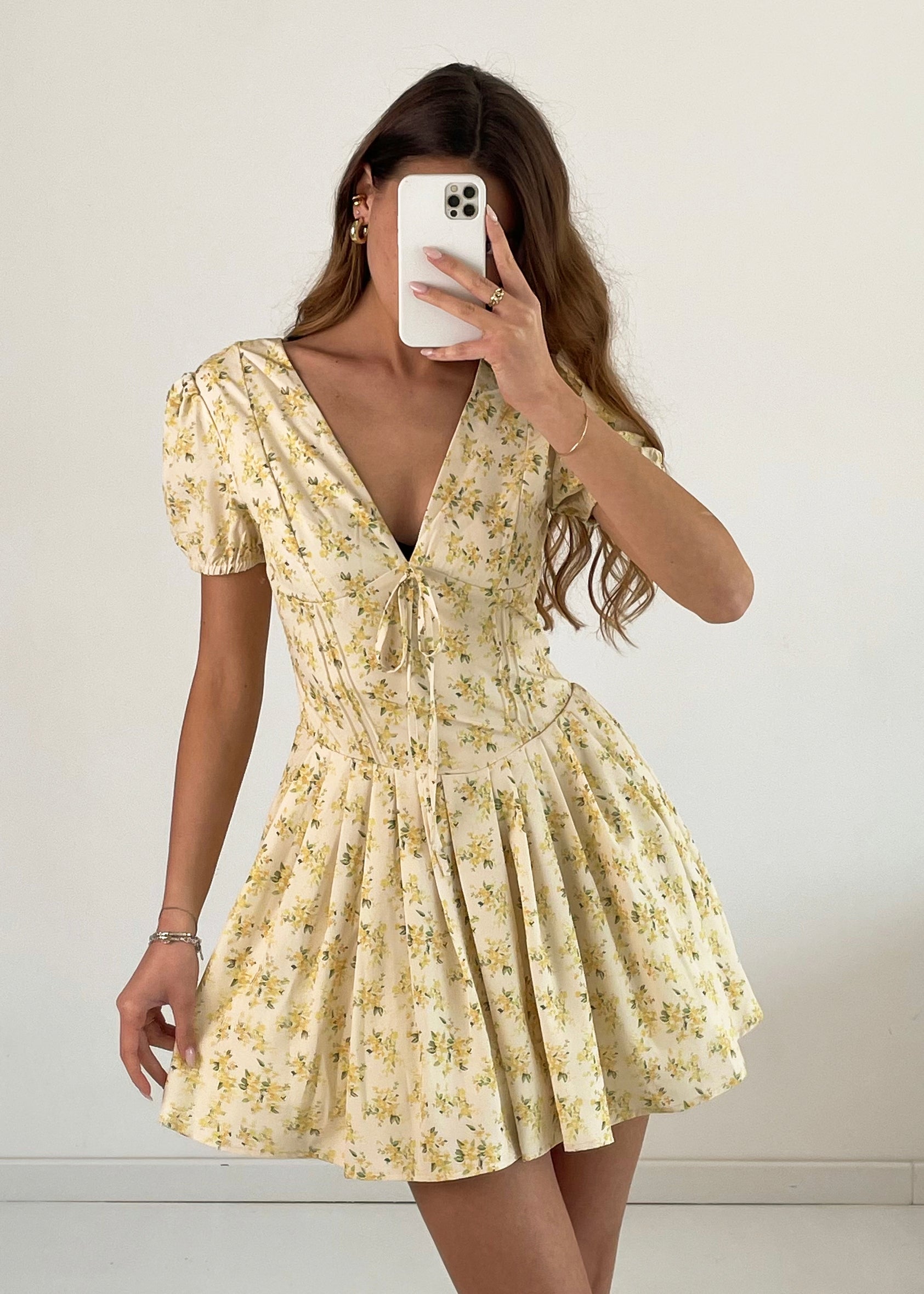 Romantik ve taze bir şıklık sunan Florence Korsajlı Mini Elbise, feminen ve neşeli tarzı sevenler için tasarlandı. Çiçek desenleriyle hareketlenen hafif kumaşı ve kloş etek kesimiyle bedeni zarifçe sararken, dinamik ve canlı bir görünüm kazandırır. Kısa balon kollar retro bir hava katarken, V yaka ve ön kısmındaki bağcık detayı romantik bir dokunuş sunar. Yaz aylarının enerjisini yansıtan bu parça, gündüzden akşam stiline kolaylıkla uyum sağlar.