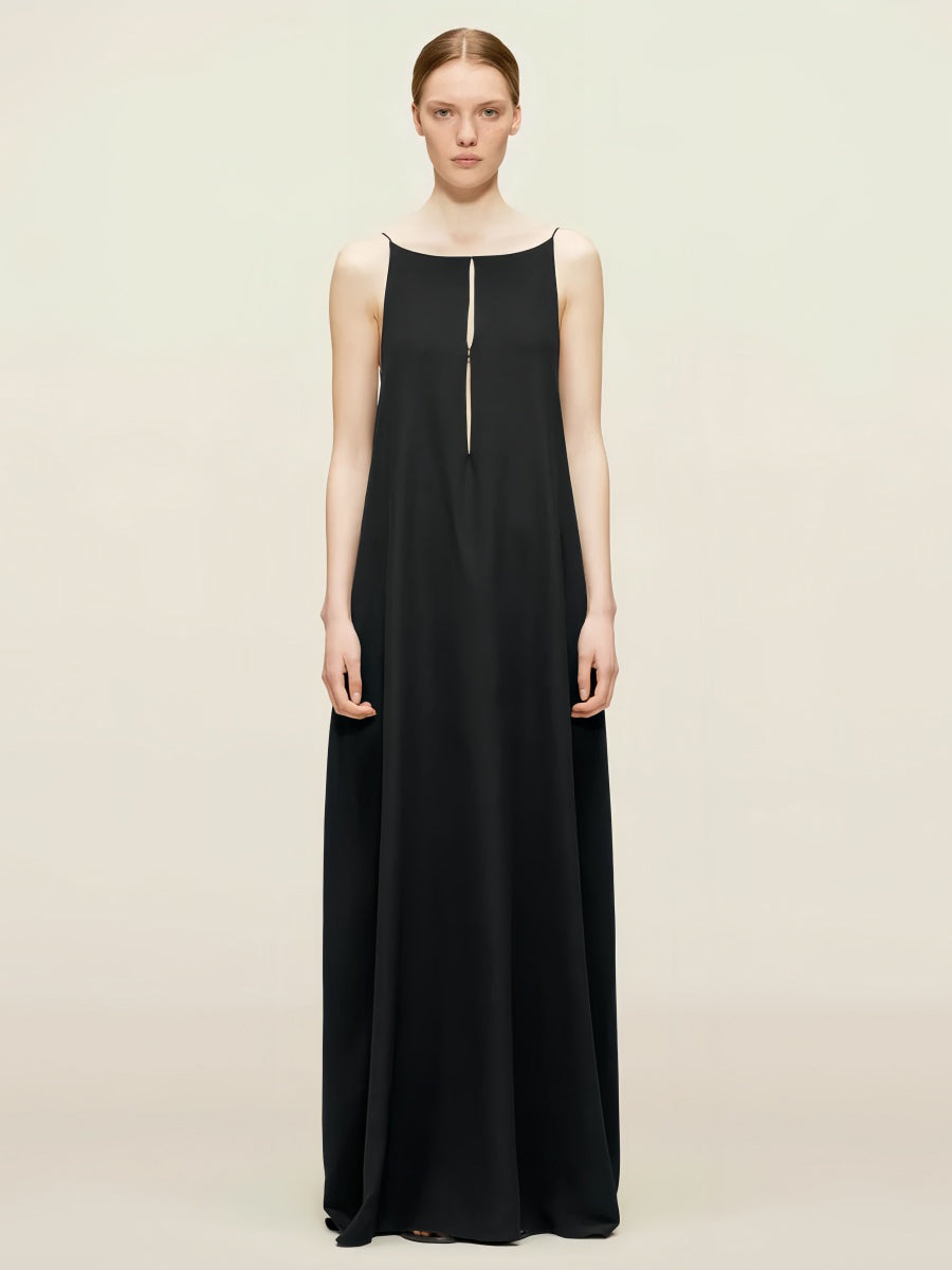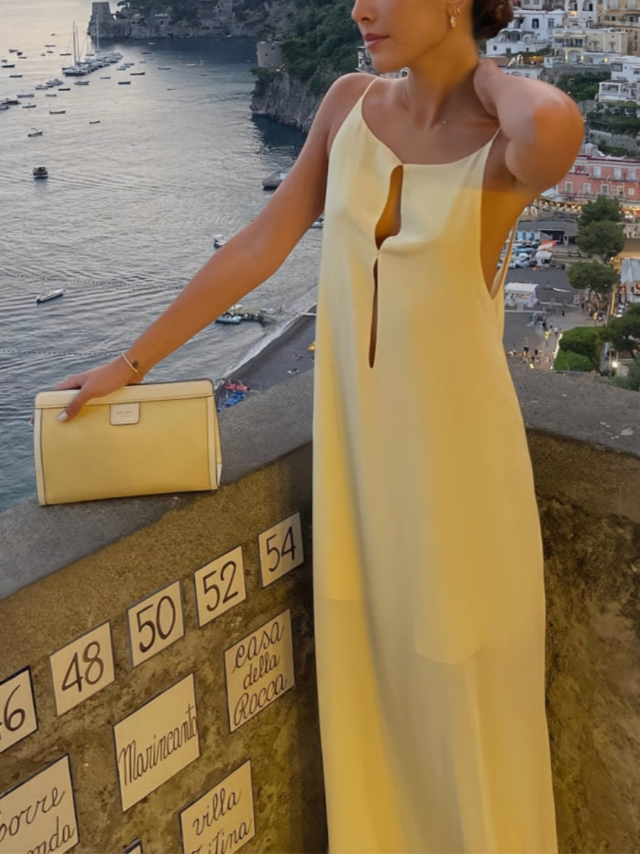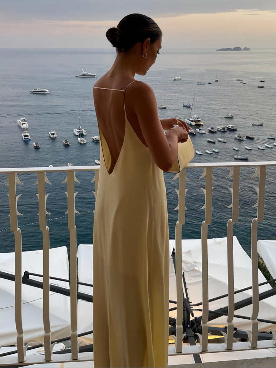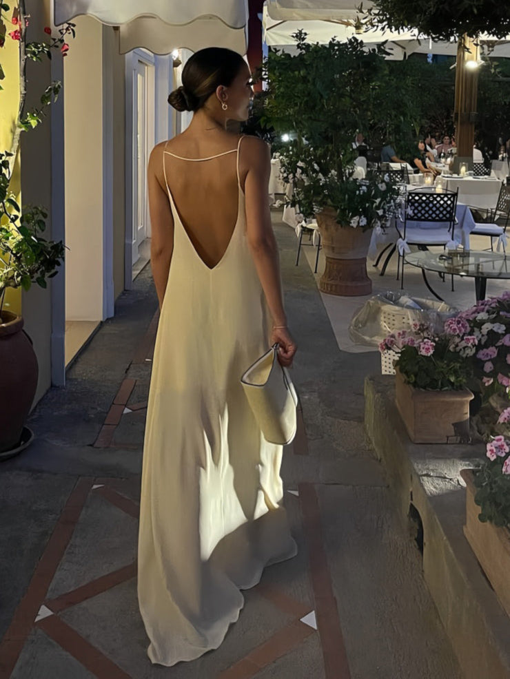 Flörtöz açık sırt tasarımı ve ince spaghetti askıları ile dikkat çeken bu maxi elbise, kendinizi özgüvenli ve çekici hissetmenizi sağlar. Gece dışarı çıkmalar veya özel etkinlikler için mükemmel bir seçim.