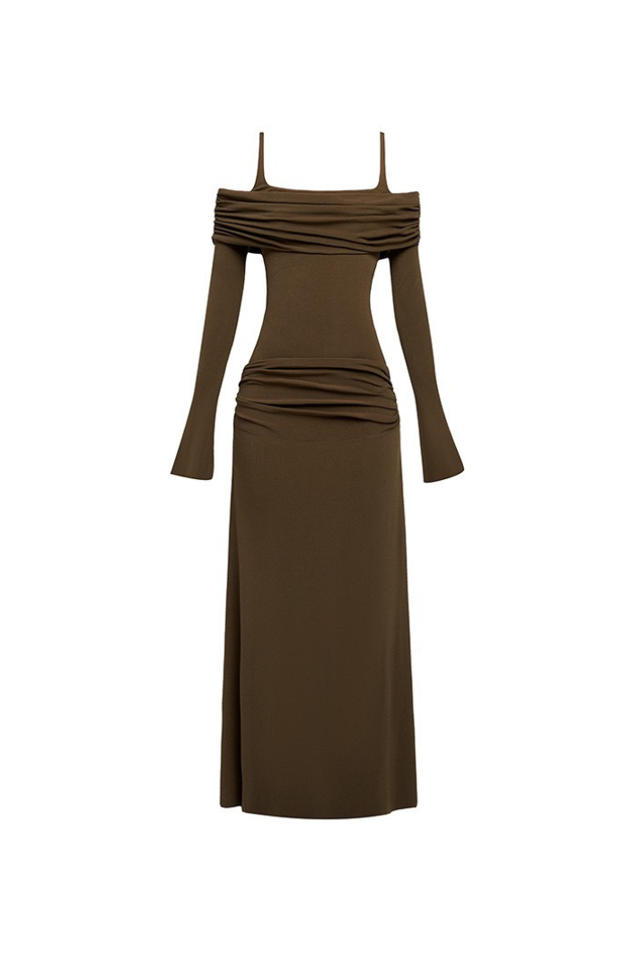Toprak tonlarının sıcaklığını zarif bir tasarımla buluşturan LUMERA Drapeli Kahverengi Uzun Elbise, gündüzden geceye stilinizi tamamlayacak özel bir parça. İnce kumaşı, büzgü detayları ve omuzsuz formu ile feminen bir görünüm kazandırırken; A kesim tasarımı ve flare kollarıyla hareket özgürlüğü sağlar.