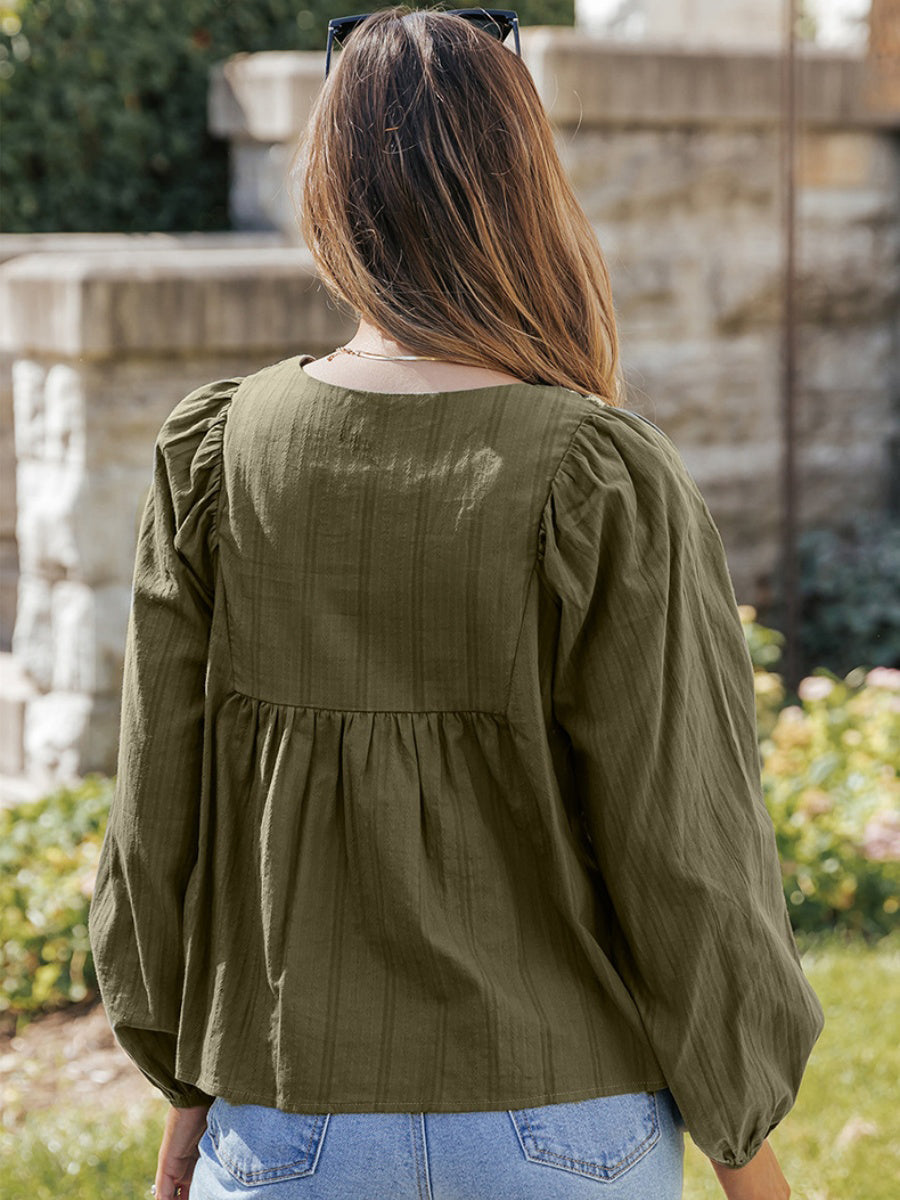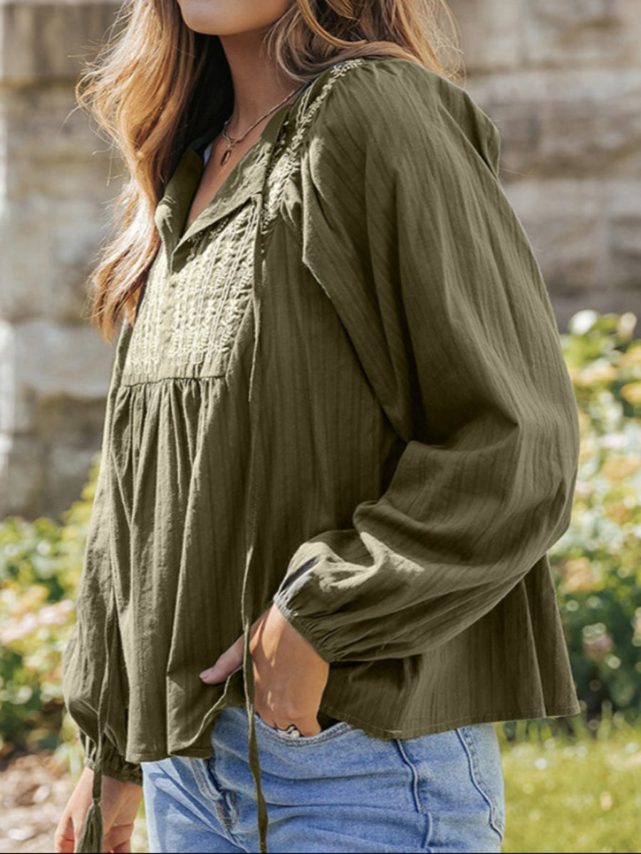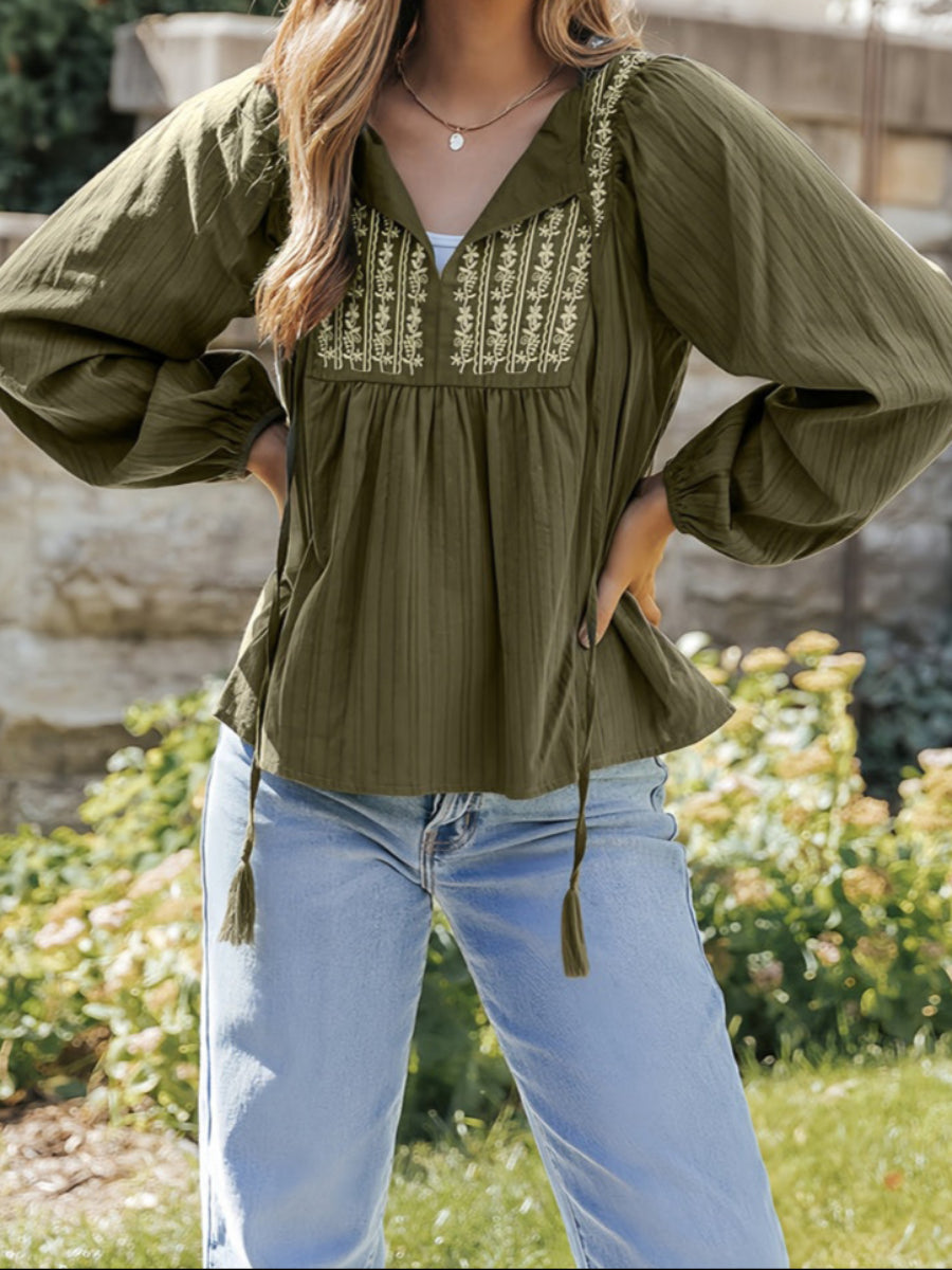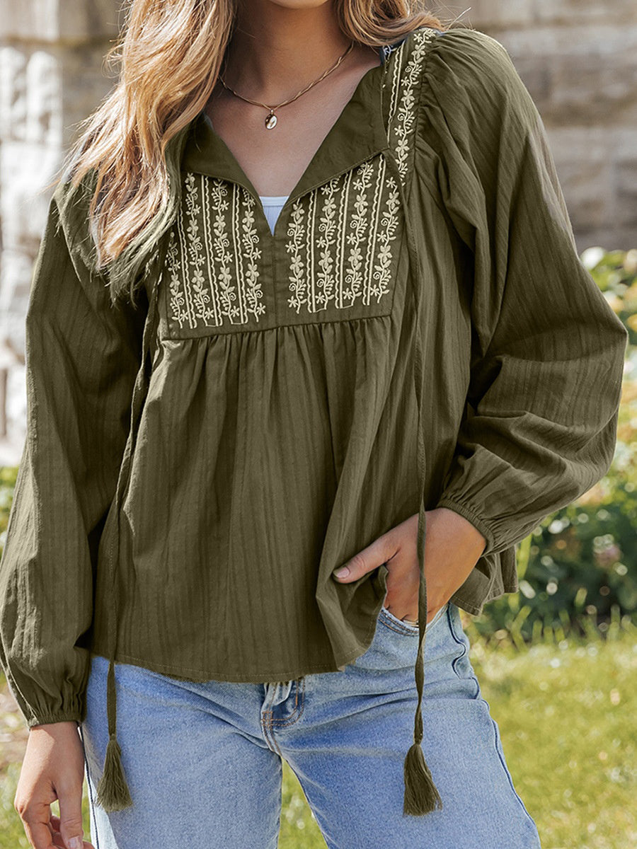 Zarif çiçek işlemeleri ve bağlamalı V yakasıyla romantik bir dokunuş sunan bu uzun kollu bluz, hafif pamuklu kumaşıyla konforlu ve nefes alabilir bir kullanım sağlar. Günlükten tatil stiline şıklık katan tercih.