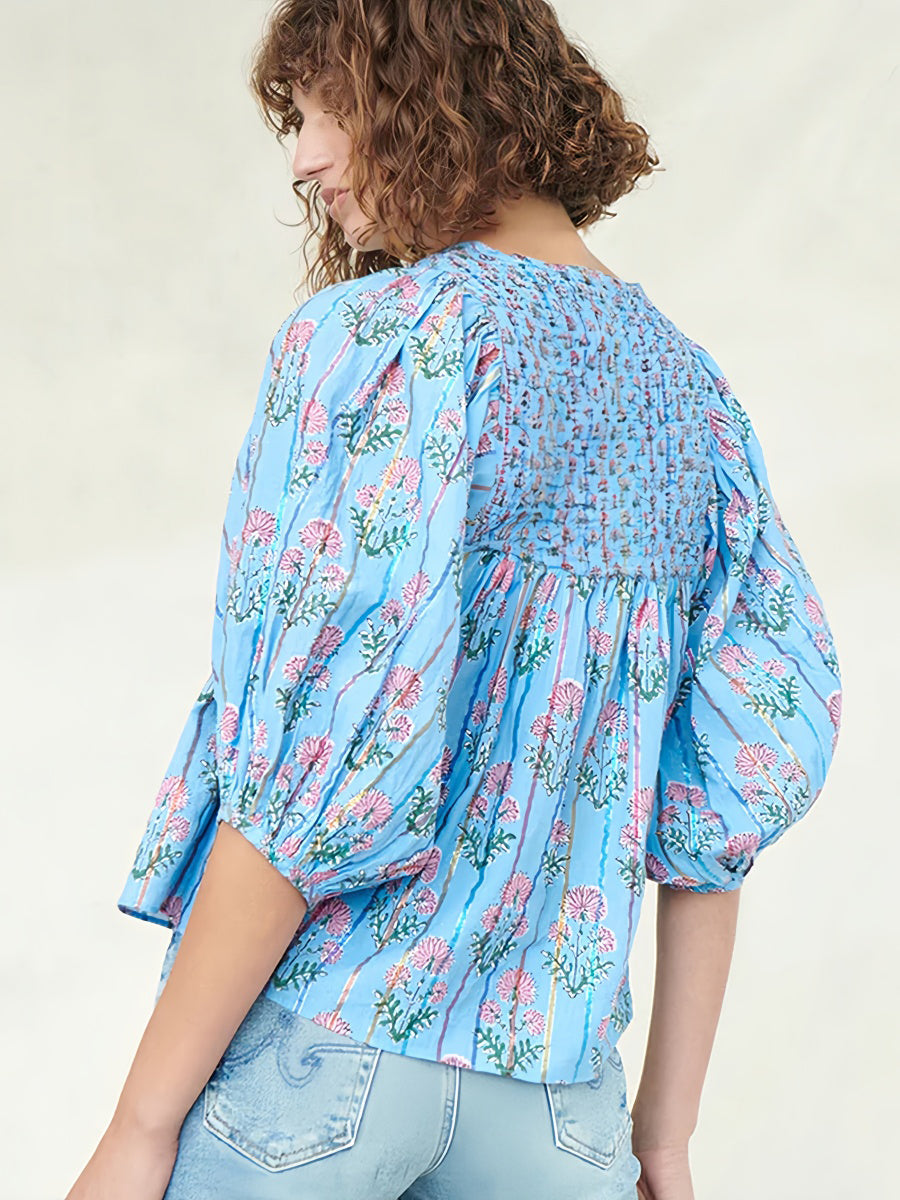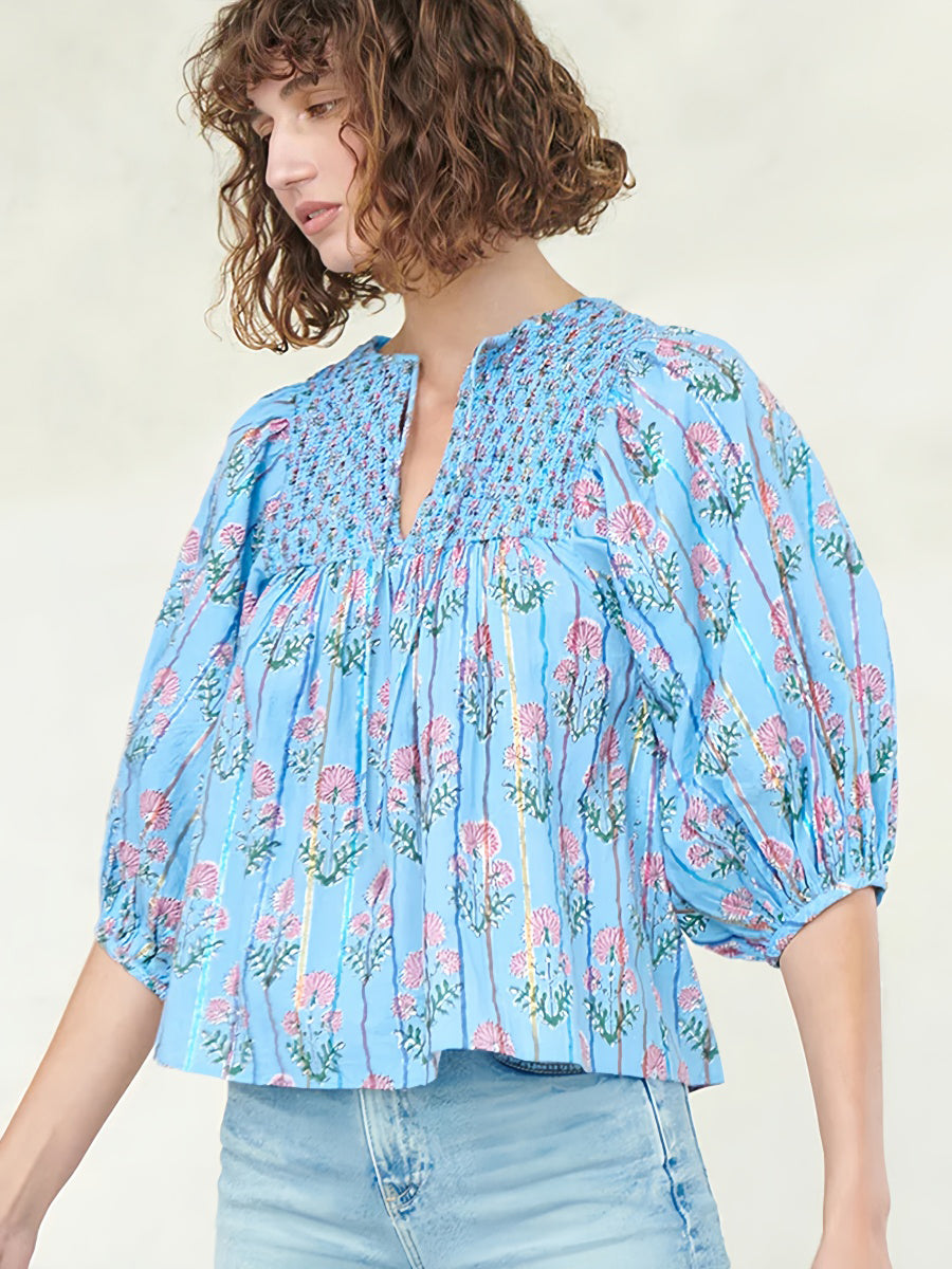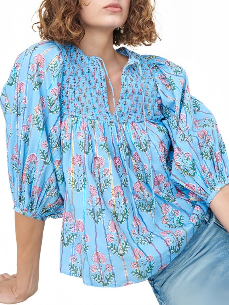 Enerjik çiçek desenleri ve bağlamalı V yaka tasarımıyla öne çıkan bu yarım balon kollu bluz, oversize kesimiyle konfor ve şıklığı bir arada sunar. Günlük kullanımdan tatil günlerine kadar stilinize neşe katar.
