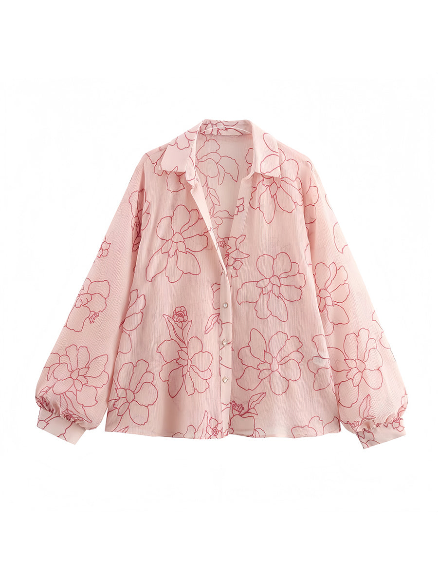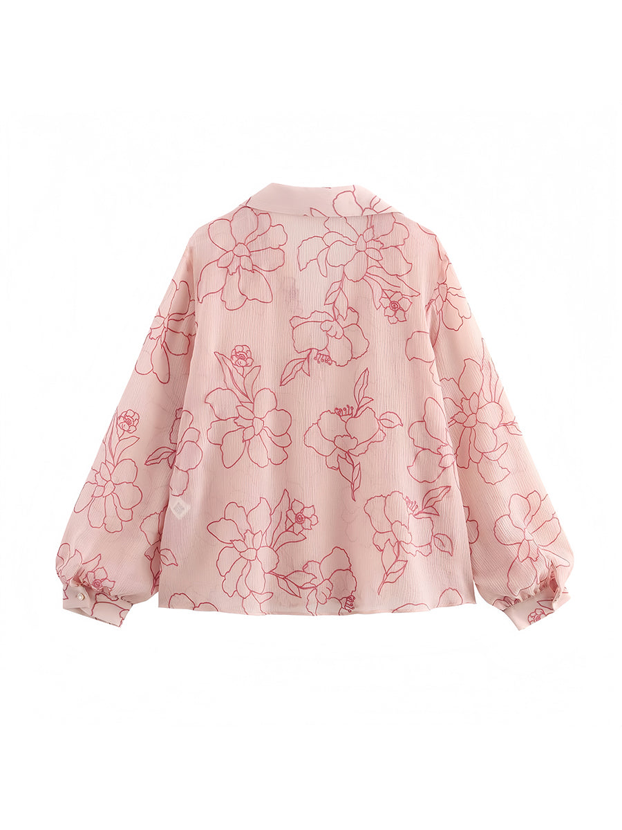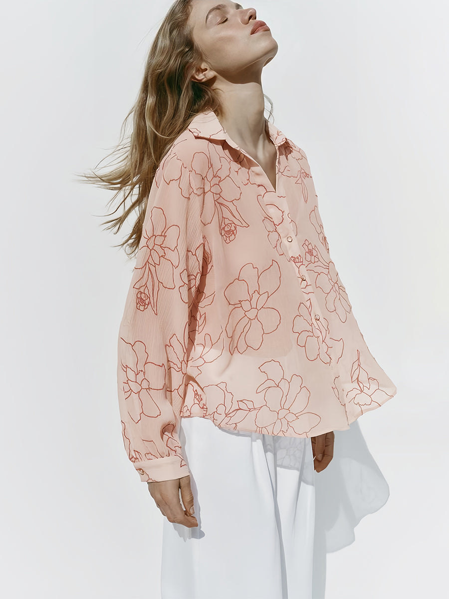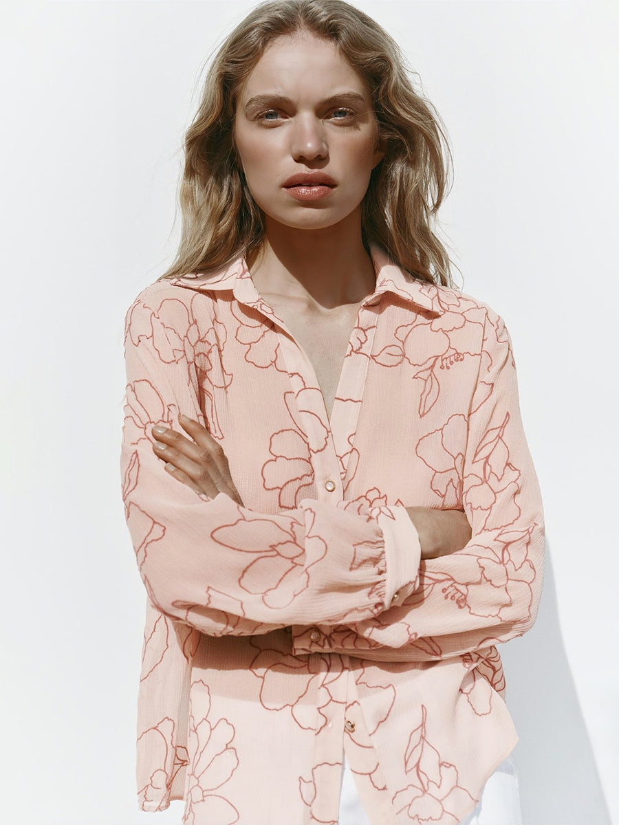 İnci düğme detayları ve enerjik çiçek desenleriyle bu pembe gömlek, her kombine feminen ve neşeli bir dokunuş katar. Hafif kumaşı ve uzun balon kollarıyla tüm mevsimlere uyum sağlar. Oversize kesimiyle konforlu bir şıklık sunar.