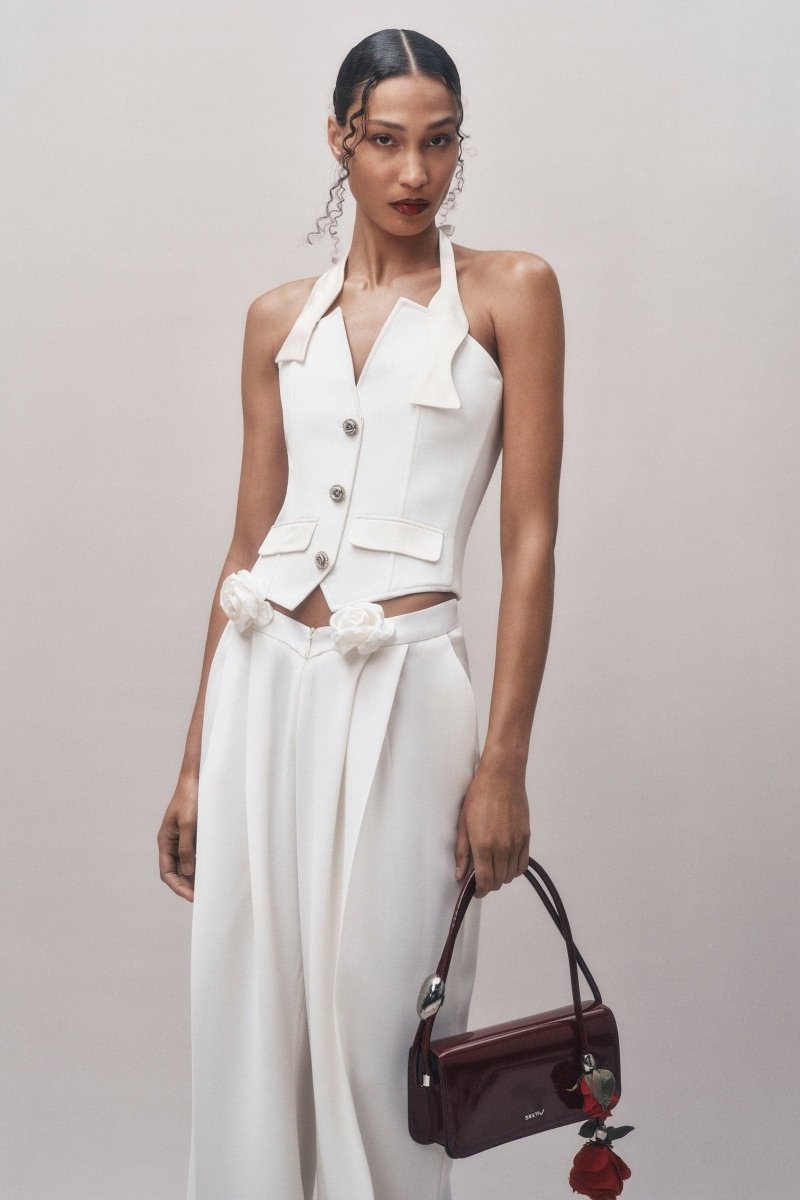 Bu zarif alt-üst takım, sofistike V yakası ve açık sırt tasarımıyla romantik bir hava sunar. Üstteki süslemeli güllü düğmeler ve ipek güller detayları takıma özel bir dokunuş katarken, çıkarılabilir bel bandı farklı stiller yaratmanızı sağlar. Hafif esnek kumaş, vücuda tam oturarak şıklık ve rahatlığı bir arada sunar. Özel günlerinizde topuklu ayakkabılar ve zarif aksesuarlarla tamamlayarak büyüleyici bir görünüm elde edebilirsiniz.