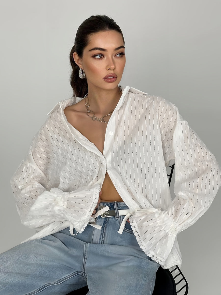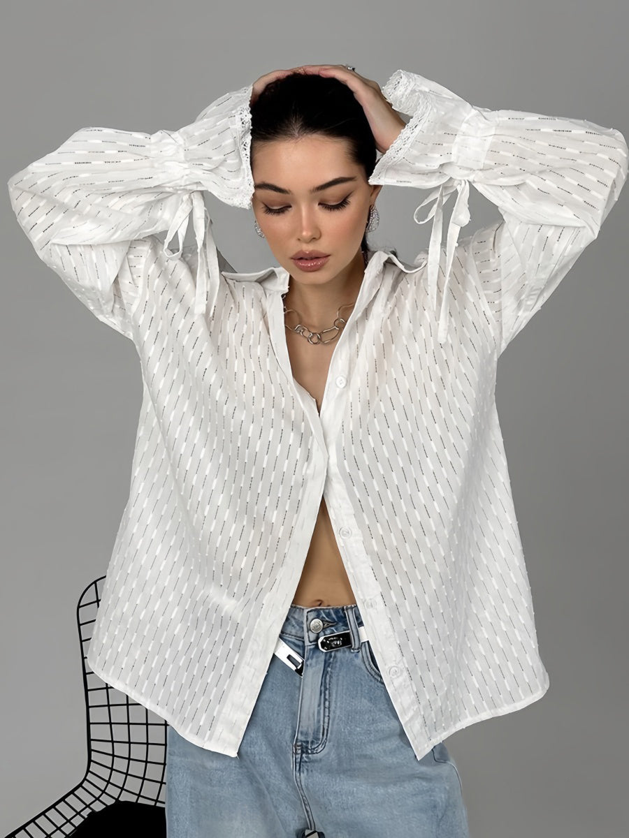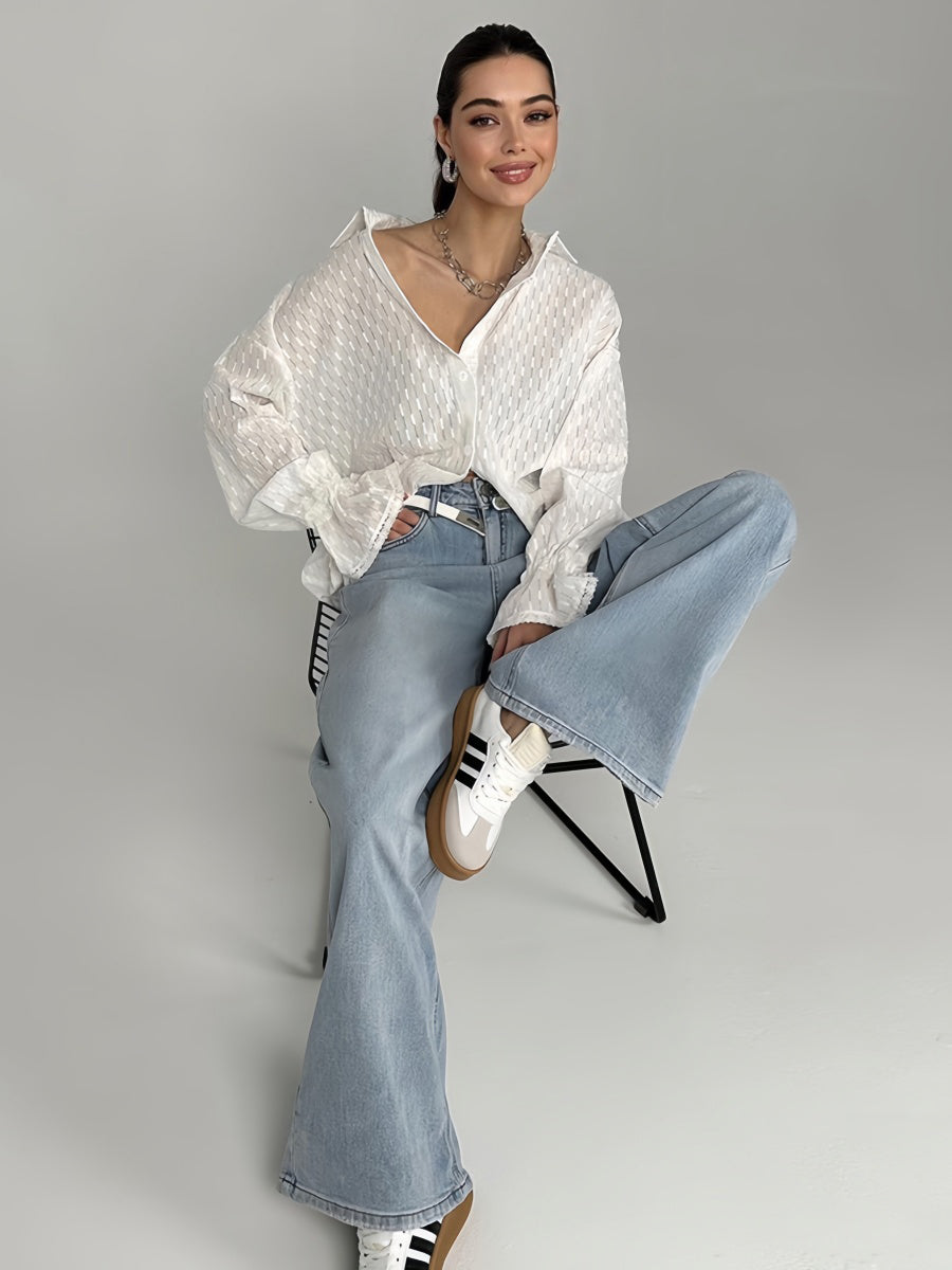 Tek renk ve ajur detaylarıyla öne çıkan bu uzun kollu çan kol gömlek, şık ve rahat bir stil sunar. Oversize kesimi sayesinde gün boyu konforlu kullanım sağlar. Günlük, ofis ve şık kombinler için ideal.