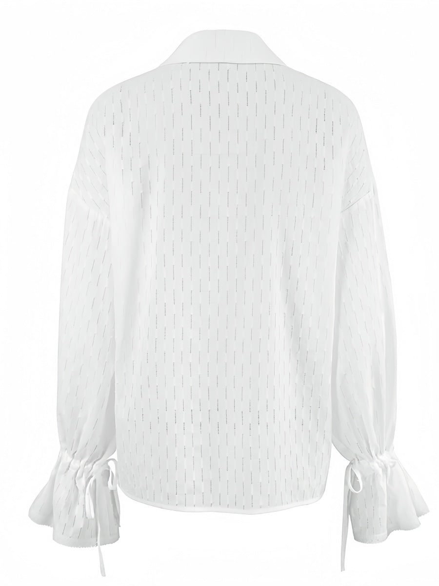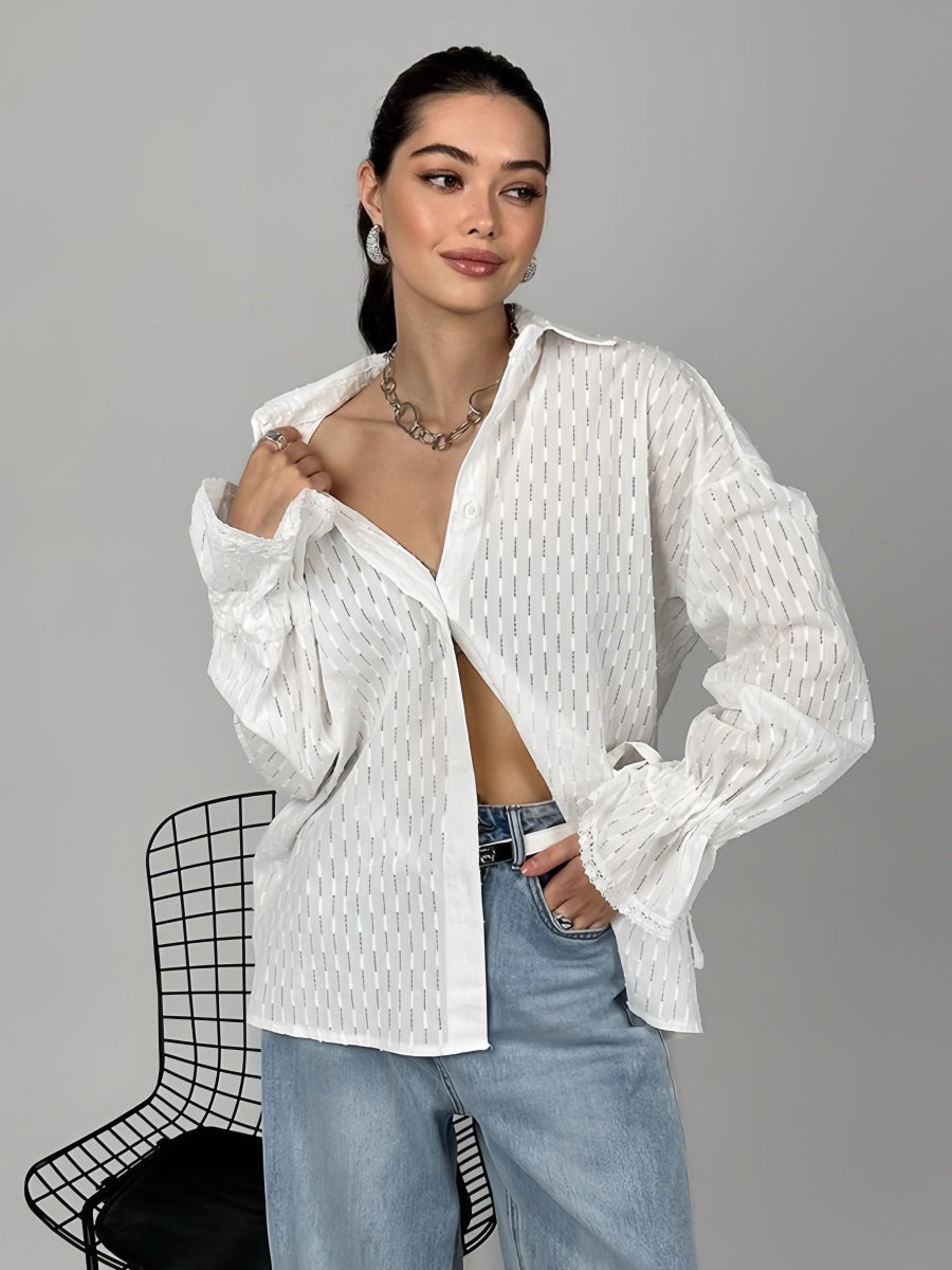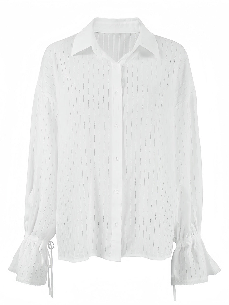 Tek renk ve ajur detaylarıyla öne çıkan bu uzun kollu çan kol gömlek, şık ve rahat bir stil sunar. Oversize kesimi sayesinde gün boyu konforlu kullanım sağlar. Günlük, ofis ve şık kombinler için ideal.