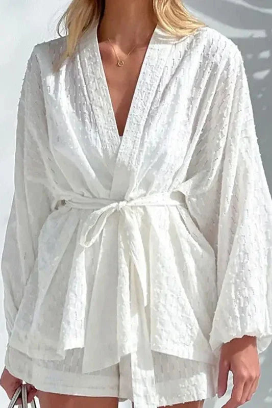 Beyaz Jakarlı Bel Detaylı İkili Takım