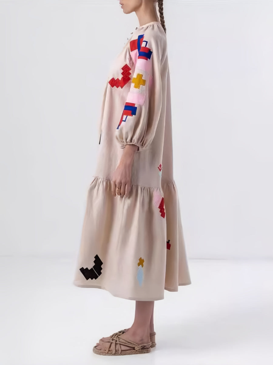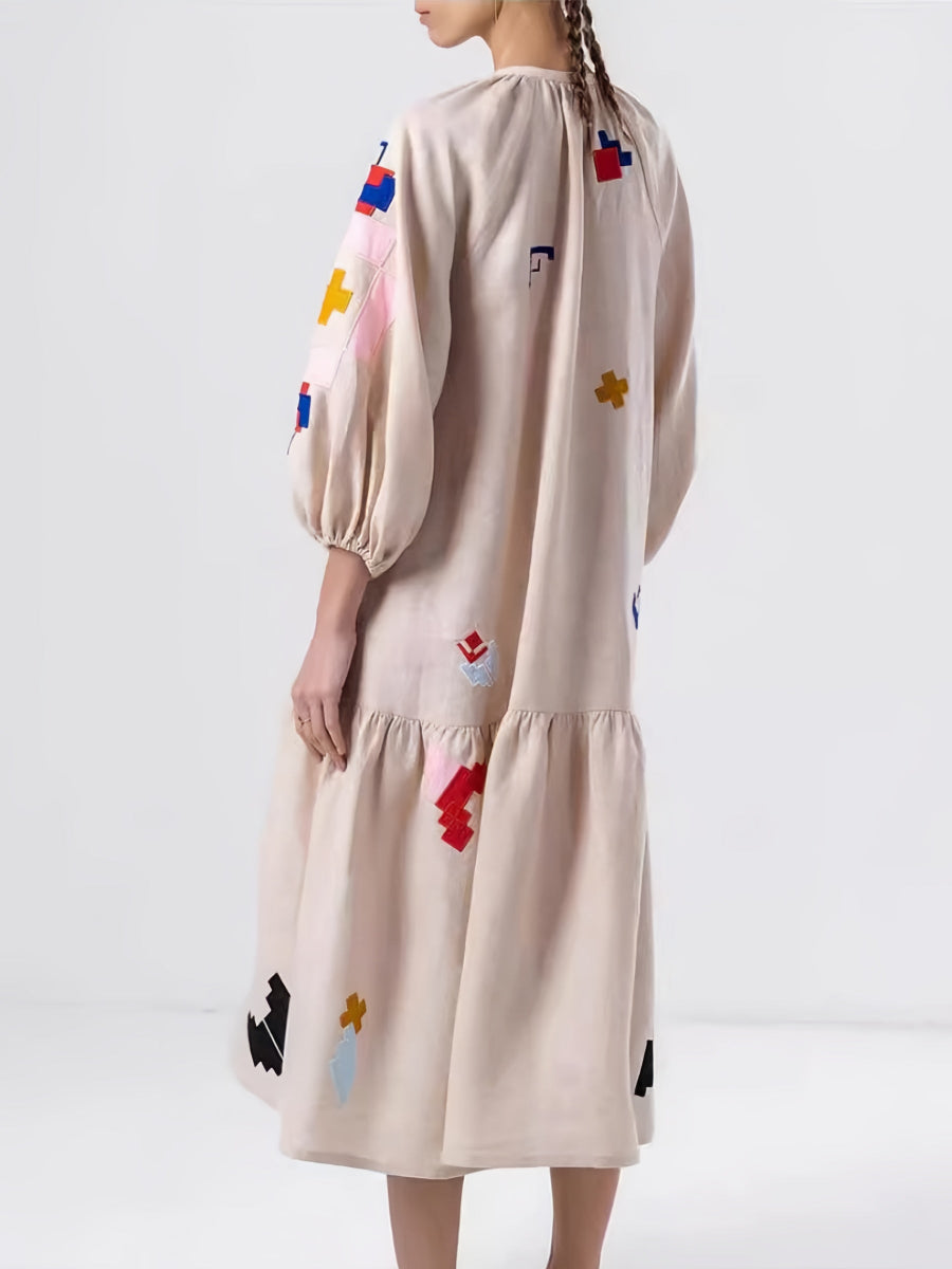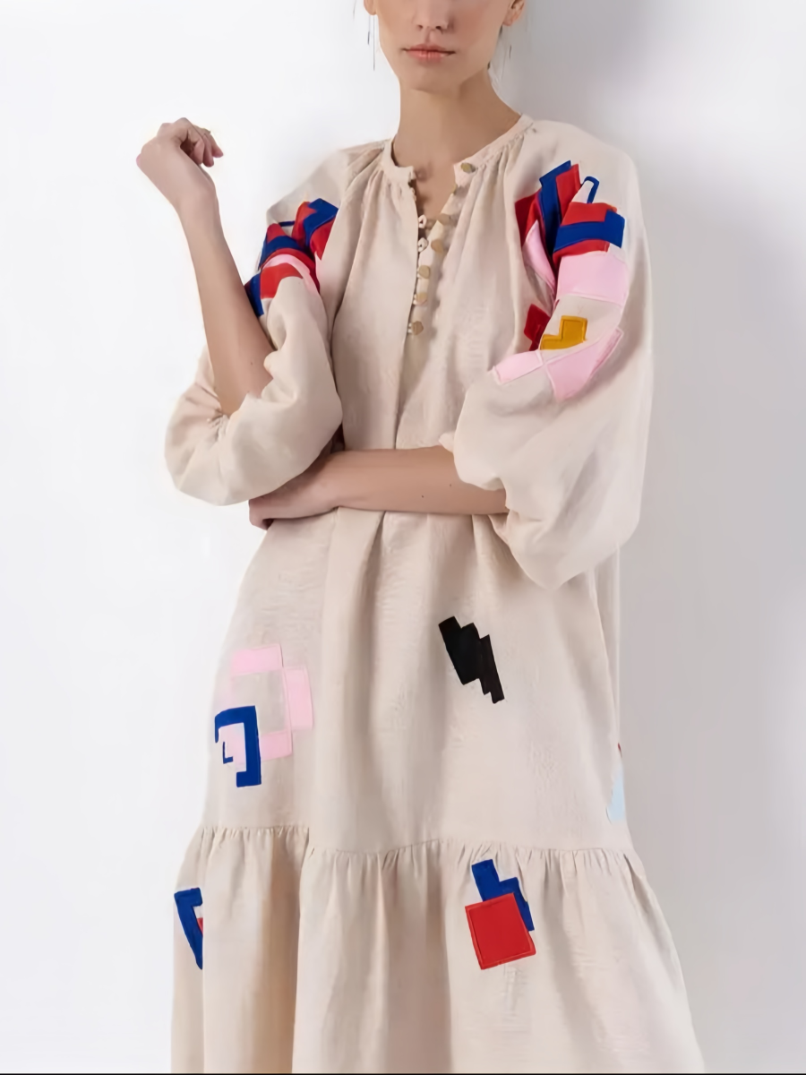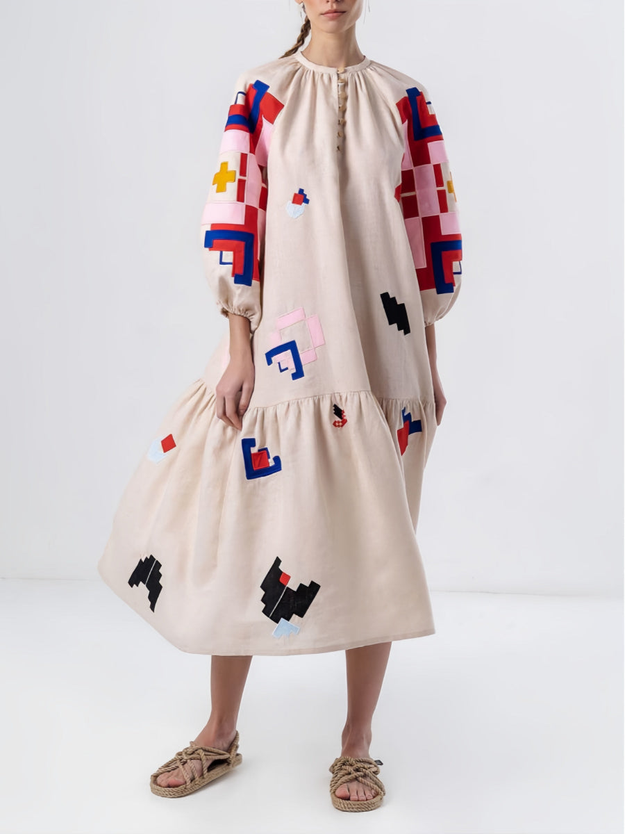 Yumuşak dokusu, balon kolları ve rahat kesimiyle öne çıkan bu midi elbise; geometrik desenleriyle enerjik ve özgün bir tarz sunar. Günlük şıklığı konforla buluşturmak isteyenler için ideal.