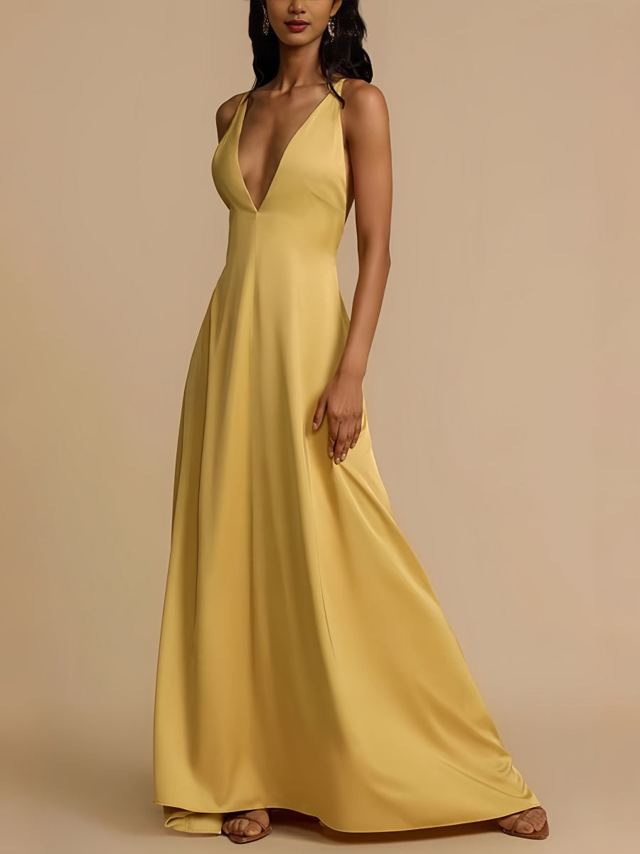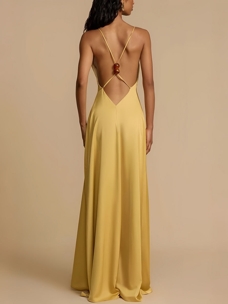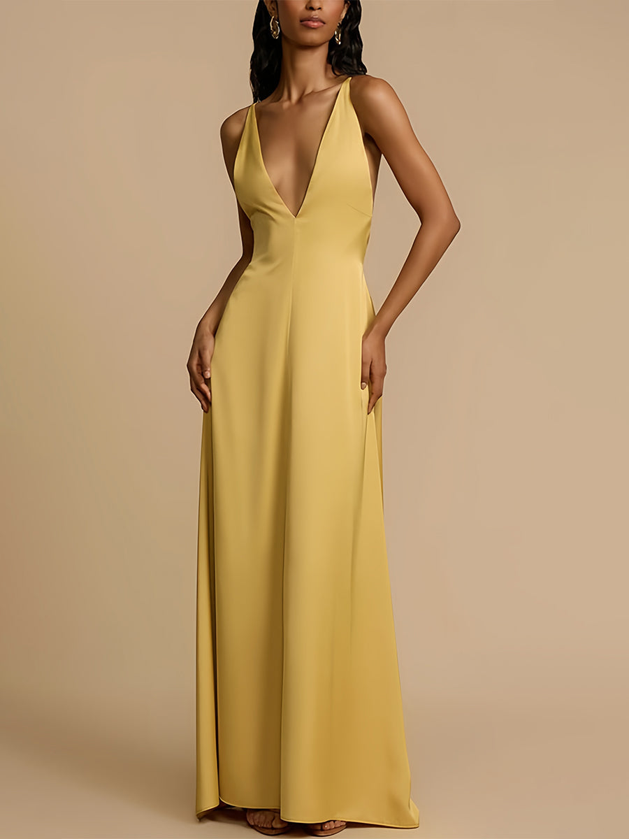 Tarzınızı, Düz V Yaka Açık Sırt Maxi Elbisemizle yükseltin. Bu göz alıcı, yere kadar uzanan siluet; dekoltenizi ön plana çıkaran zarif bir V yaka ve dramatik bir dokunuş katan açık sırt tasarımıyla tamamlanıyor. Resmi davetler, yaz partileri veya romantik akşamlar için mükemmel.