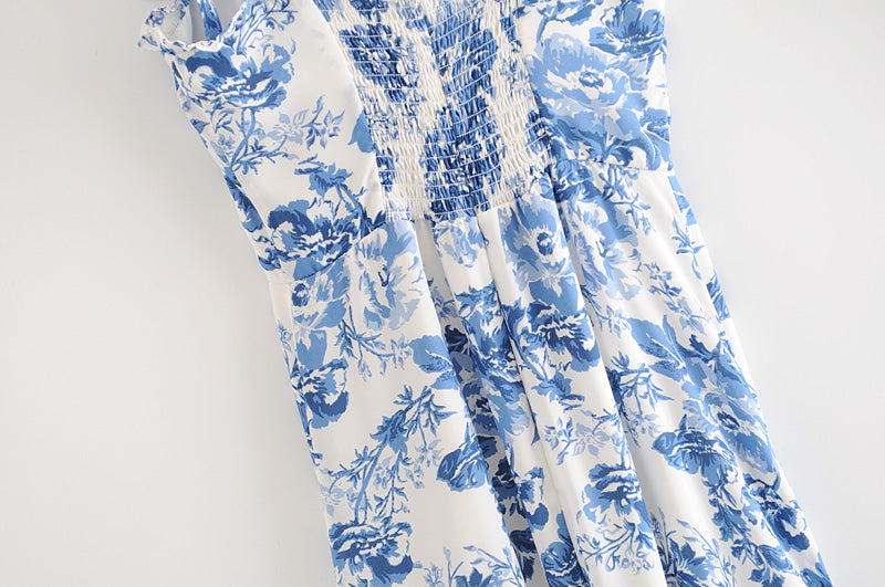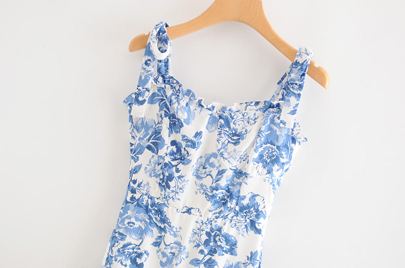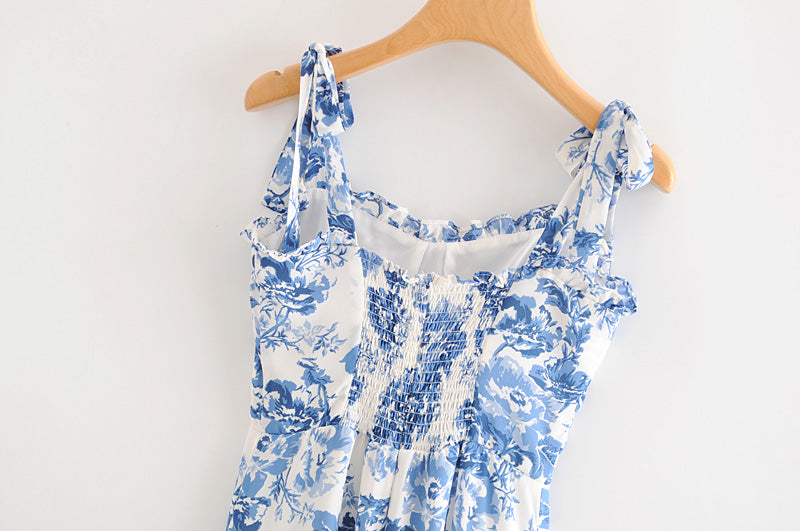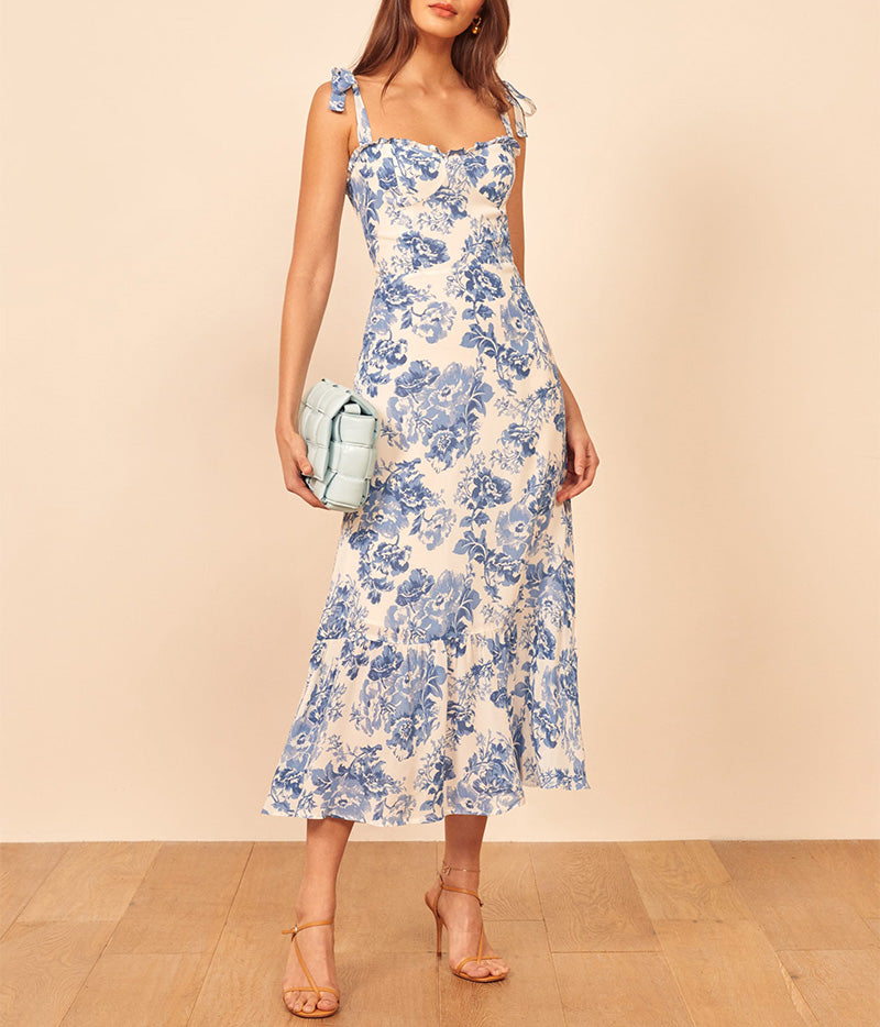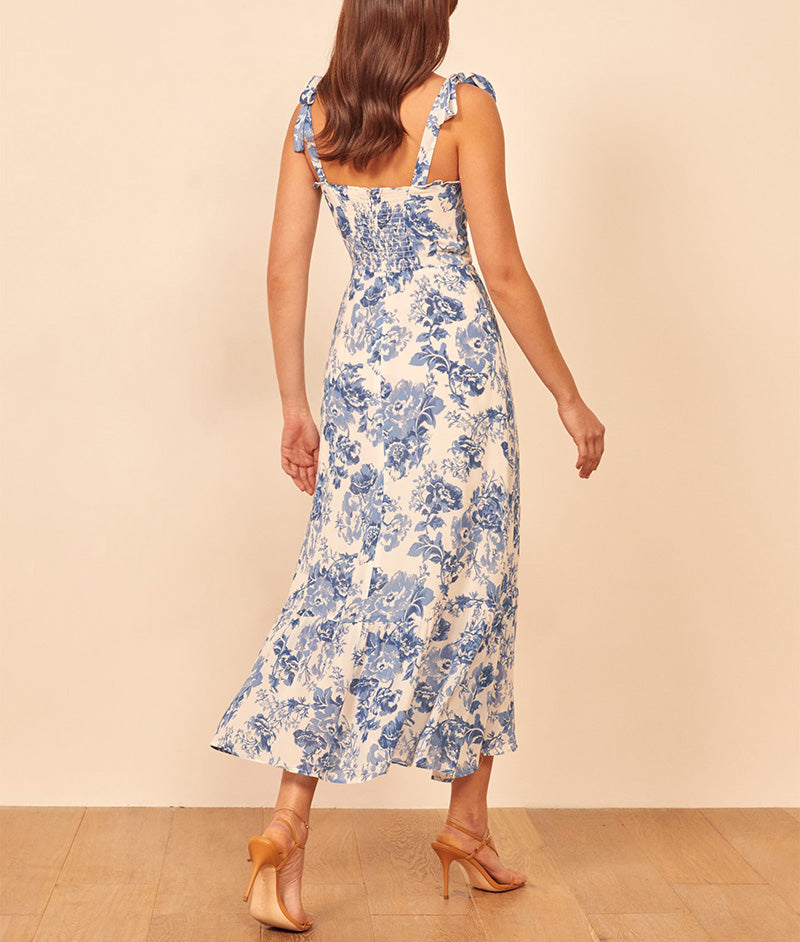 Kalp yaka ve fırfır detayları elbiseye romantik bir hava katarken, ayarlanabilir askılar ve smock detaylı gövde şık bir uyum sağlar. Arkadaki gizli fermuar kapatma ile rahatça giyilebilir. Fırfırlı etek ucu midi boy kesimle birleşerek modern ve zarif bir siluet oluşturur.