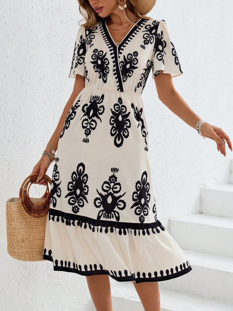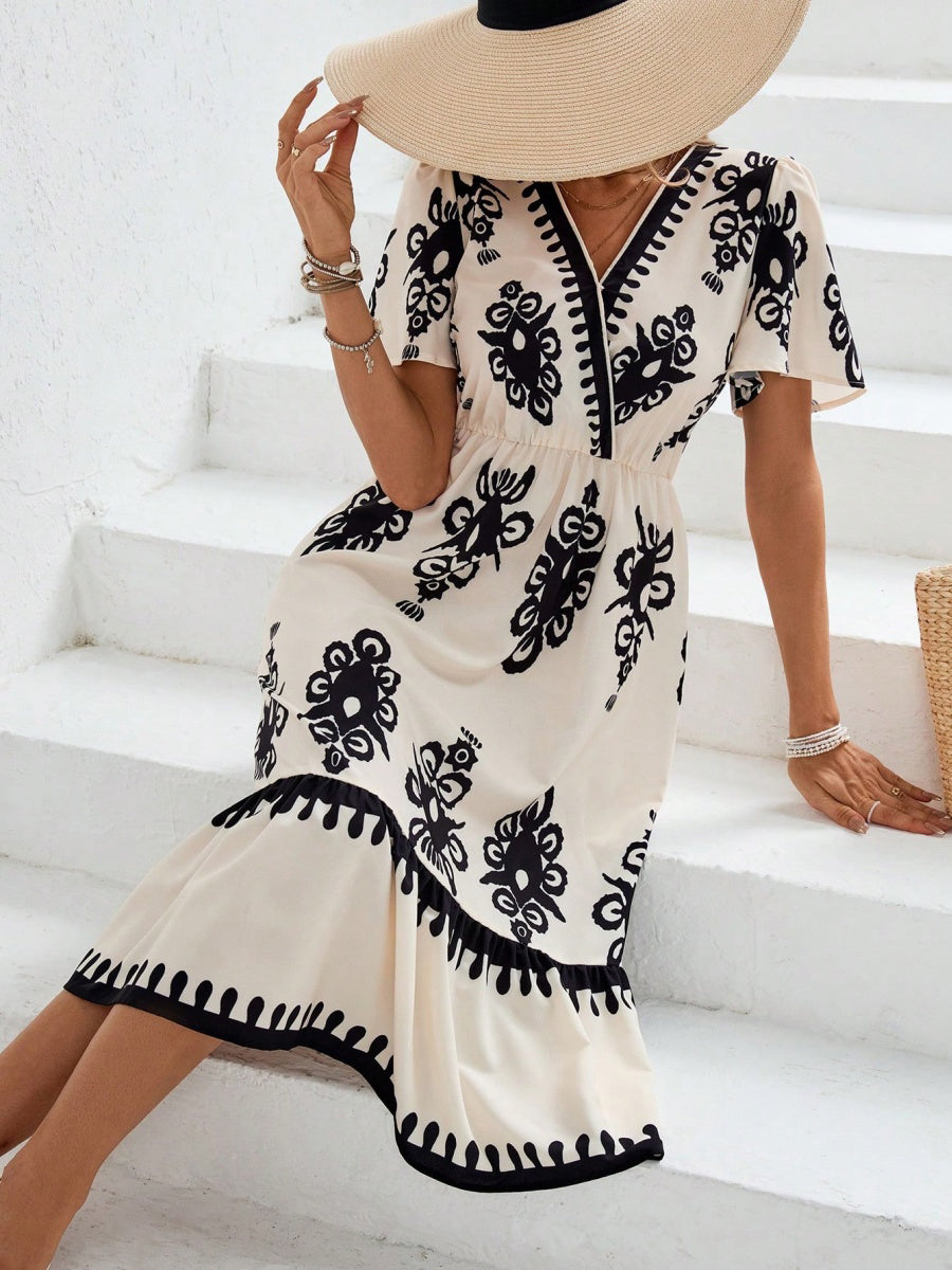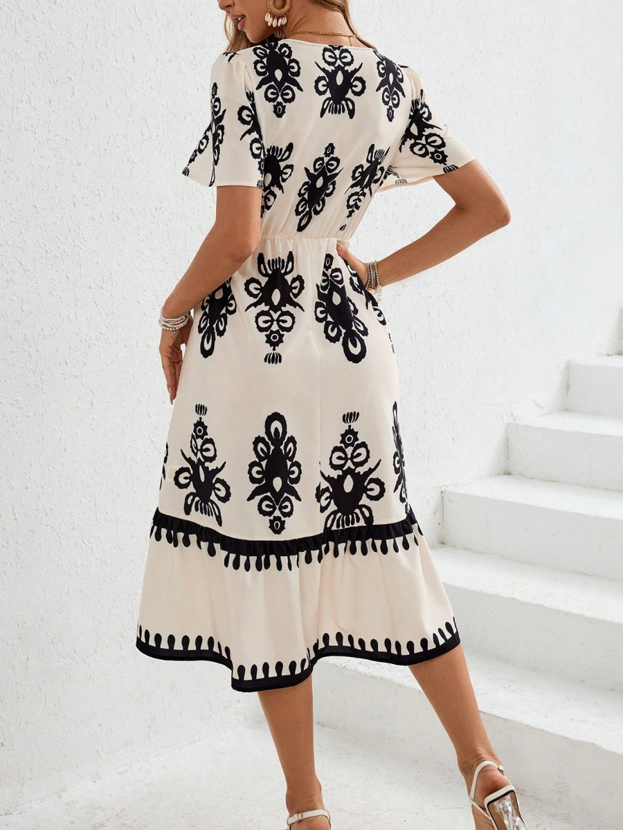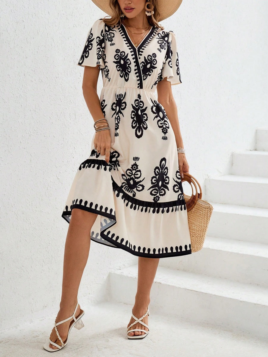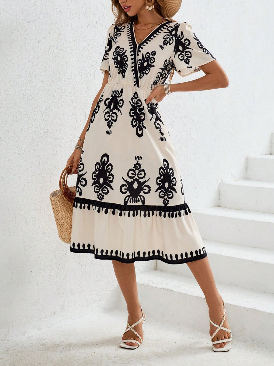 Zarif vintage desenleri ve sarmal V yaka tasarımıyla öne çıkan bu midi elbise, gündüz şıklığından akşam davetlerine kadar birçok ortama uyum sağlar. Hem feminen hem rahat bir duruş için gardırobunuzun vazgeçilmez parçası olmaya aday.