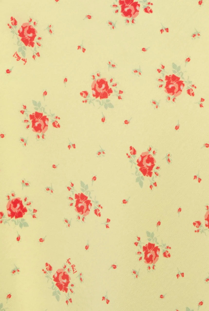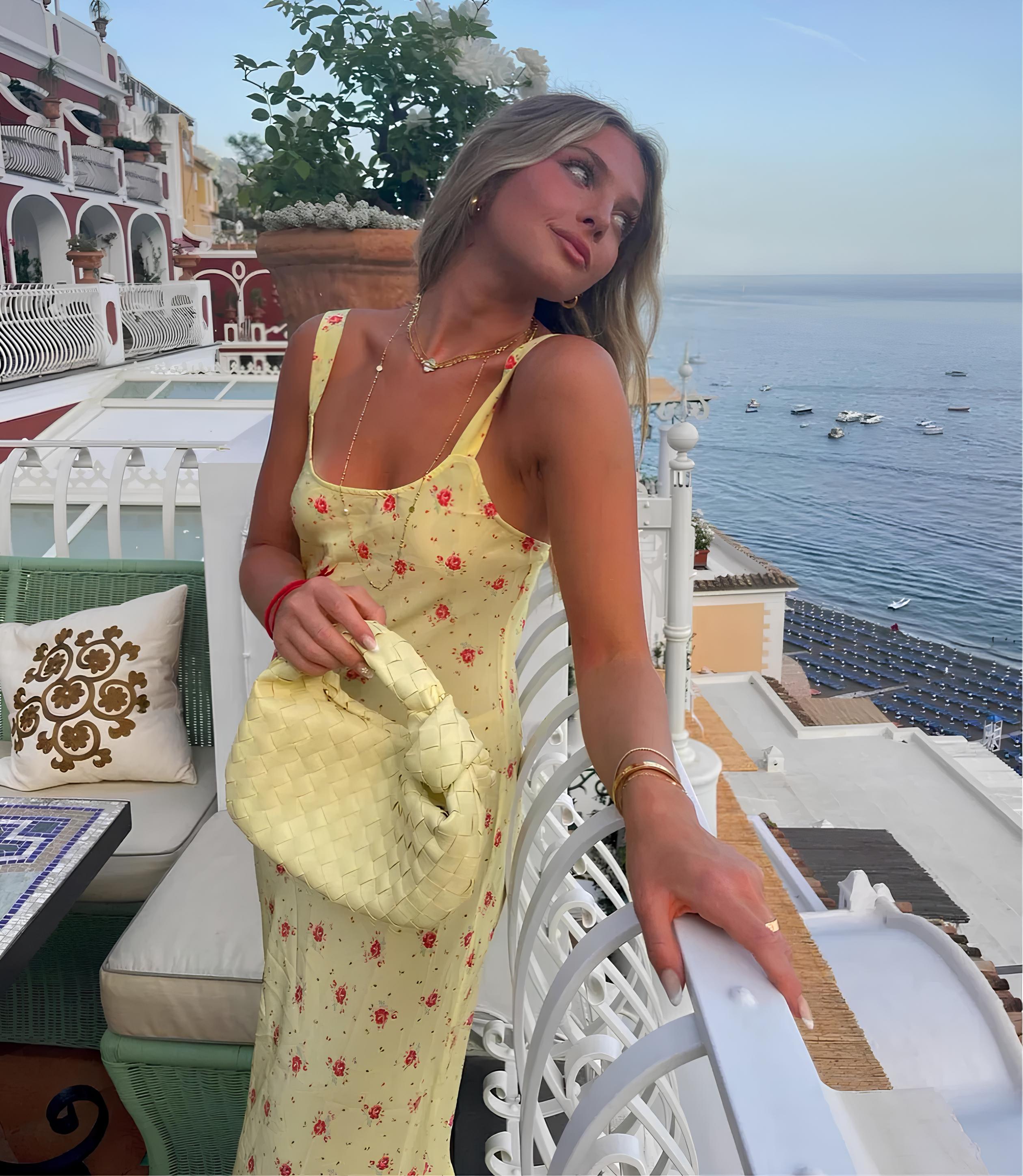 Balenli görünüm kazandıran balık kuyruğu formundaki etek ucu, yürürken akıcı bir hareket yaratırken, ince askılı tasarımı omuzları şık bir şekilde ön plana çıkarıyor. Hafif transparan yapısı ve özel sarı-pembe floral deseni, elbiseyi benzersiz kılıyor.