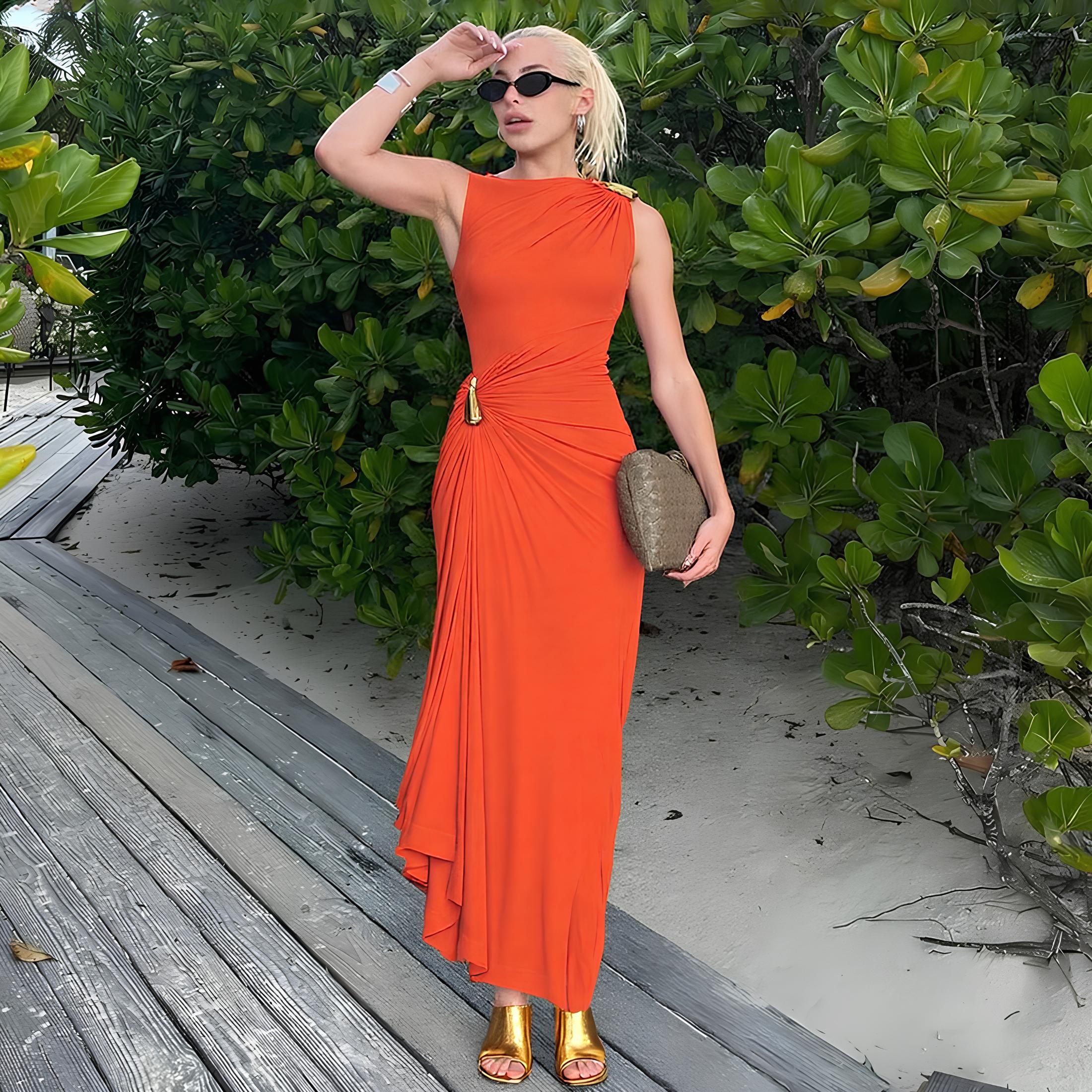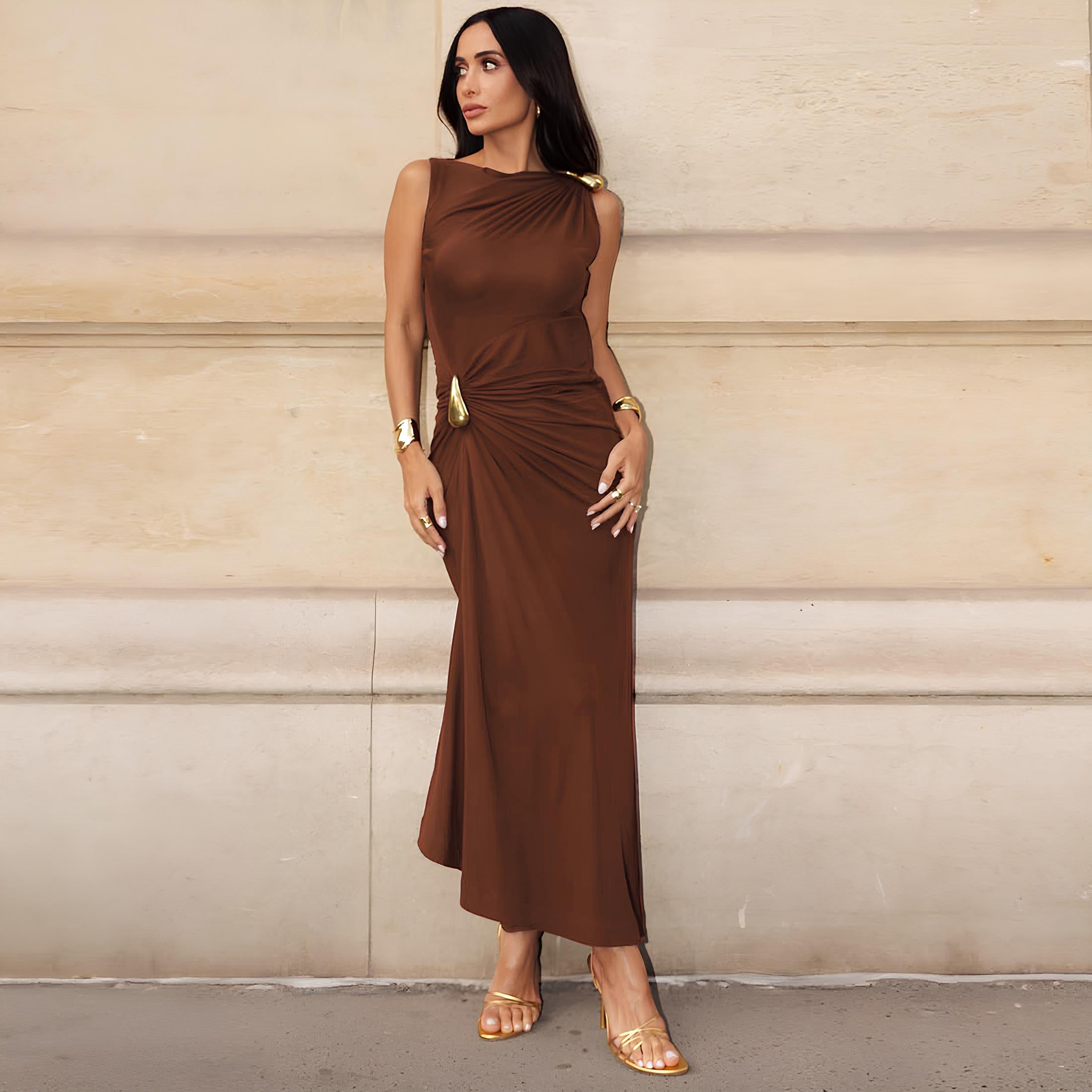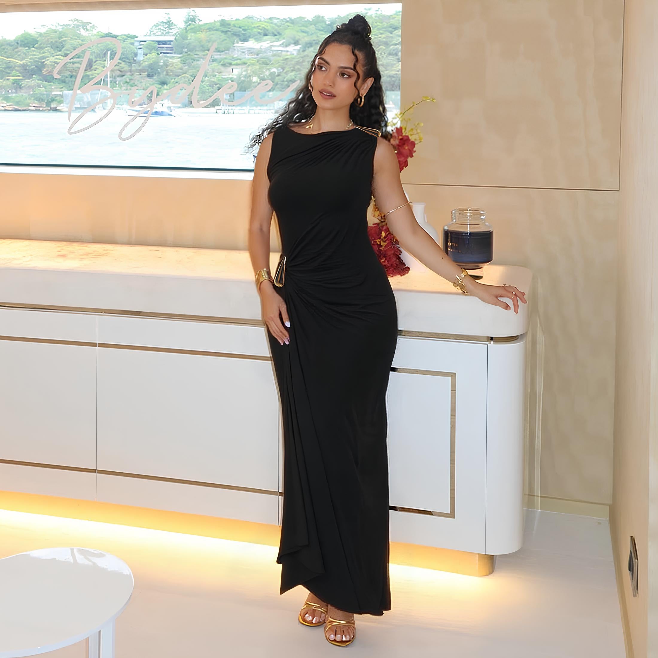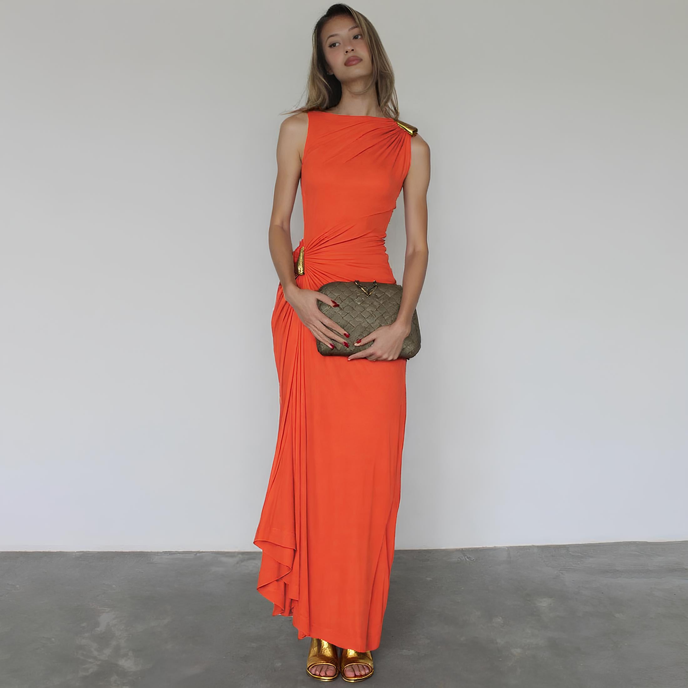 Modern şıklığın ve zarif silüetin buluştuğu Klio, özel davetlerden gece partilerine kadar iddialı bir stil sunar. Yuvarlak yaka ve kolsuz tasarımıyla minimal bir duruş sergilerken, yanlardaki drape (büzgü) detayları vücudu kusursuz şekilde sarar. Metalik geçiş detaylarıyla ışığı yansıtarak sofistike bir ışıltı katar.