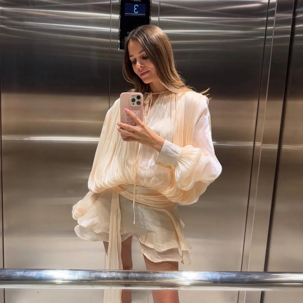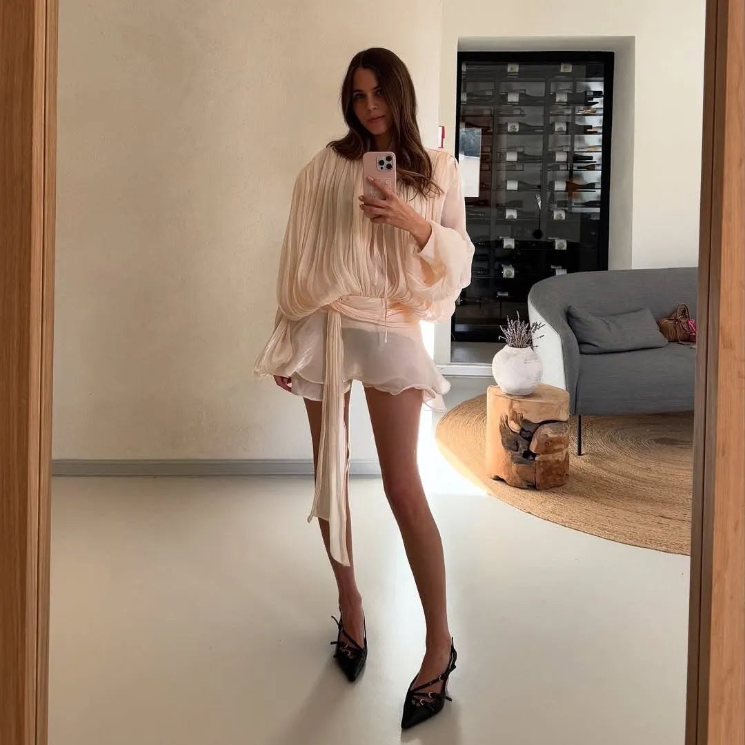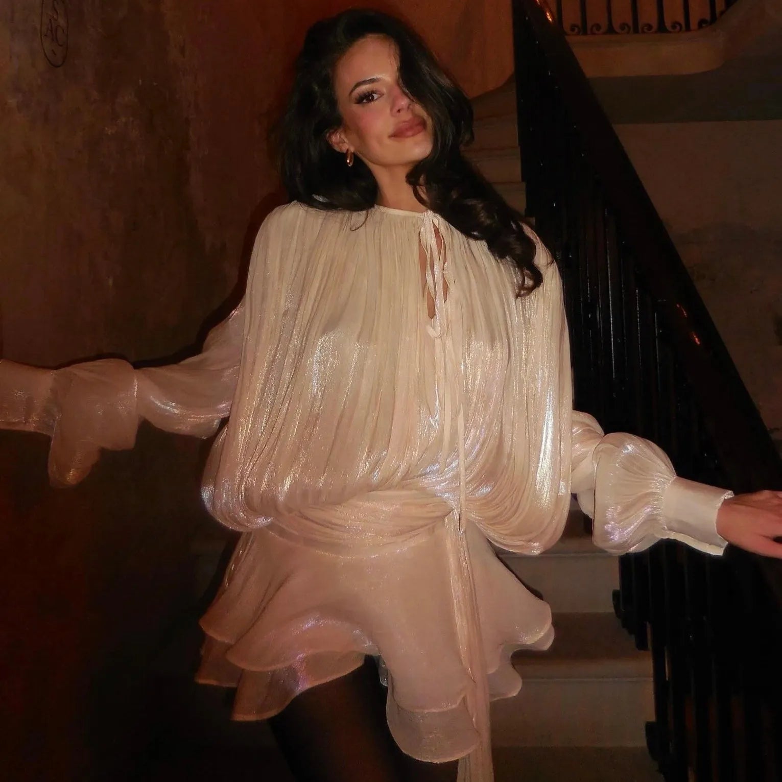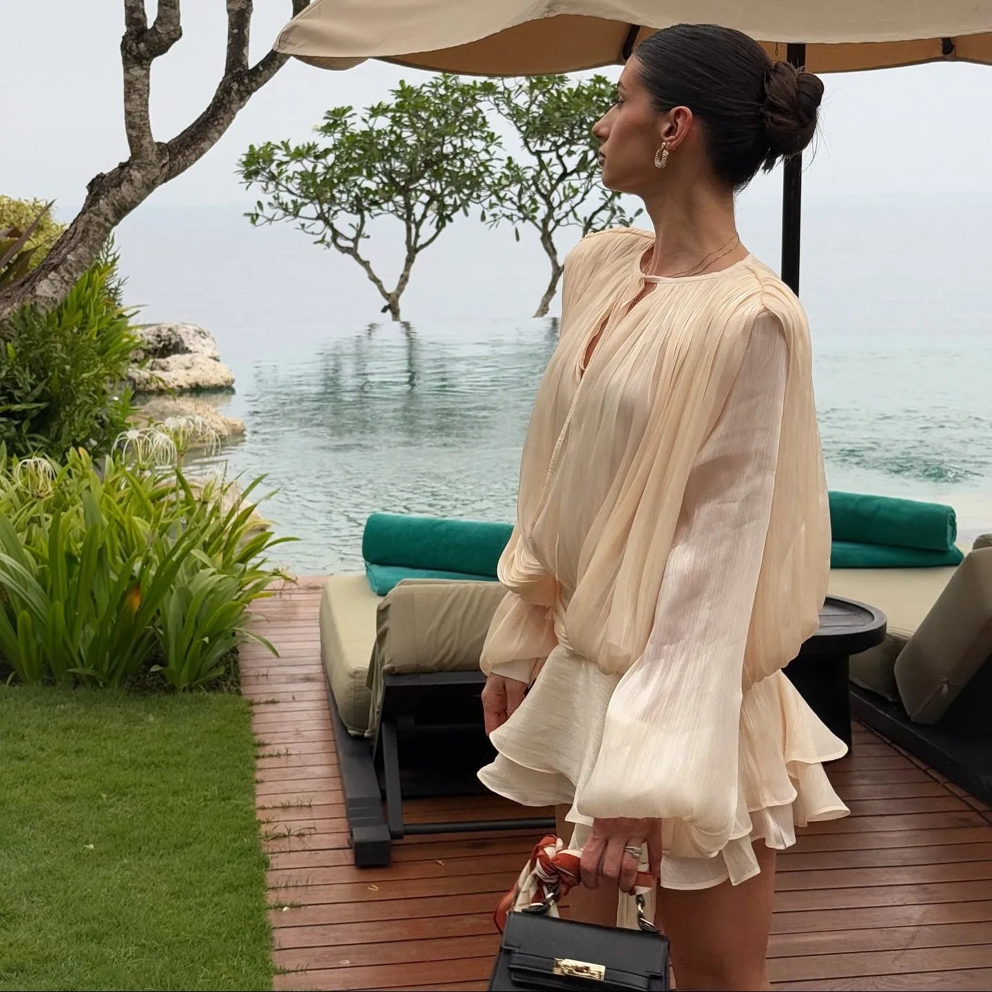 Fırfırlı etek ucu ve tam pile dokusuyla hareket kazanan mini elbise, kıvrımlı formunu vurgulayan büzgülü tasarımıyla feminen bir siluet sunar. Düğmeli manşetli uzun kollar ve boyundan bağlamalı ince kurdele, zarif bir kontrast yaratır. Gün boyu konfor sağlayan hafif kumaşı sayesinde gündüzden geceye stilinizi yükseltir; topuklu botlardan ince bantlı sandaletlere kadar her kombinle uyum sağlar.