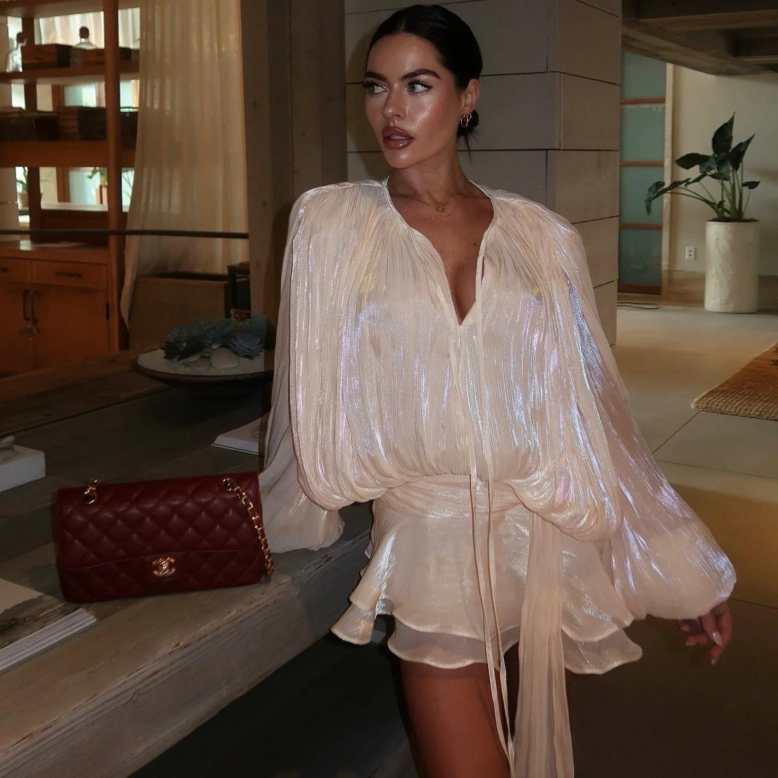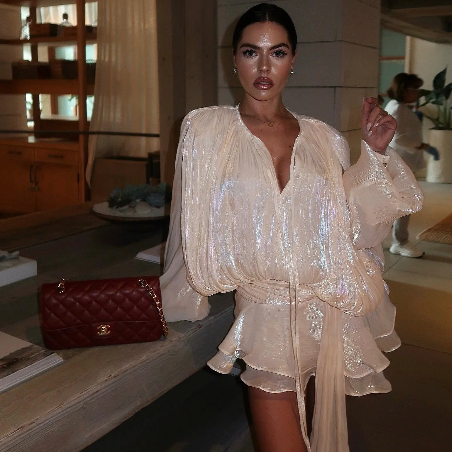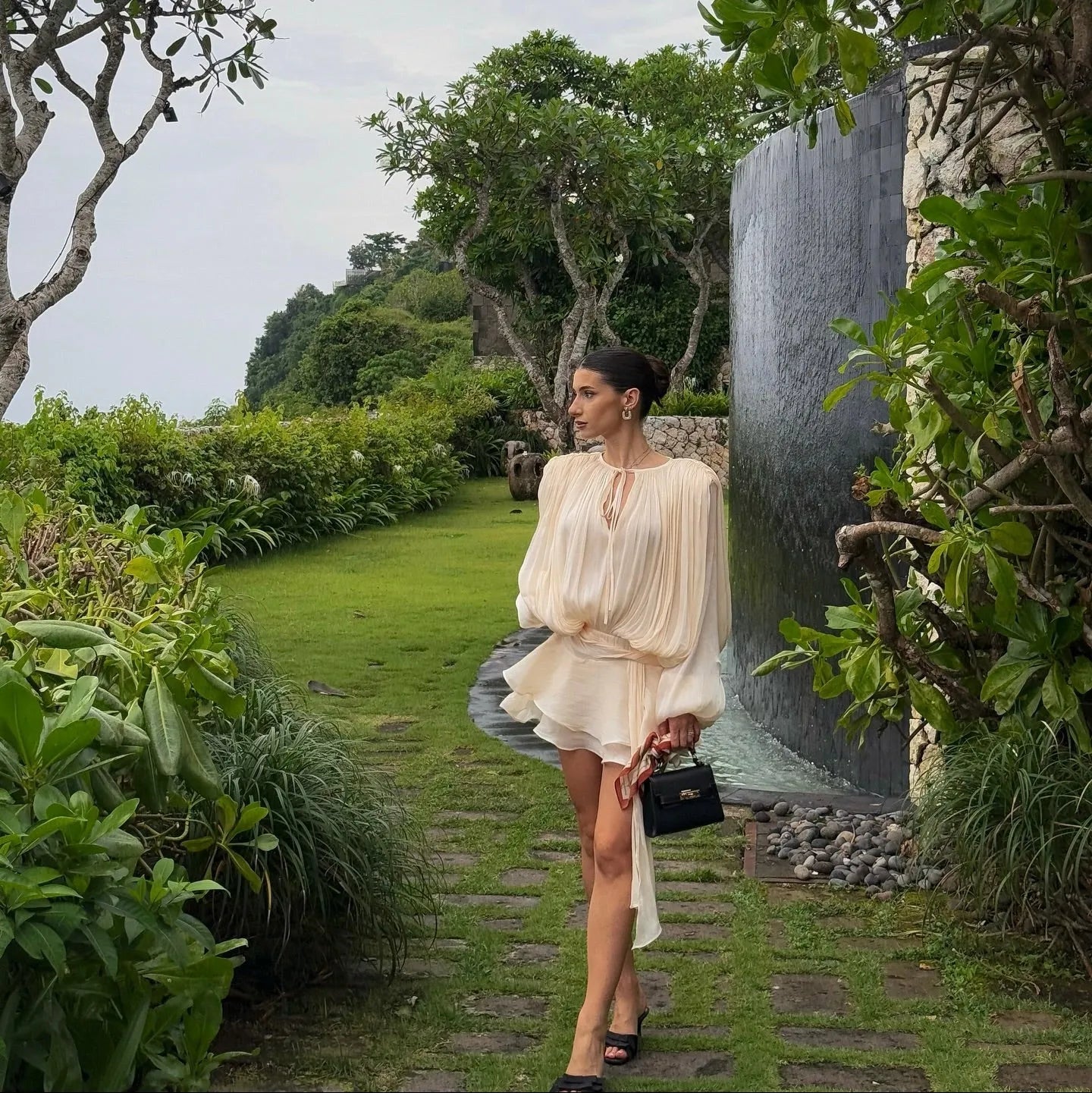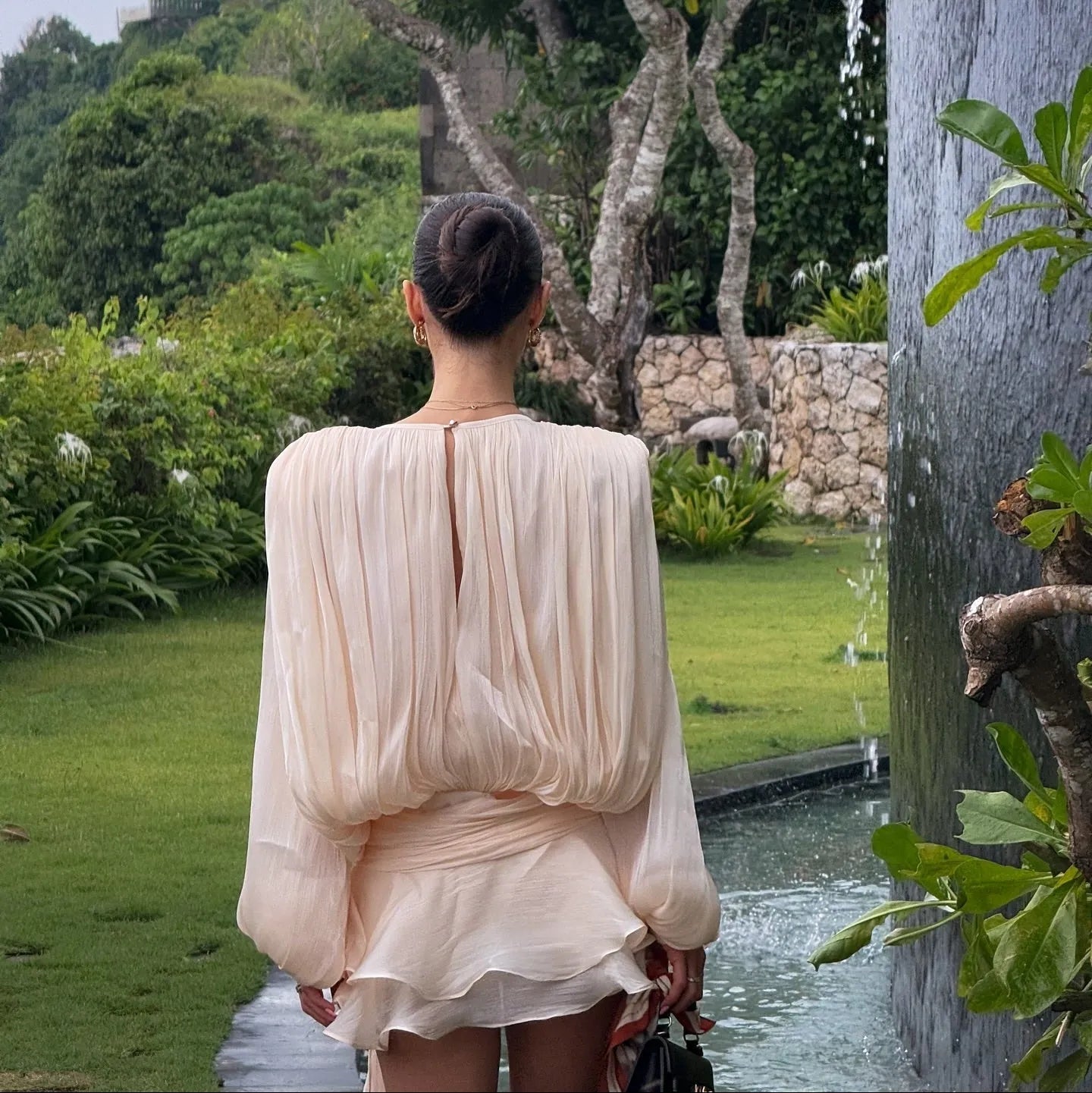 Fırfırlı etek ucu ve tam pile dokusuyla hareket kazanan mini elbise, kıvrımlı formunu vurgulayan büzgülü tasarımıyla feminen bir siluet sunar. Düğmeli manşetli uzun kollar ve boyundan bağlamalı ince kurdele, zarif bir kontrast yaratır. Gün boyu konfor sağlayan hafif kumaşı sayesinde gündüzden geceye stilinizi yükseltir; topuklu botlardan ince bantlı sandaletlere kadar her kombinle uyum sağlar.
