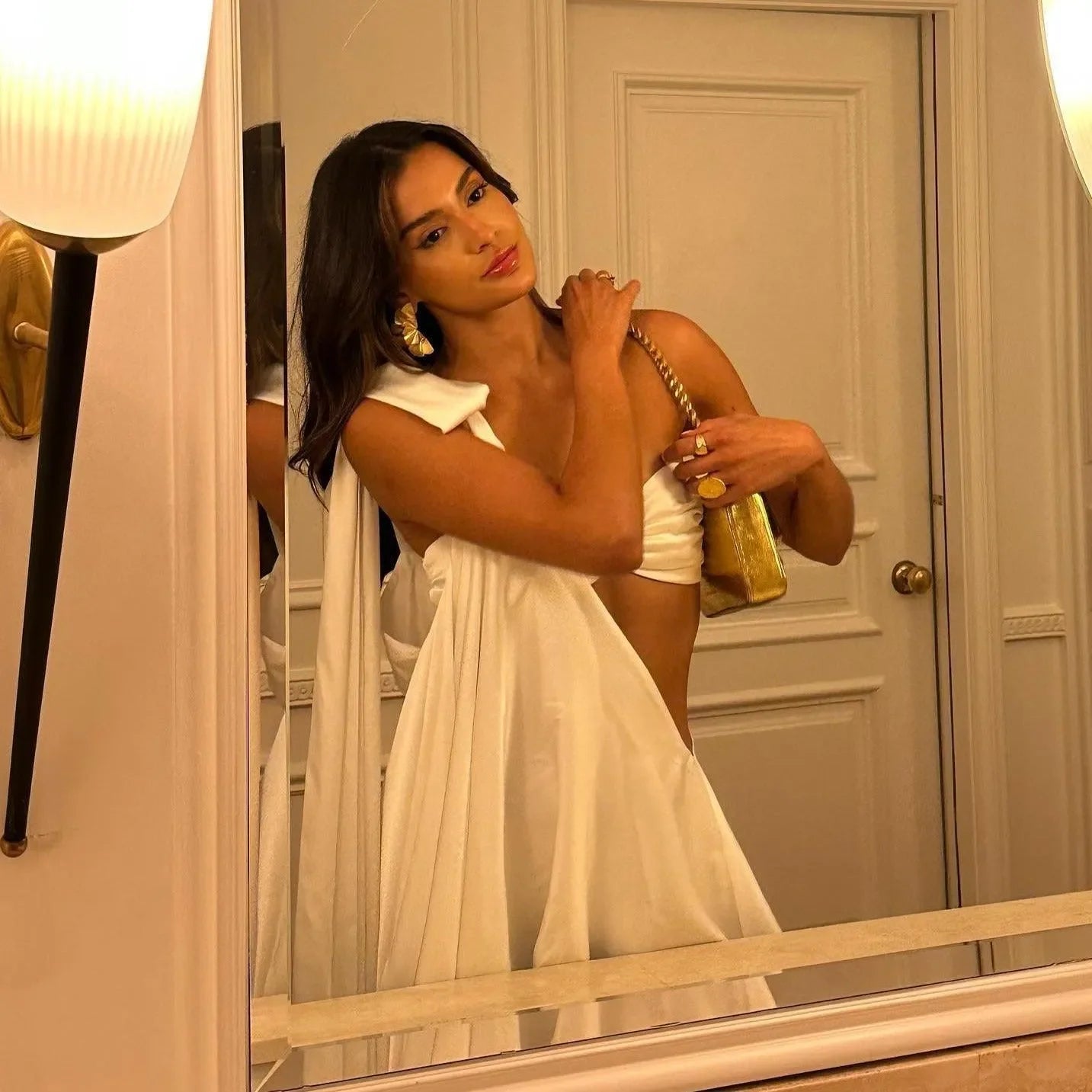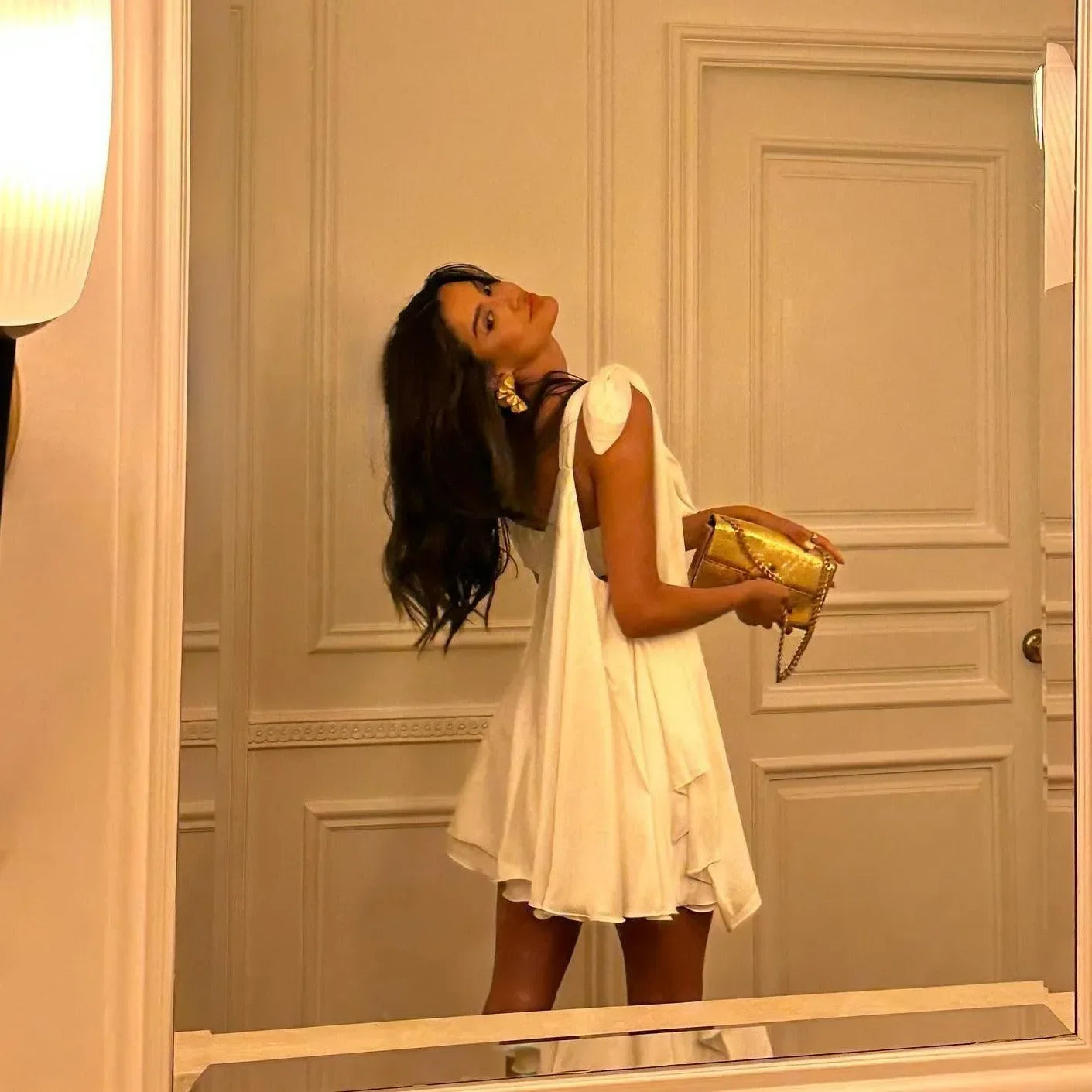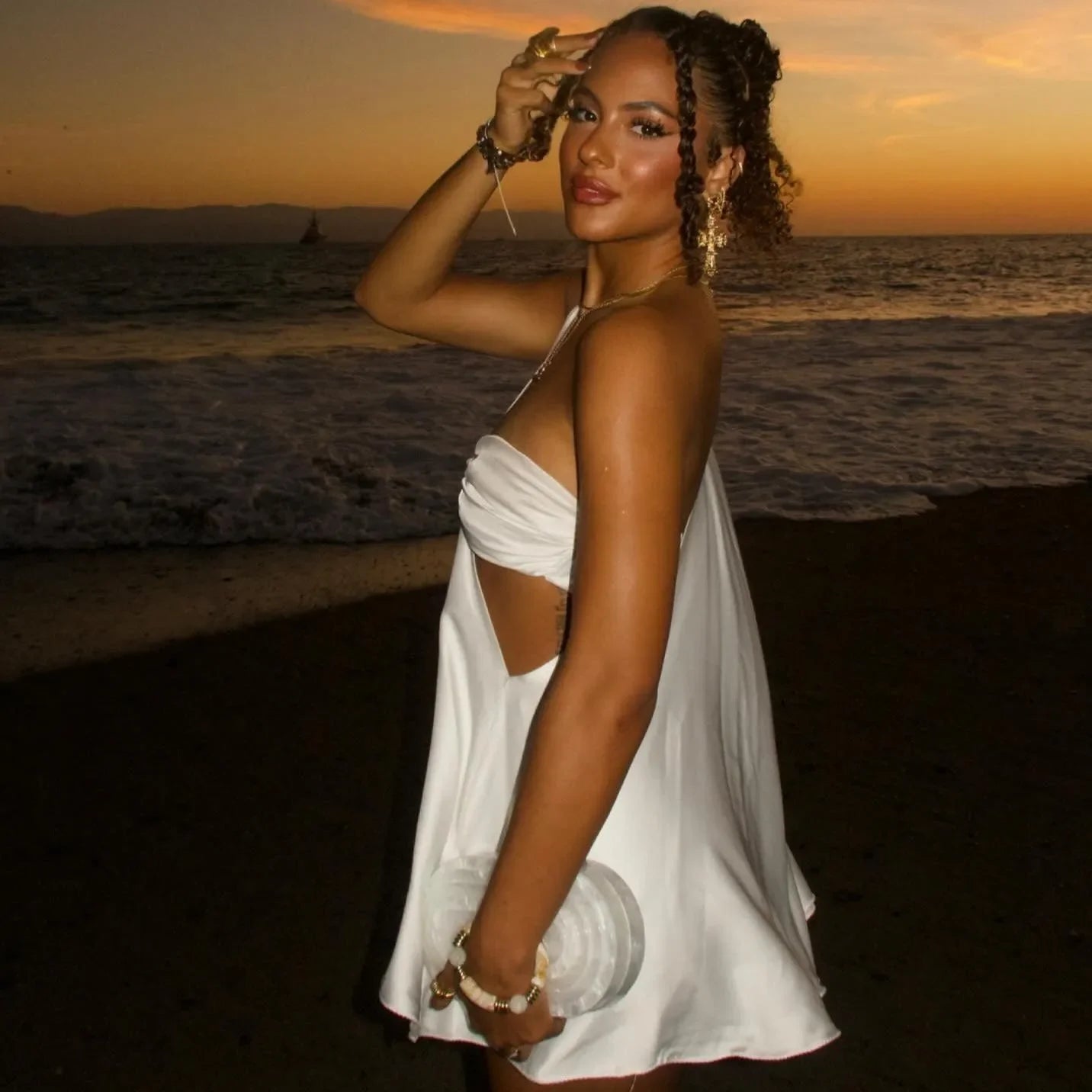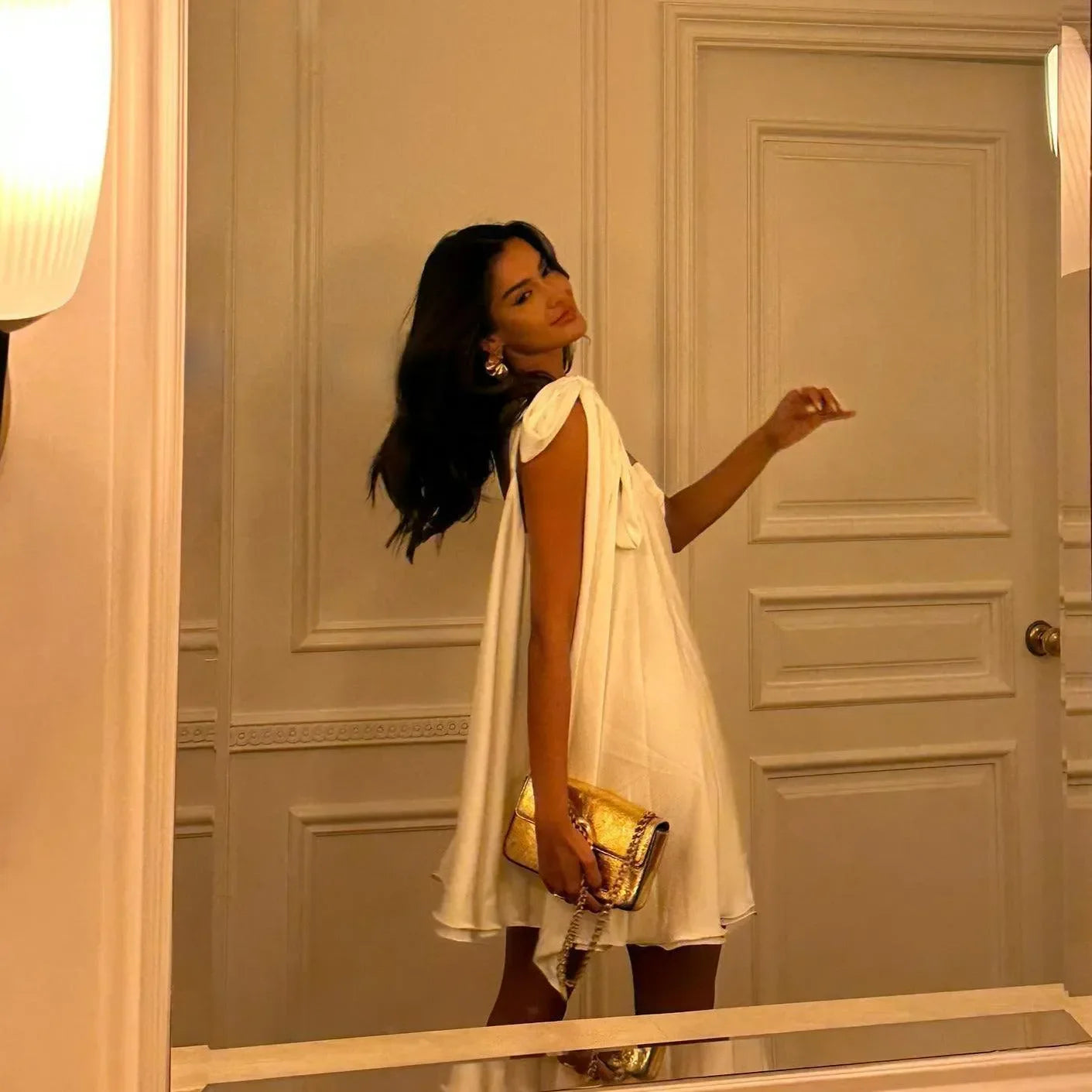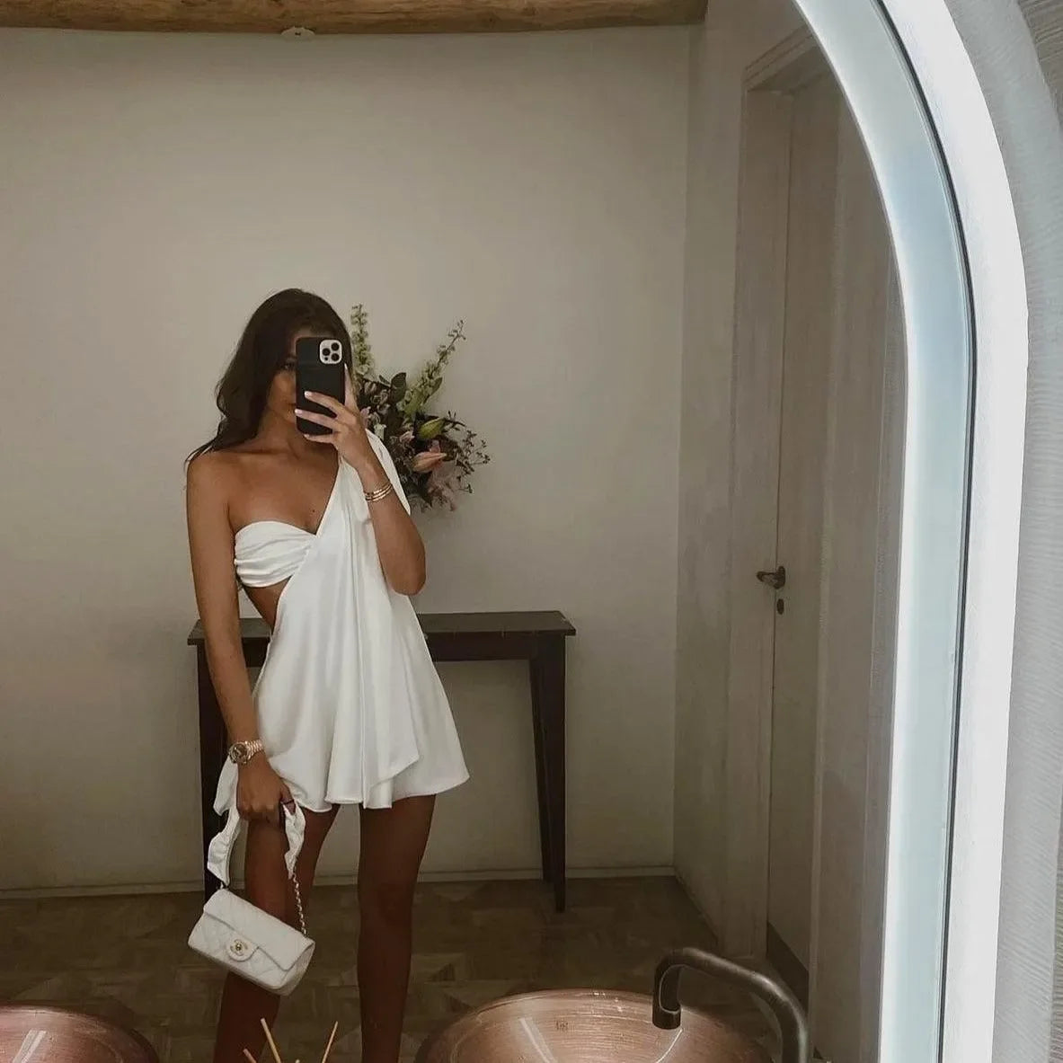 Tek omuz detayıyla modern bir duruş kazanan mini elbise, hafif dökümlü A‑form kesimiyle vücuda dokunmadan hareket özgürlüğü sunar. Yumuşak dokulu kumaşı gün boyu konfor sağlarken asimetrik yaka çizgisi şık bir vurgu yaratır. Akıcı etek ucu her adımda zarifçe savrulur; kokteyl davetlerinden akşam yemeklerine kadar tüm özel anlarda öne çıkmanız için tasarlanmıştır.