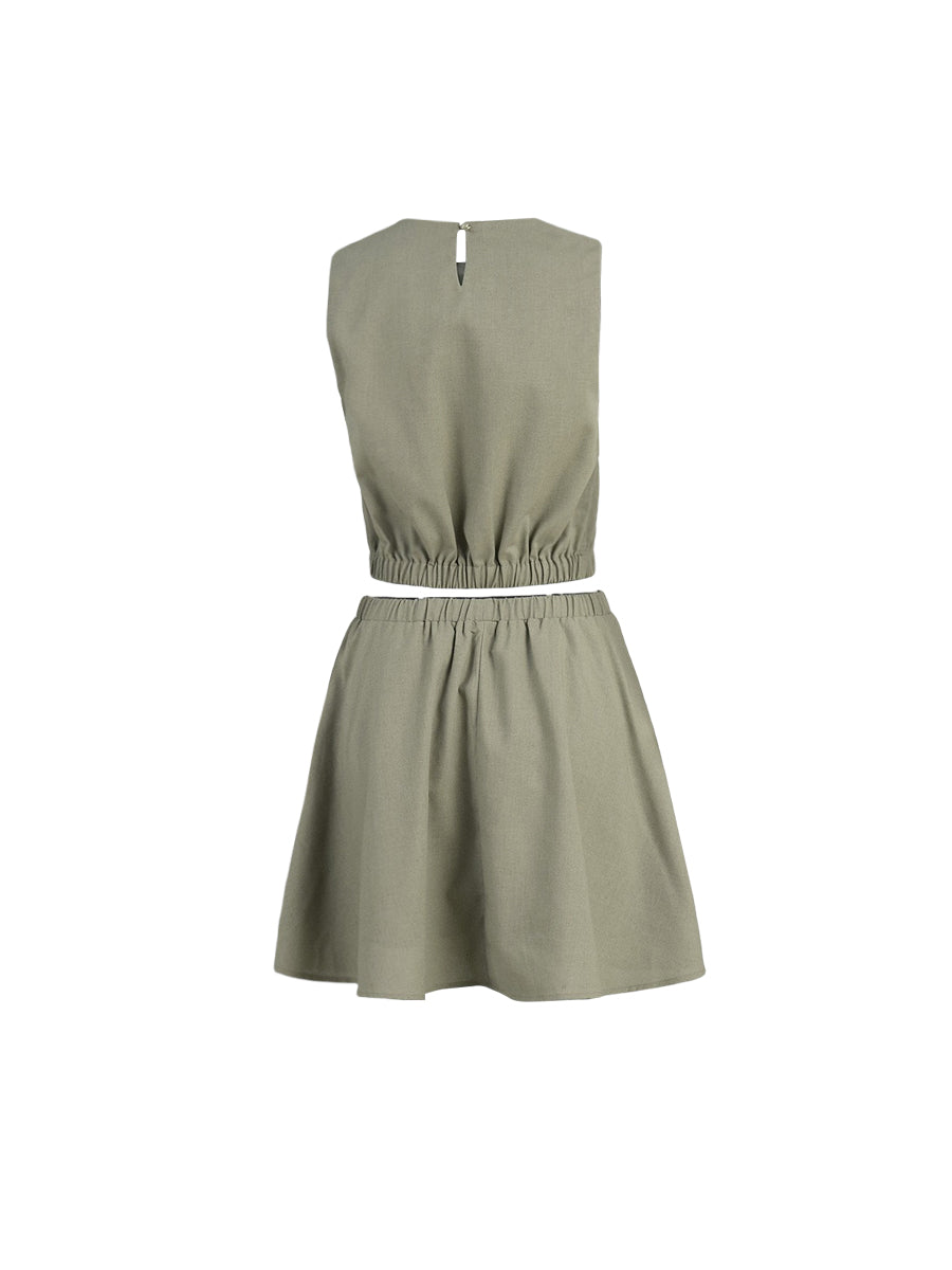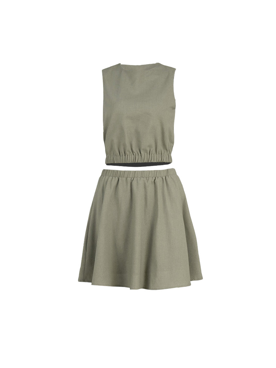 Şıklığınızı ve rahatlığınızı artıran Kolsuz Yuvarlak Yaka Mini Etek Takımı ile tarzınızı yükseltin. Kolsuz üst, vücudu güzelce saran yuvarlak yakasıyla dikkat çekerken, zarif mini etek hareketlerinize uyum sağlar.