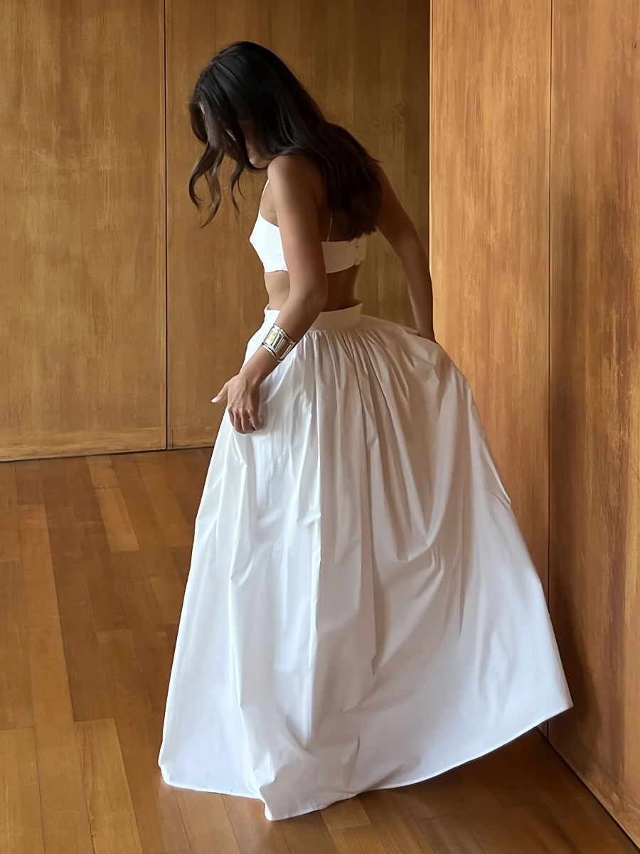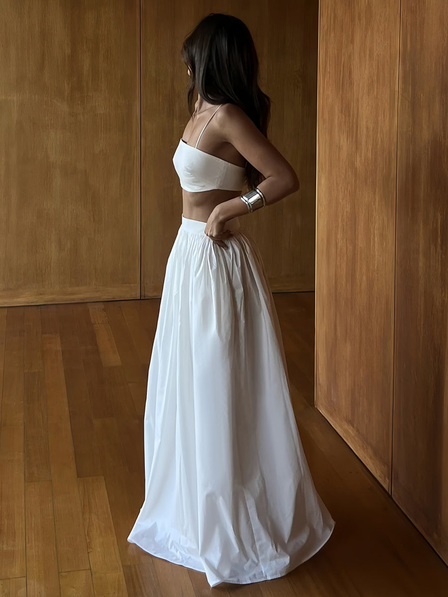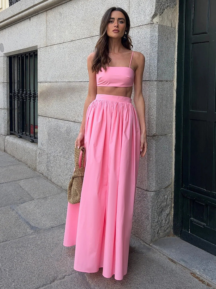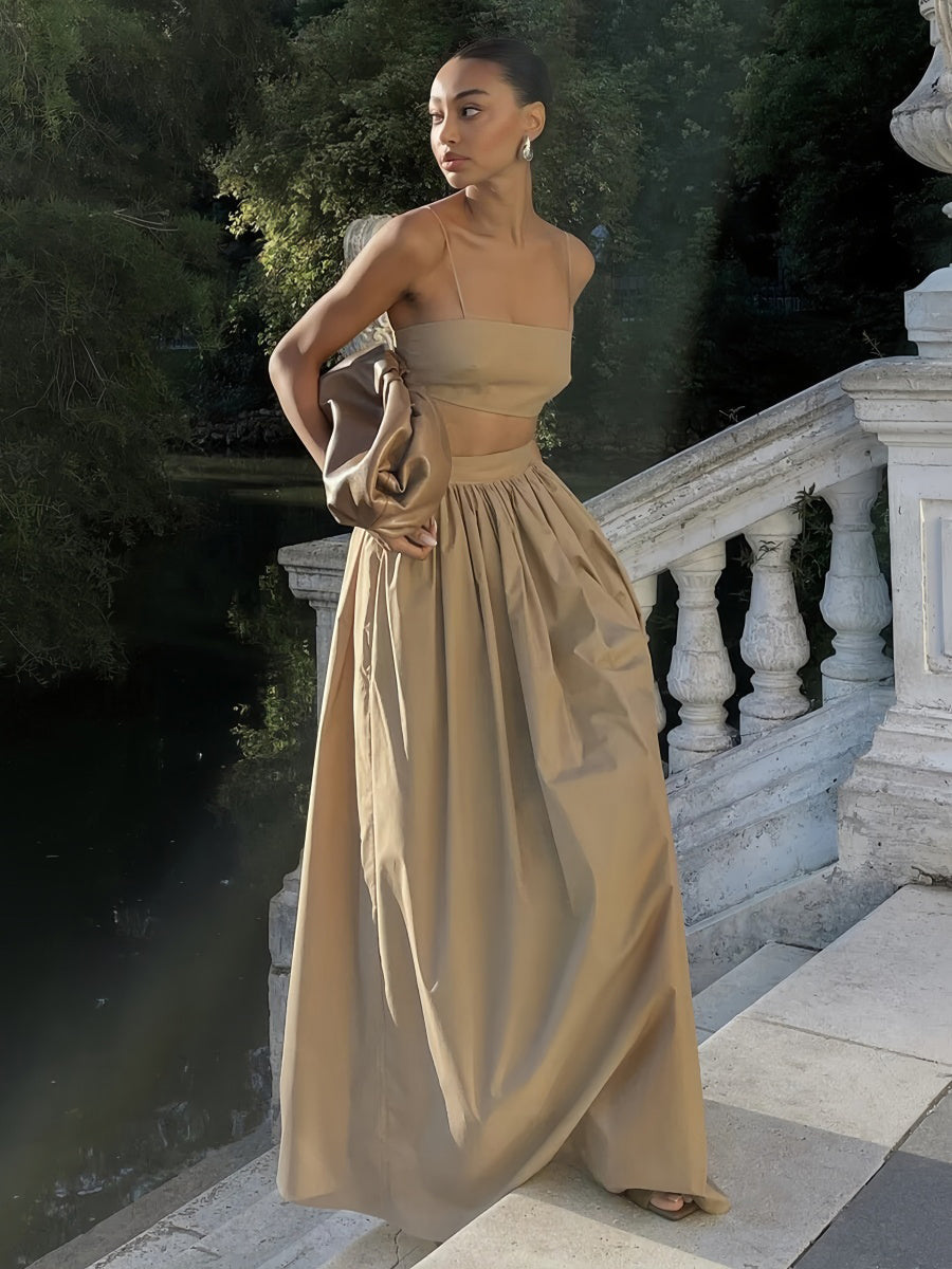 İp askılı üst ve pileli maxi etekten oluşan bu takım, eğlenceli ve feminen bir görünüm sunar. Hem rahat hem şık olan bu set, arkadaş buluşmaları veya özel akşamlar için mükemmeldir.
