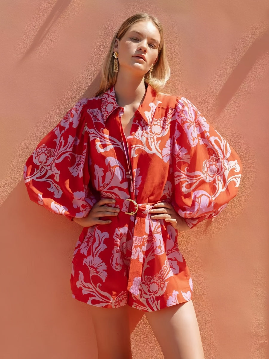 Gardırobunuzu bu göz alıcı Çiçek Desenli Fener Kol Tulum ile yükseltin. Dikkat çekici çiçek deseni, modaya uygun fener kollarıyla birleşerek baş döndüren, vücut hatlarınızı güzelleştiren bir silüet yaratır. Yaz gezileri için ya da özel davetlerde şık kombinler için idealdir.