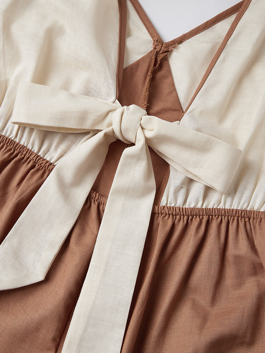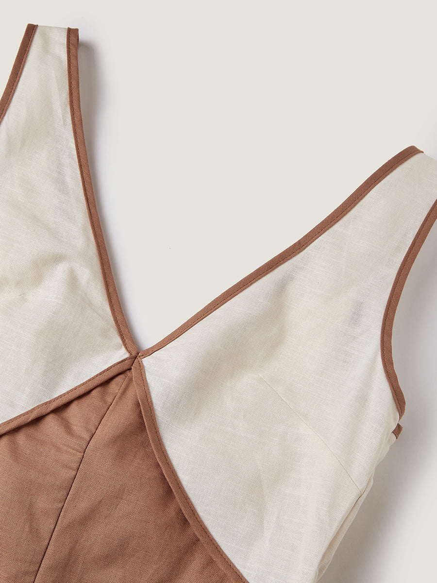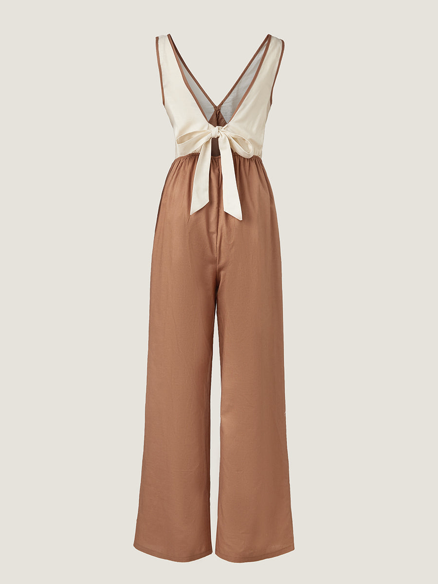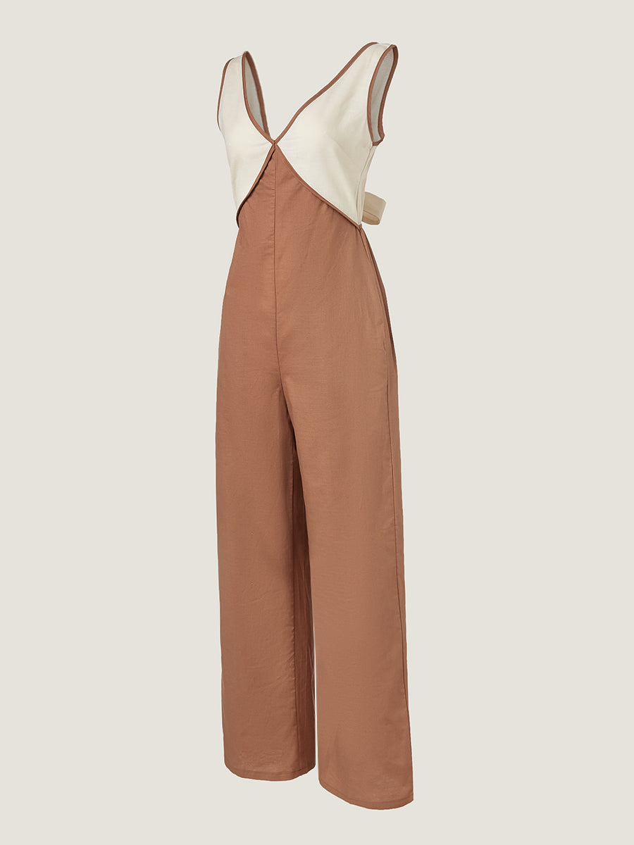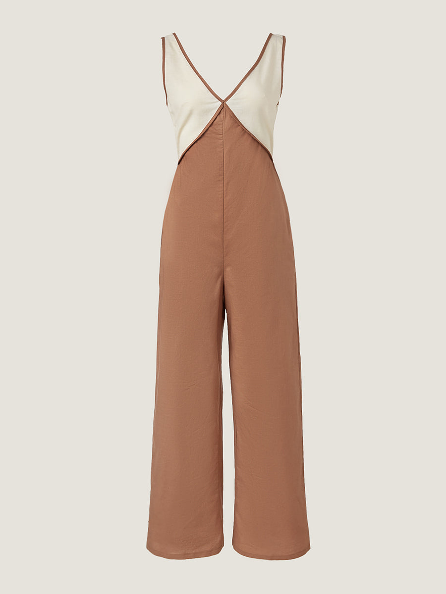 Renk bloklarıyla hareketlendirilmiş ve geniş paça siluetine sahip bu kolsuz tulum, rahat kesimiyle hem şık hem konforlu bir tercih sunar. Günlük, minimalist ve tatil kombinlerinize eğlenceli bir dokunuş katar.