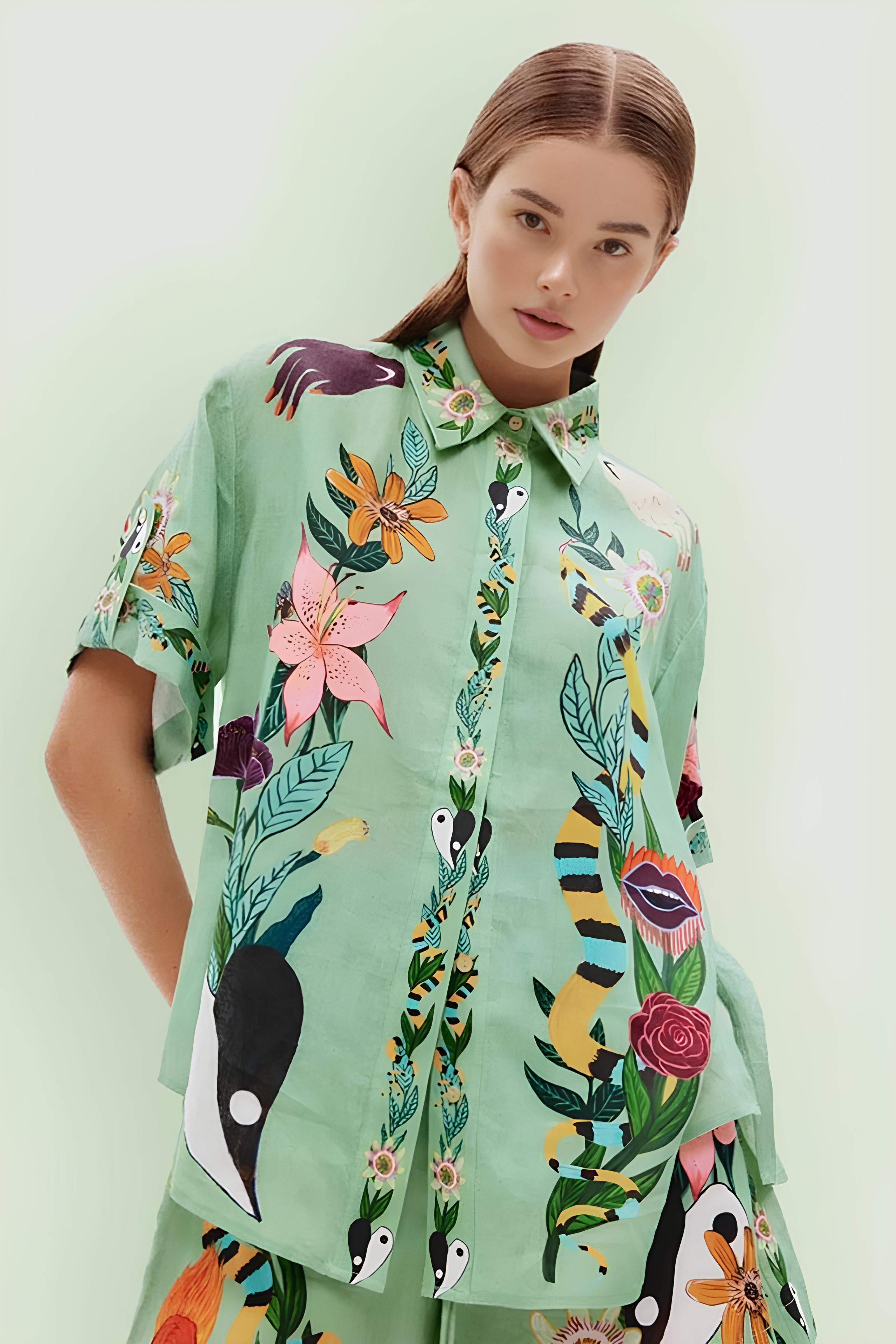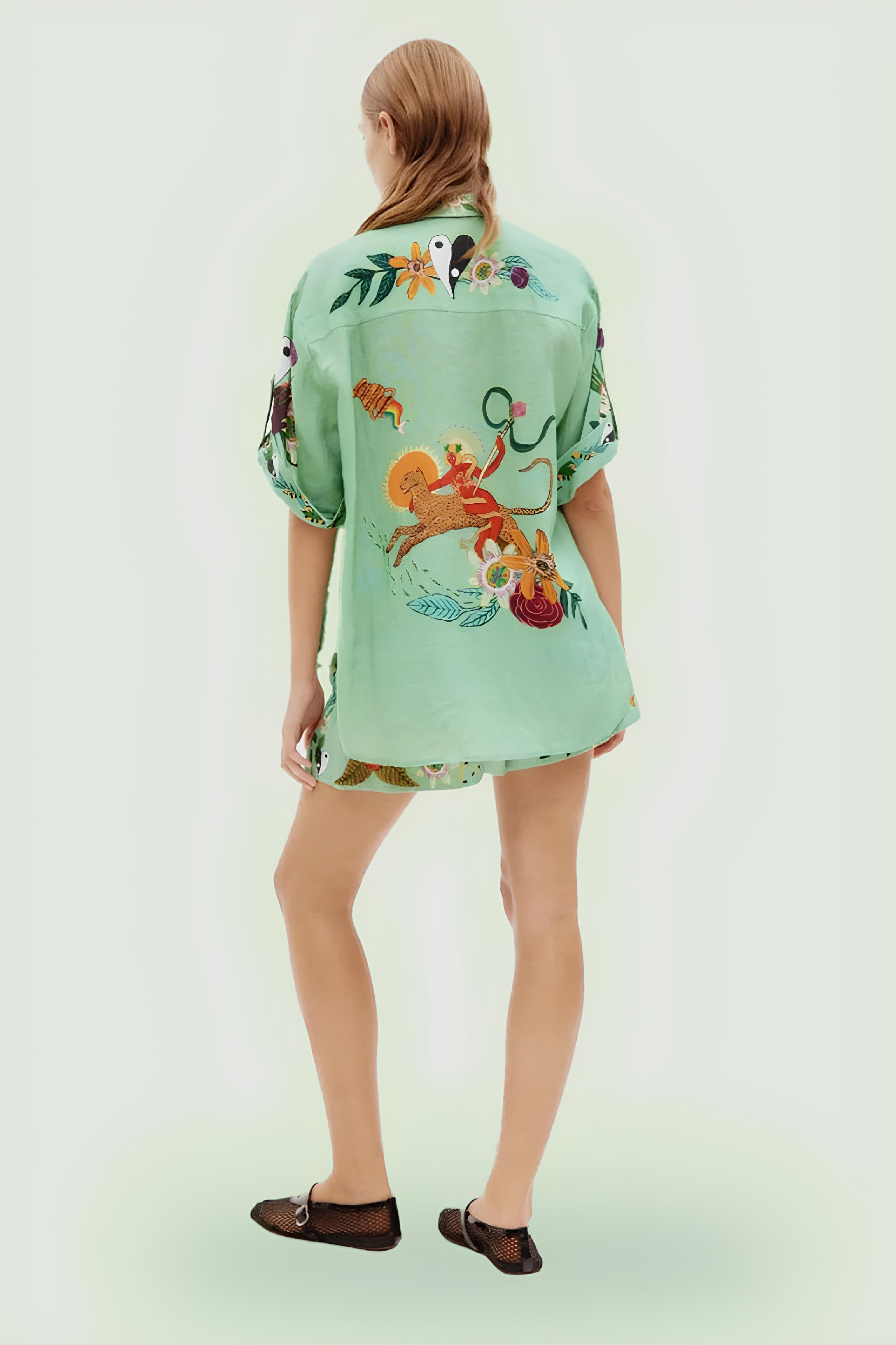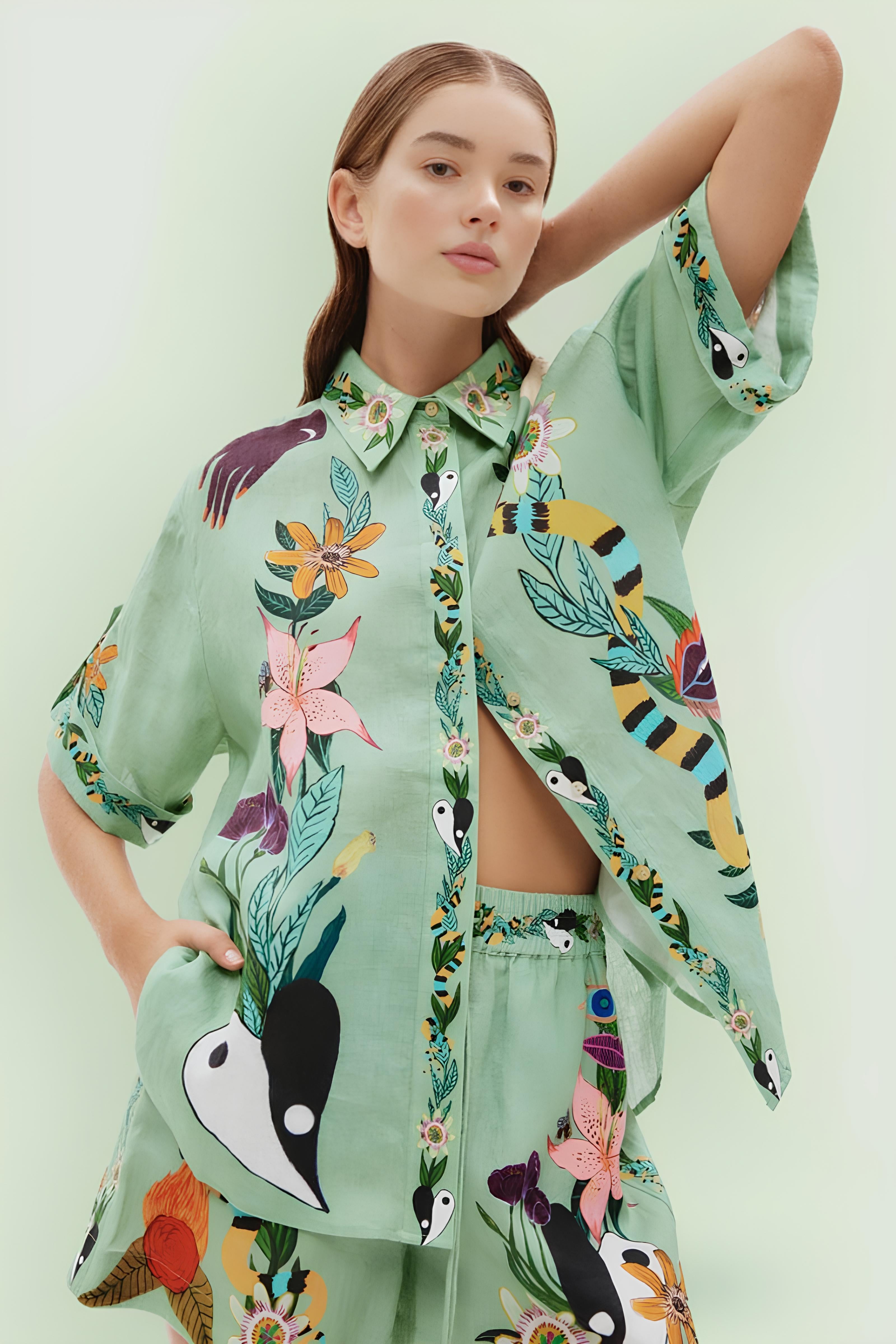Yaz stilinizi benzersiz etnik desenli bol gömlek ve şort iki parçalı takımla yükseltin.
