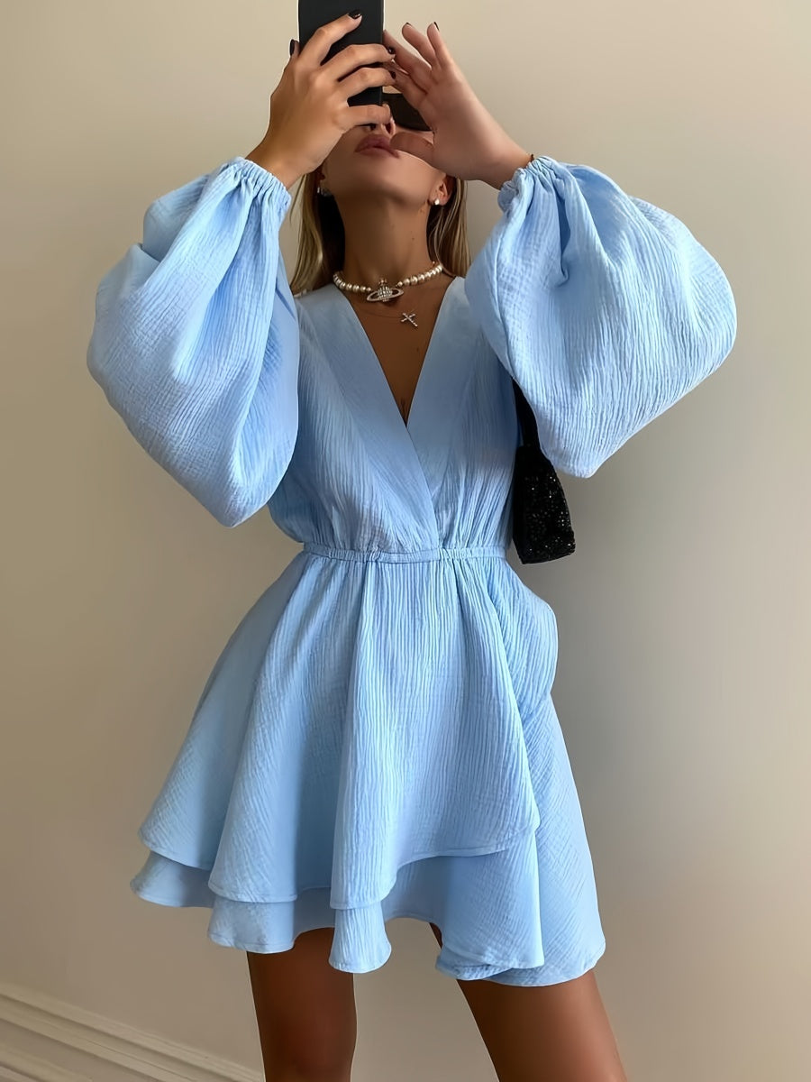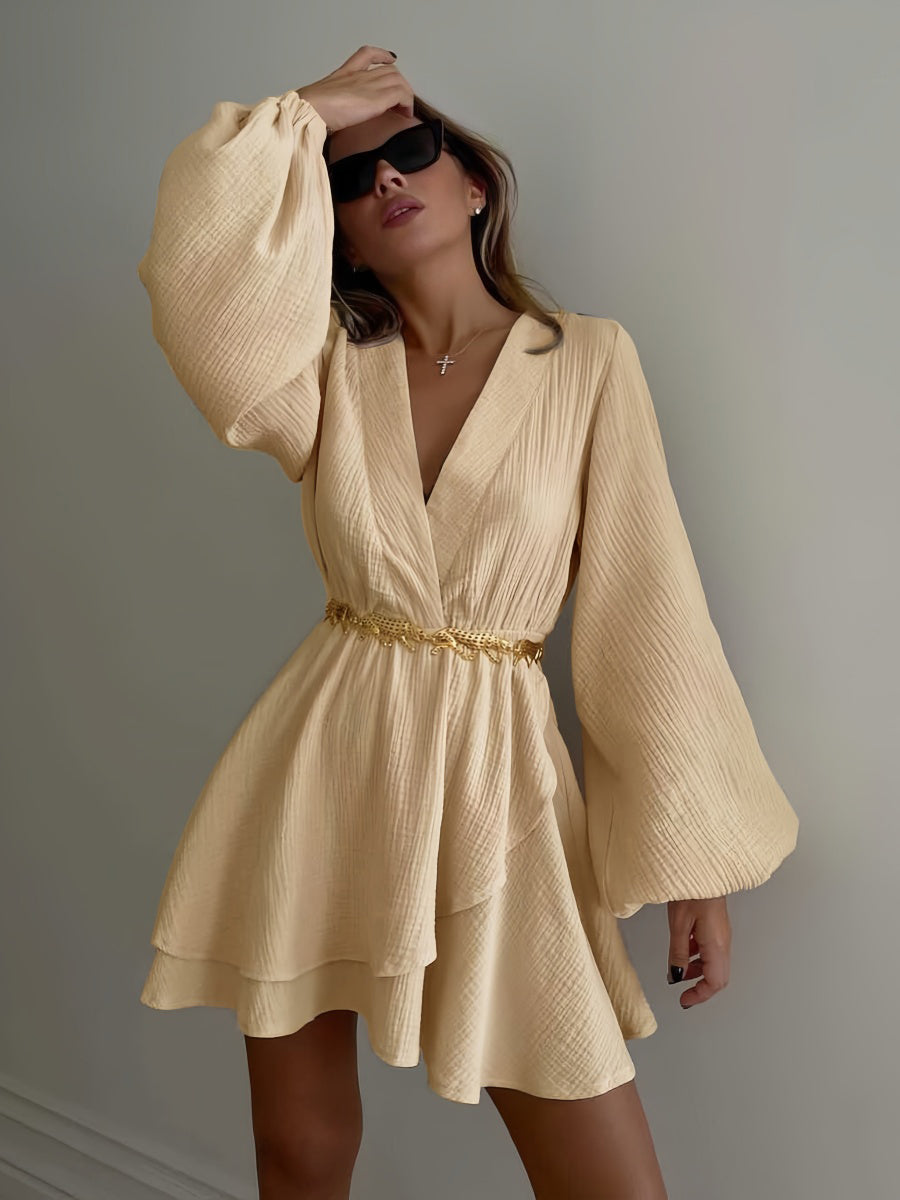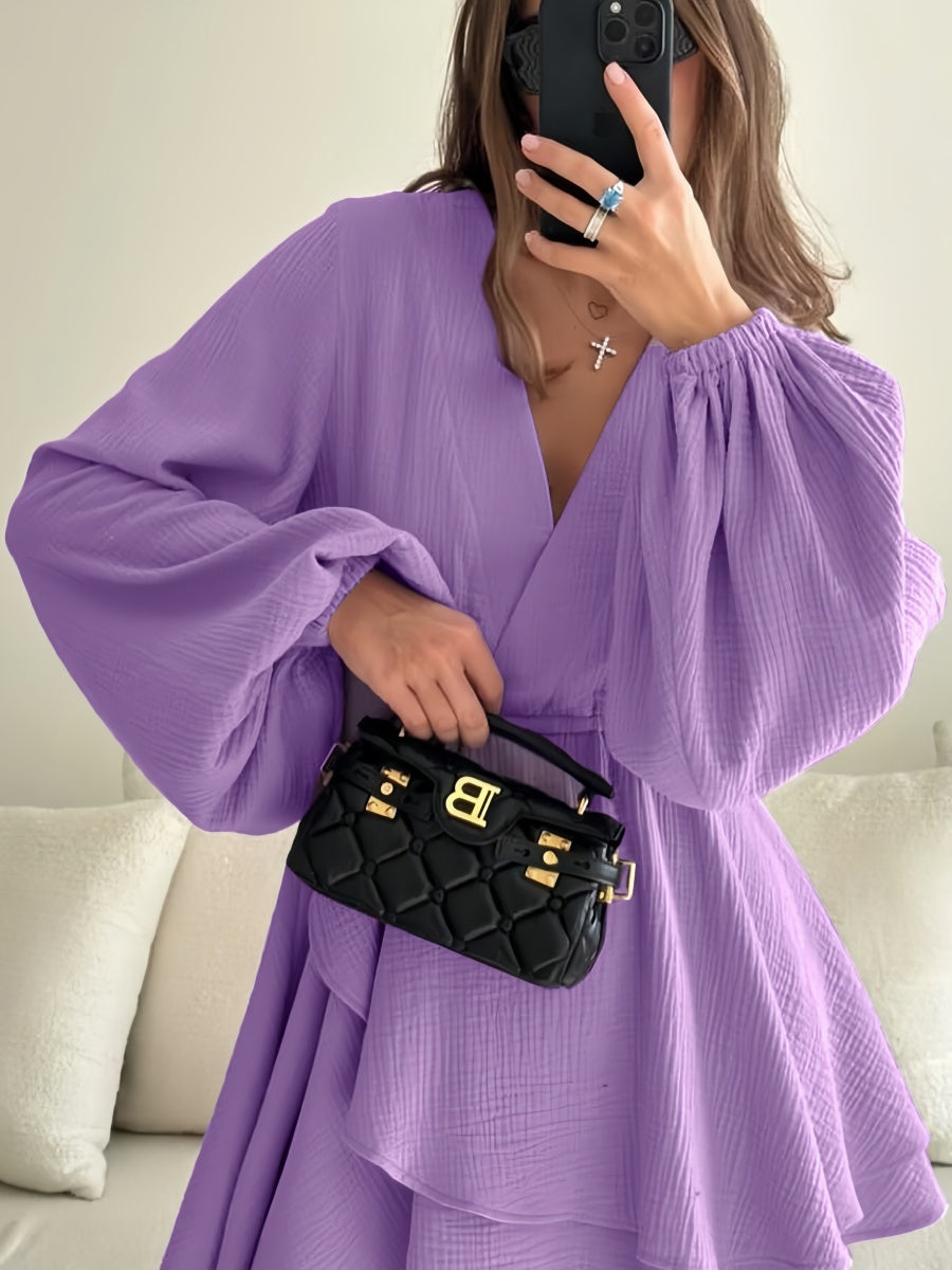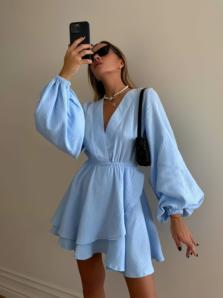 Tarzınızı yükseltin! Benzersiz fener kolları ve V yakasıyla şıklık katan bu elbise, A-line kesimiyle figürünüzü kusursuz şekilde tamamlar. Günlük, rahat veya tatil kombinleriniz için çok yönlü ve zarif bir seçenek. Kemer dahil değildir.