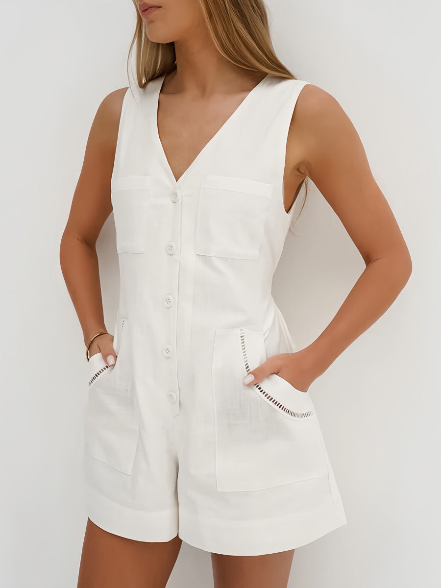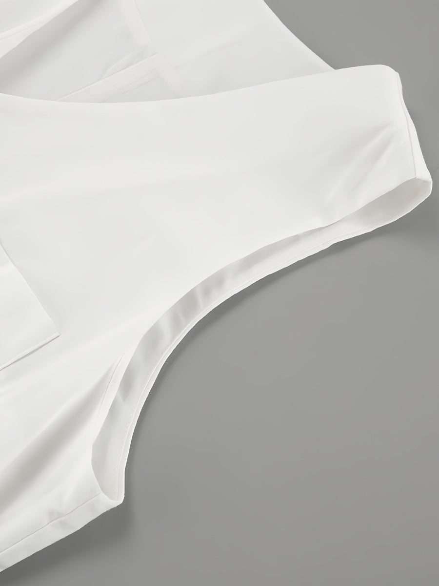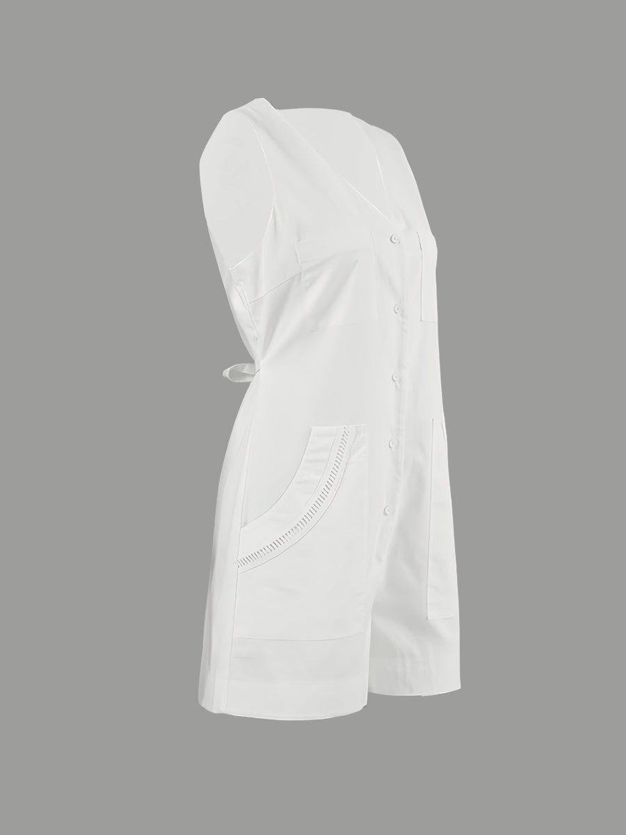 Beyaz Pamuklu V Yaka Kolsuz Tulum ile zahmetsizce şıklığı yakalayın. Nefes alabilen pamuklu kumaşıyla rahatlığı ve tarzı bir araya getiren bu parça, silüetinizi uzatan şık V yakasıyla dikkat çeker. Sıcak havalar için dışarı çıkarken veya gündelik buluşmalarda mükemmeldir.