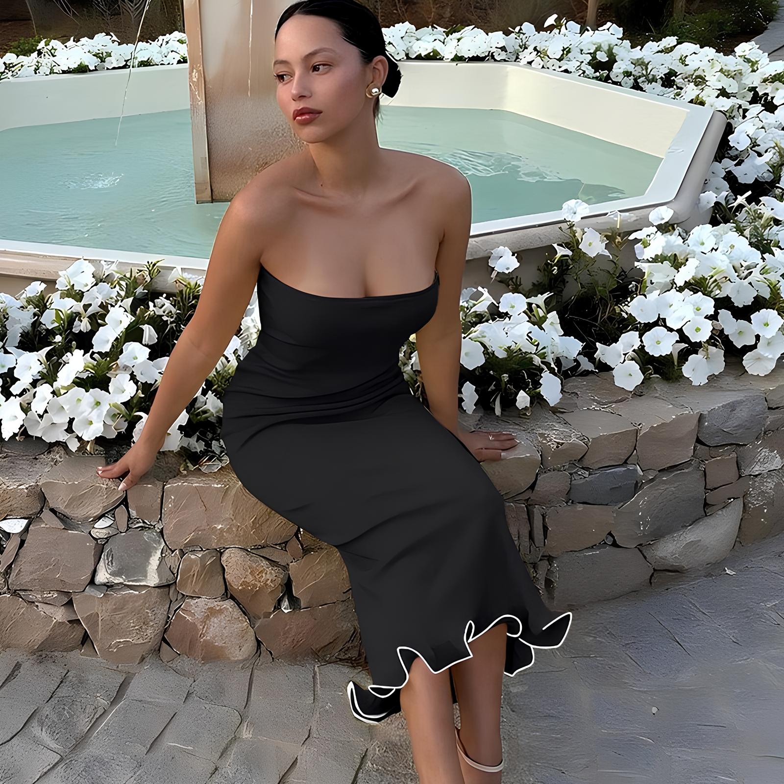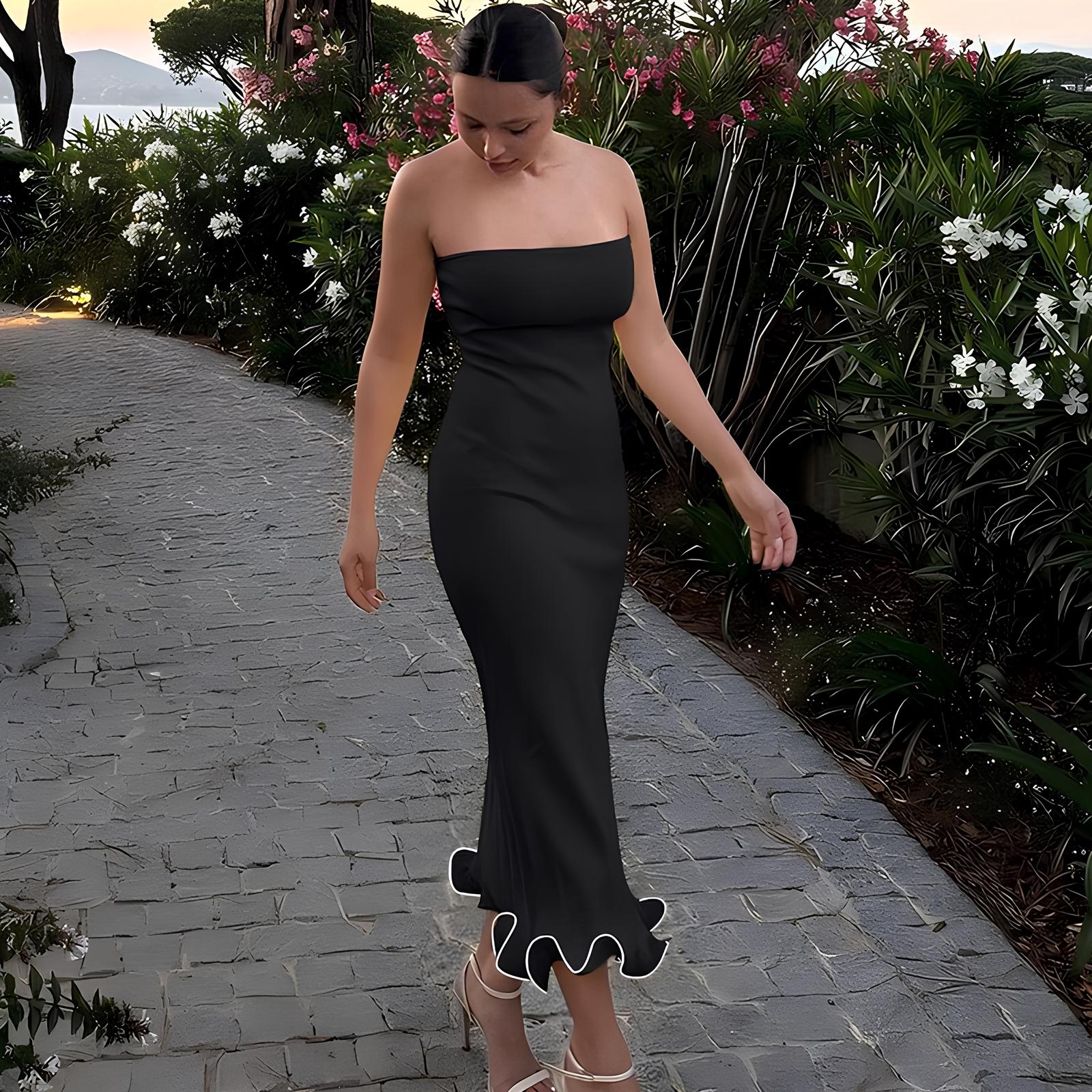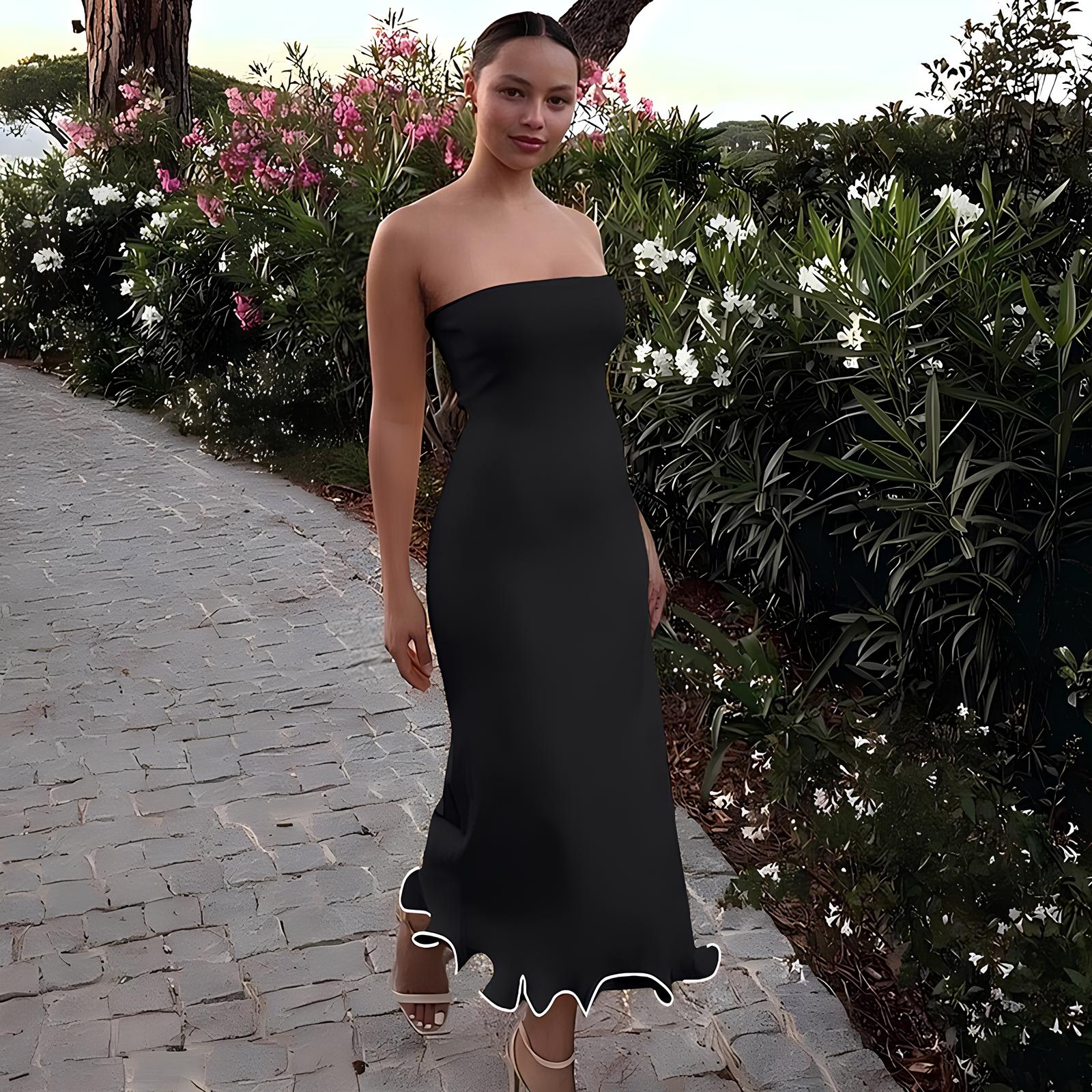 Serenne Straplez Elbise, zarif ve modern görünümüyle parti şıklığının vazgeçilmez parçası. Vücudu saran düz kesimi sayesinde feminen hatları öne çıkarırken, orta derecede esnek kumaşı konforlu bir uyum sağlar. Minimalist tasarımıyla hem özel davetlerde hem de şehir akşamlarında özgüvenle tercih edilebilir.