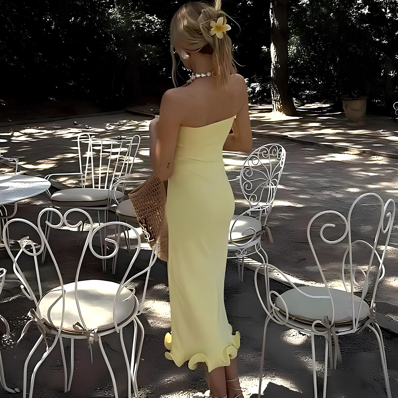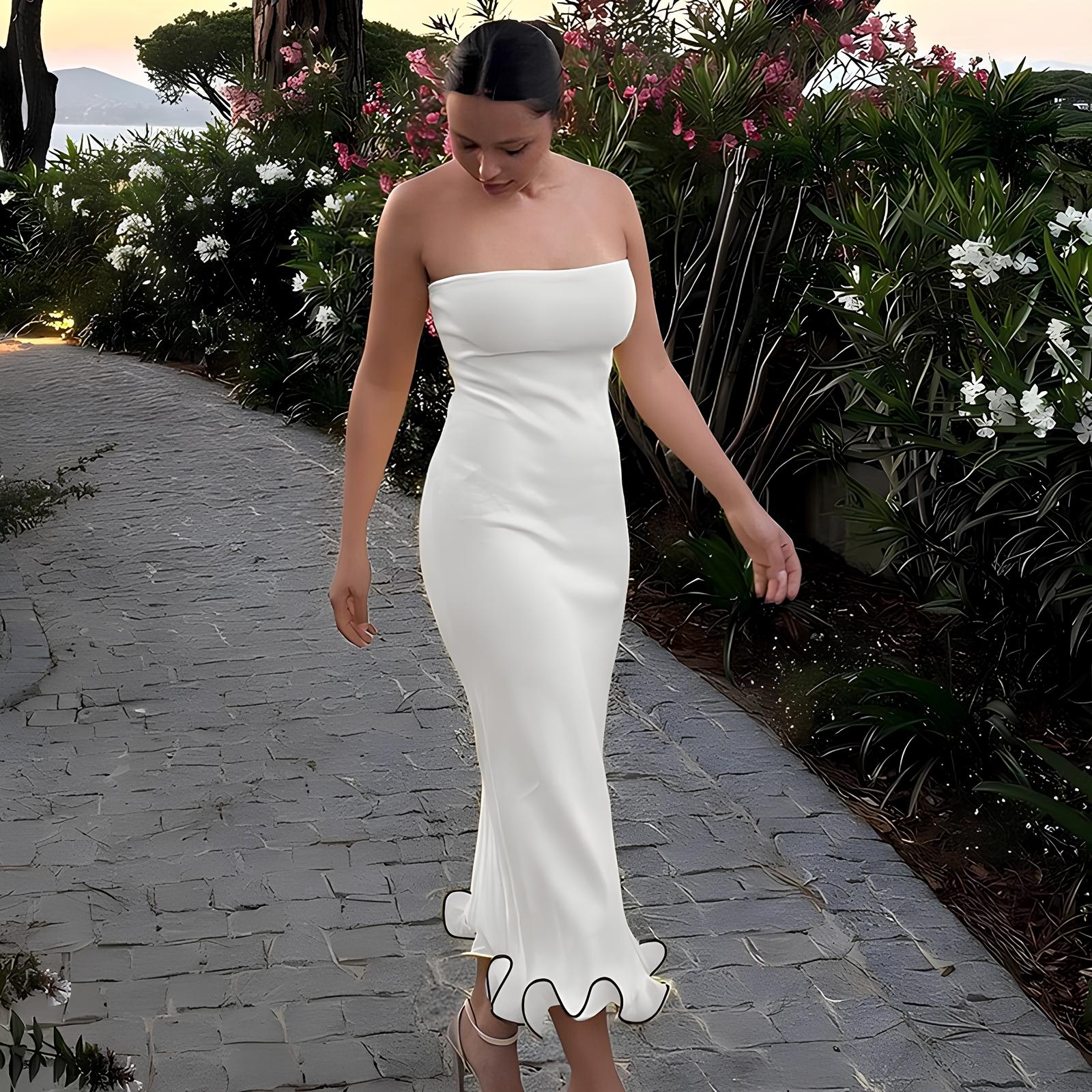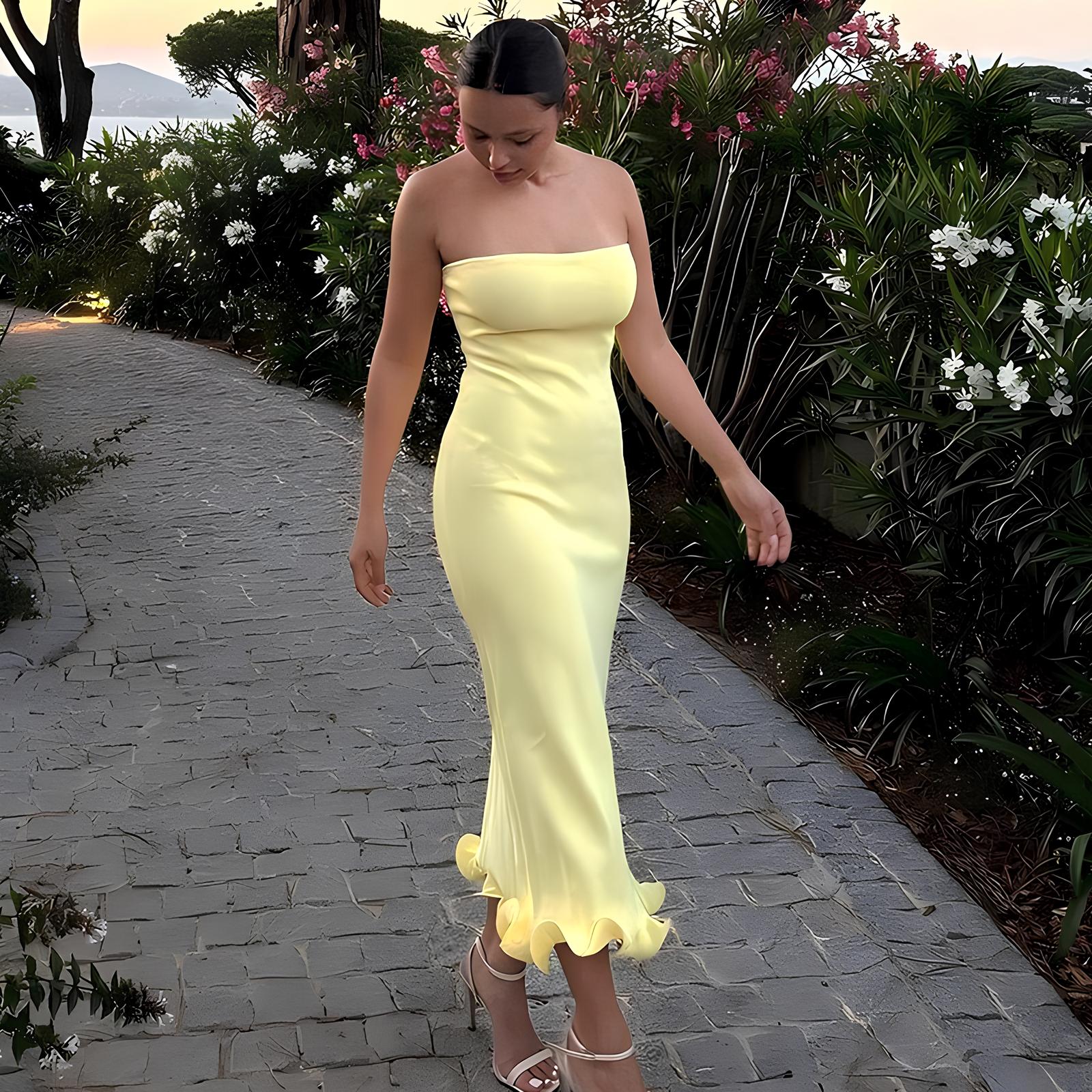 Serenne Straplez Elbise, zarif ve modern görünümüyle parti şıklığının vazgeçilmez parçası. Vücudu saran düz kesimi sayesinde feminen hatları öne çıkarırken, orta derecede esnek kumaşı konforlu bir uyum sağlar. Minimalist tasarımıyla hem özel davetlerde hem de şehir akşamlarında özgüvenle tercih edilebilir.