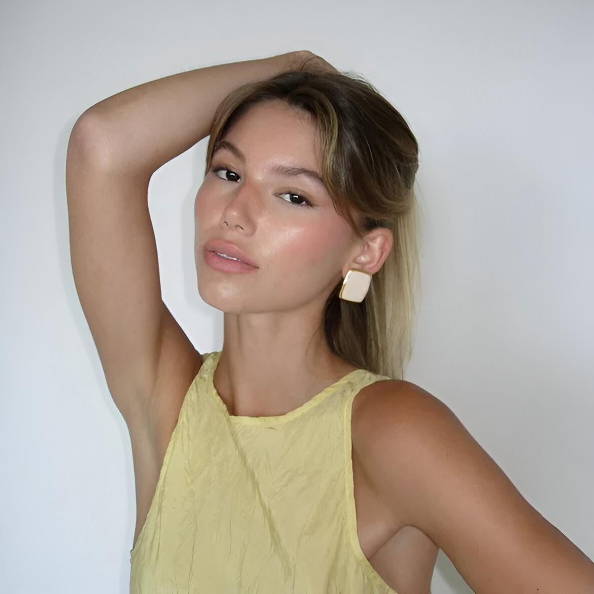 Parlak bir dokunuşla stilinize ışıltı katın: Fildişi Işıltılı Küpe, zarif dikdörtgen formu ve canlı fildişi rengiyle öne çıkıyor.