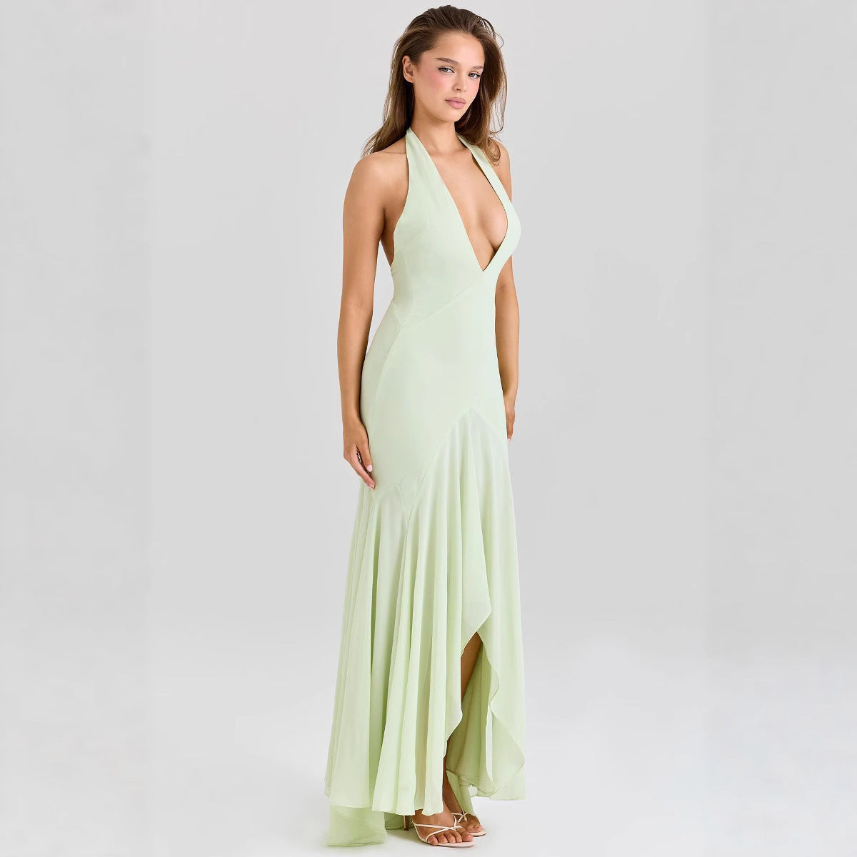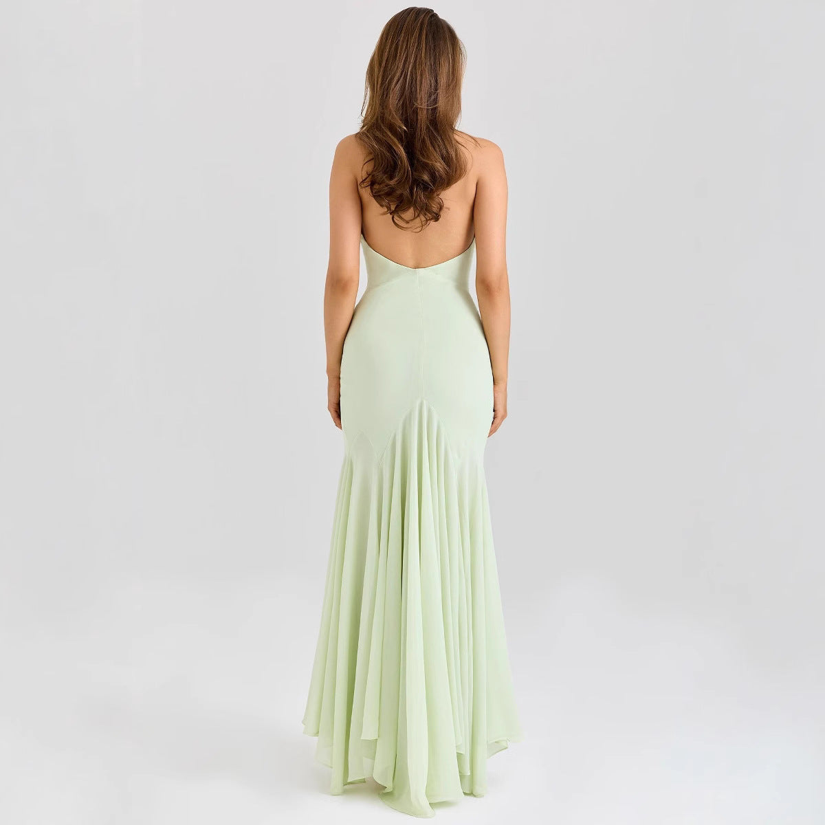 Zarif ve etkileyici bir görünüm sunan bu elbise, akıcı drape tasarımı ve asimetrik etek ucu ile her adımda zarif bir hareket kazandırır. Özel davetler ve akşam etkinlikleri için mükemmel bir tercih olan bu parça, modern dokunuşları sofistike bir stille buluşturur.