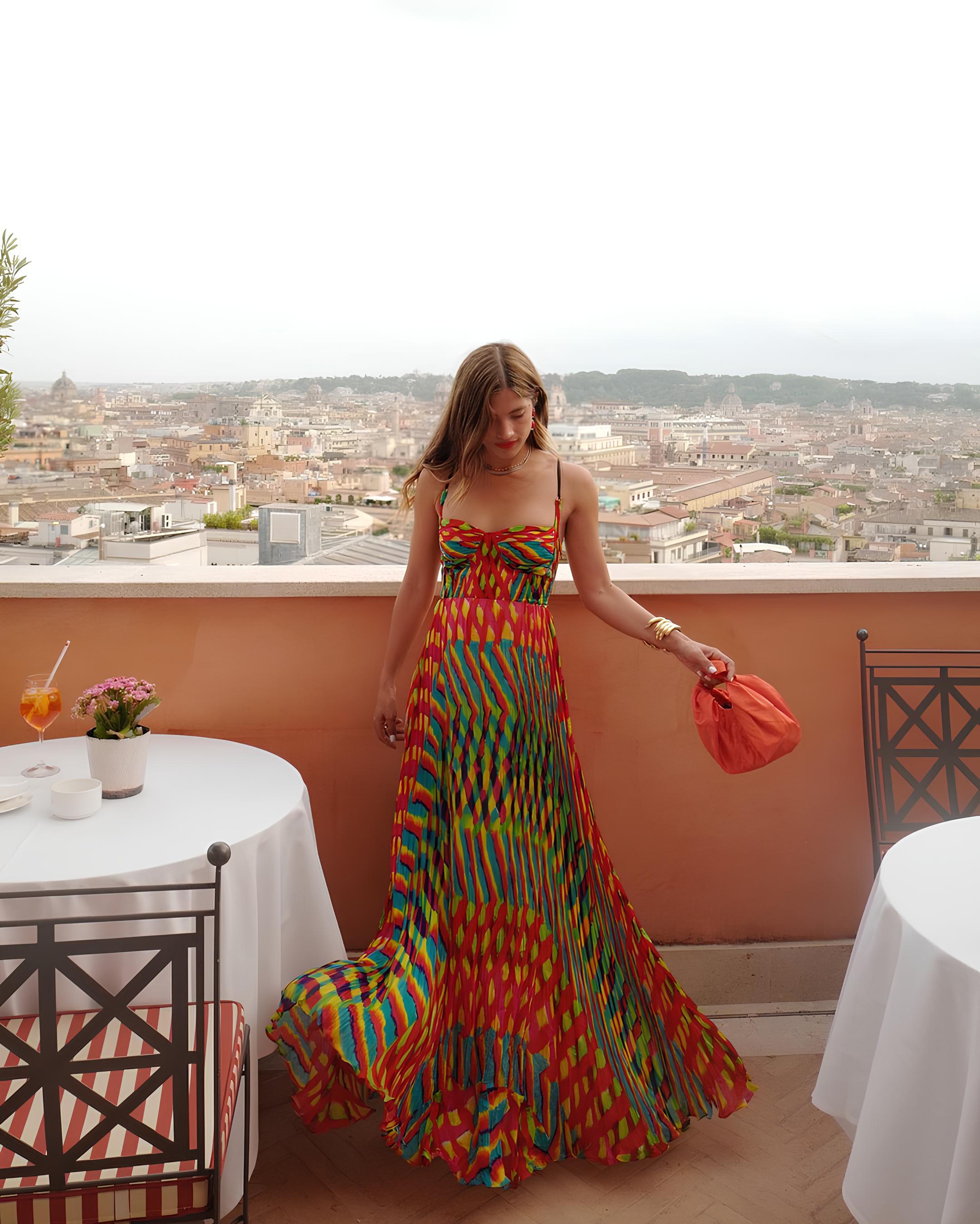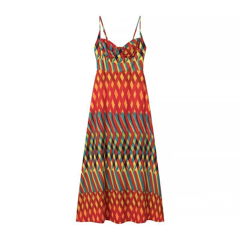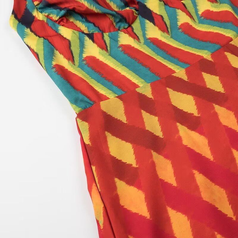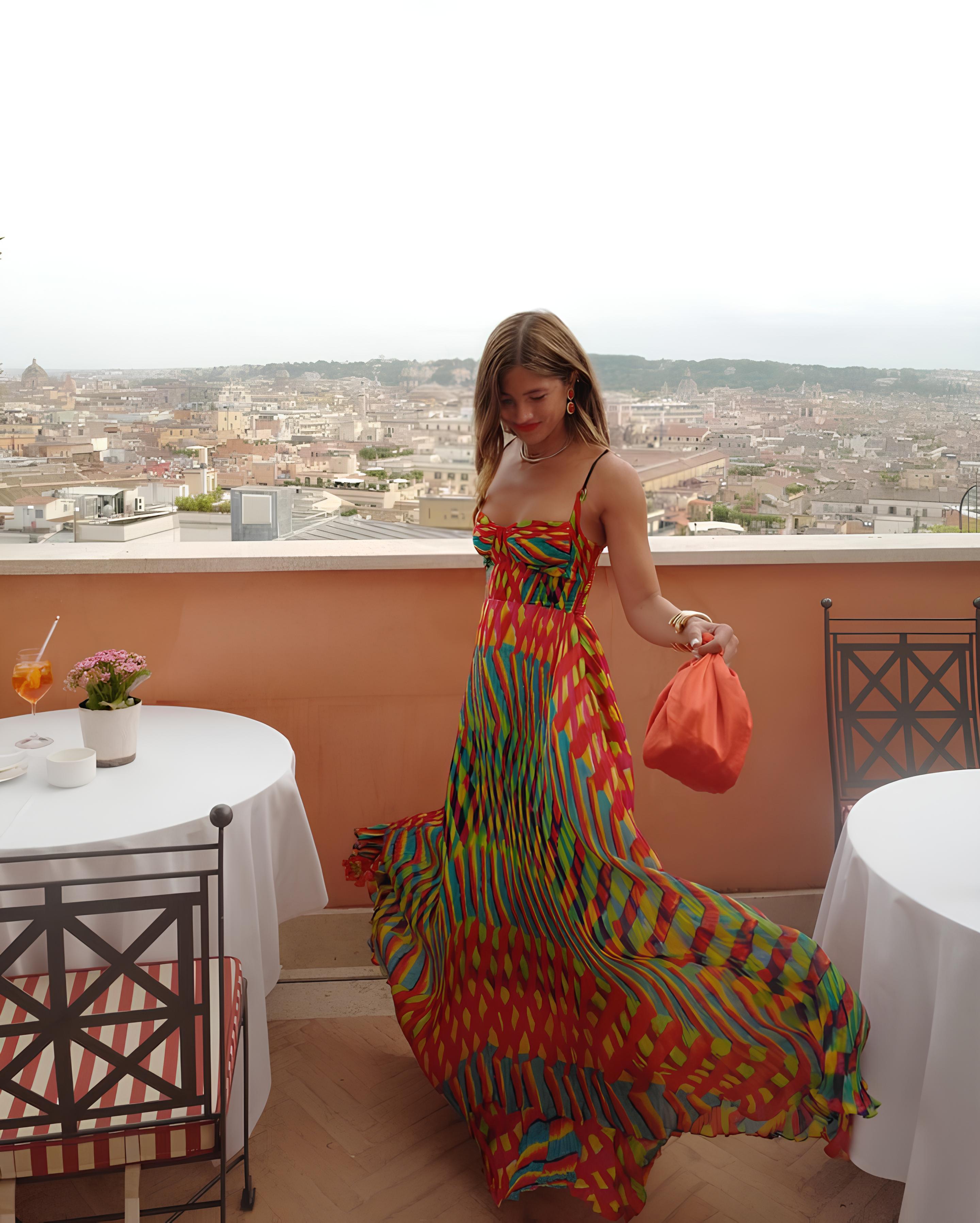 Arlena Maxi Elbise, sanatsal desenleri ve feminen siluetiyle özgün bir şıklık sunuyor. Cesur geometrik ve floral desenleriyle göz alıcı bir etki yaratırken, halter yaka ve kalp formundaki göğüs detayı romantik bir zarafet katıyor. Bel kısmındaki büzgü detayı vücudu zarifçe vurgularken, akıcı A kesim maxi formu hem konfor hem de zarafet sağlar.