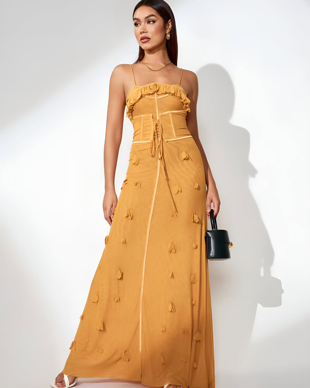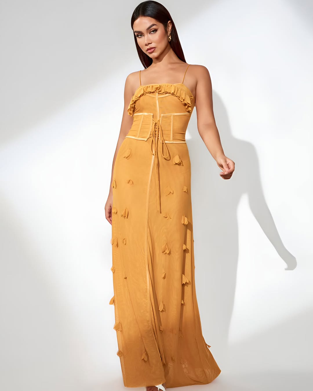 Caela Çiçek Desenli Korseli Maxi Elbise, zarif çiçek detayları ve bağcıklı korsaj tasarımıyla stilinizi yükseltiyor. Akıcı tül eteği ve göz alıcı süslemeleriyle şıklığı bir araya getiren bu özel parça, her ortamda sofistike ve lüks bir duruş sergilemenizi sağlar. Gardırobunuzun vazgeçilmezi olacak bu elbise, özel günler için mükemmel bir seçim.