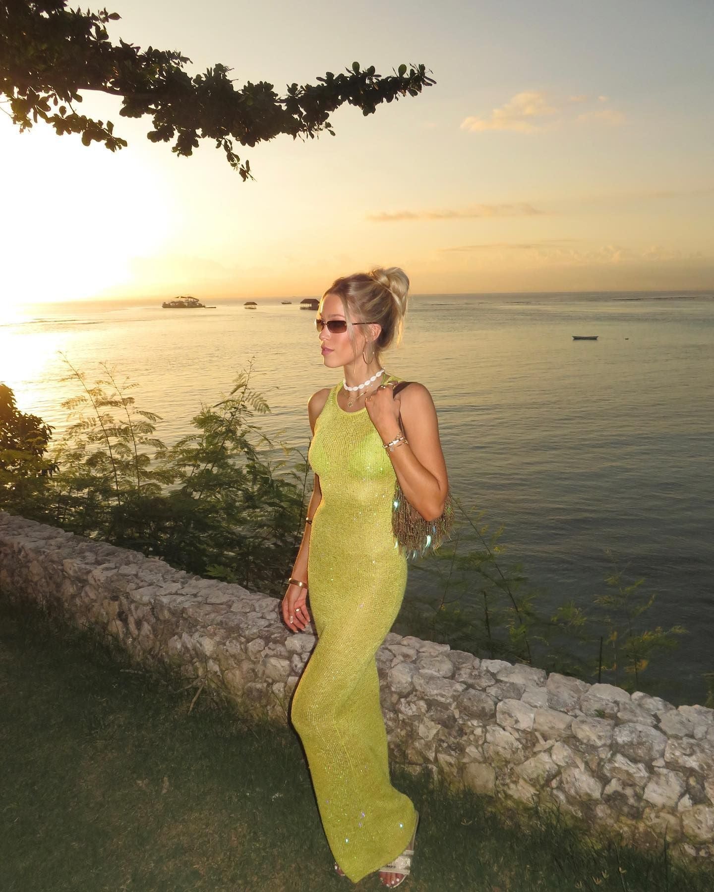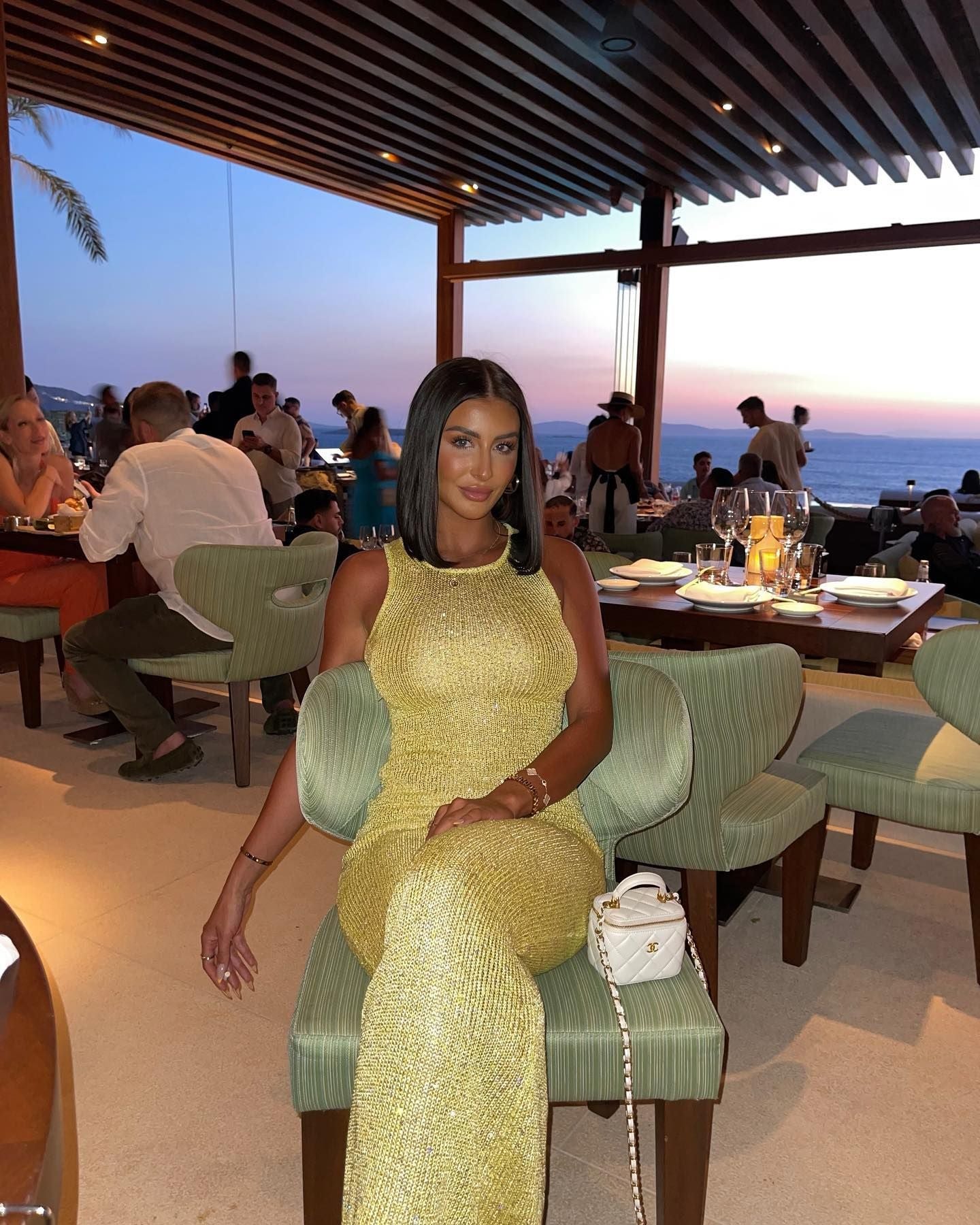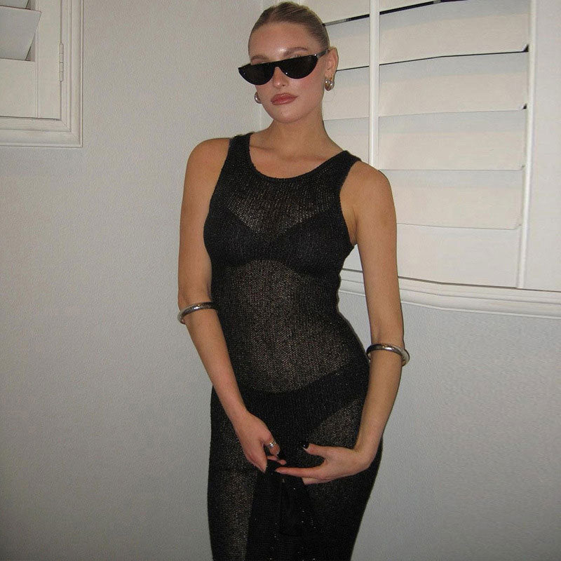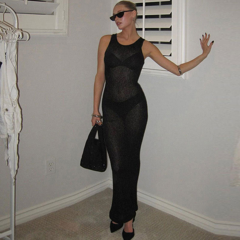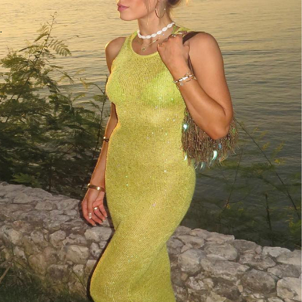 Kolsuz maxi elbise, zarafet ve ışıltıyı bir araya getiren göz alıcı bir tasarımdır. Vücuda oturan kesimi ve U yaka detayıyla dekolte bölgesini zarifçe öne çıkarır. Kumaş boyunca işlenen mikro payetler sayesinde her adımda ışıldayan bu elbise, özel günler için kusursuz bir seçimdir.