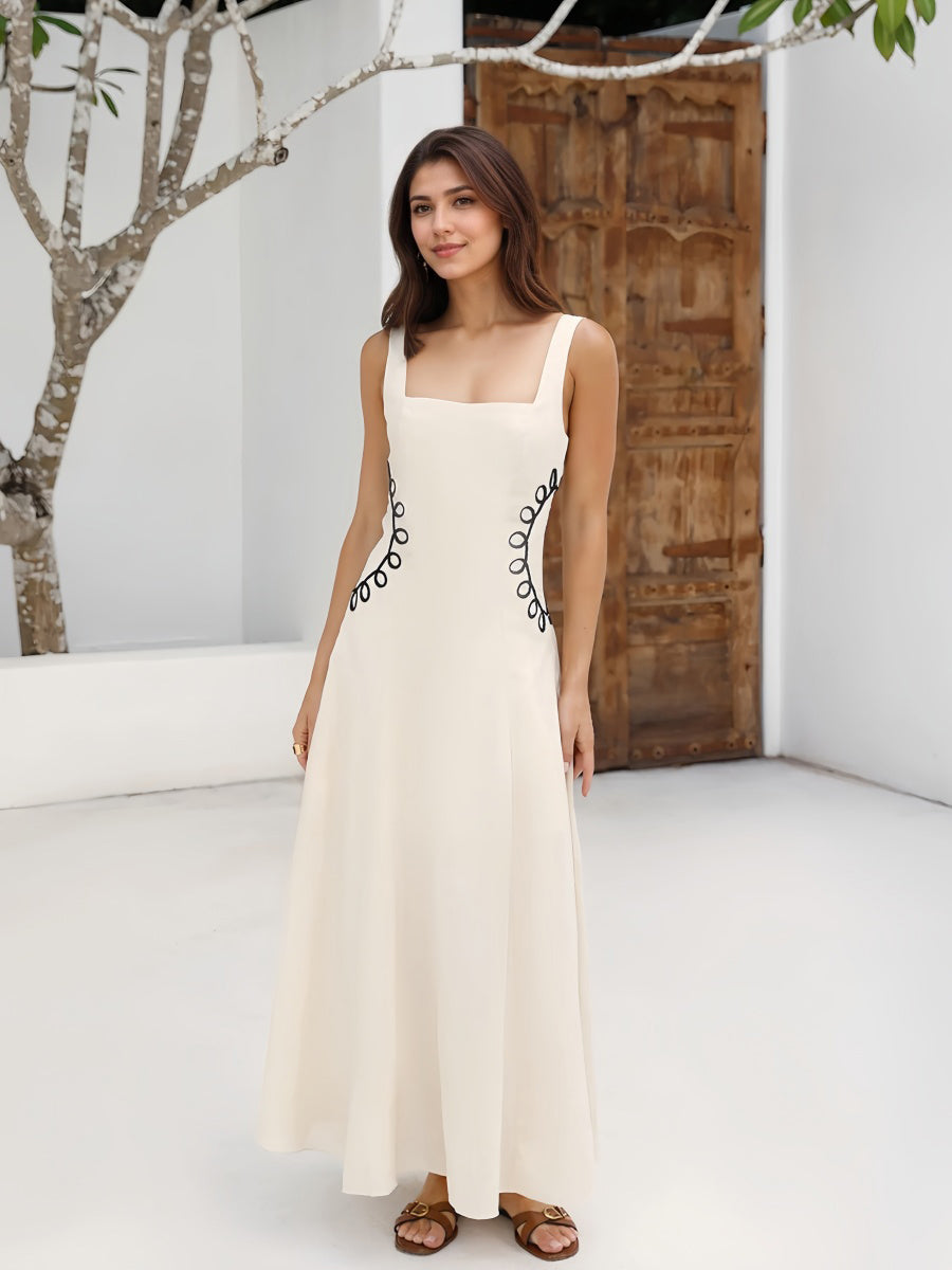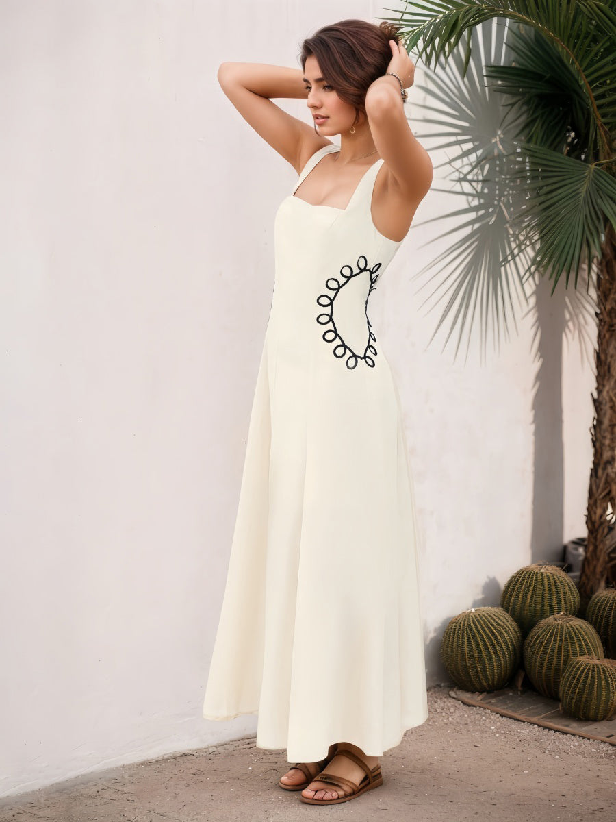 Nakış işlemeli, kolsuz A kesim maxi elbise ile zahmetsiz şıklığı yaşayın. Akışkan silueti her vücut tipini zarifçe tamamlar, narin nakış detayları ise sanatsal ve sofistike bir dokunuş katar. Hem günlük kullanıma uygun hem de rahat ve şık bir seçim.