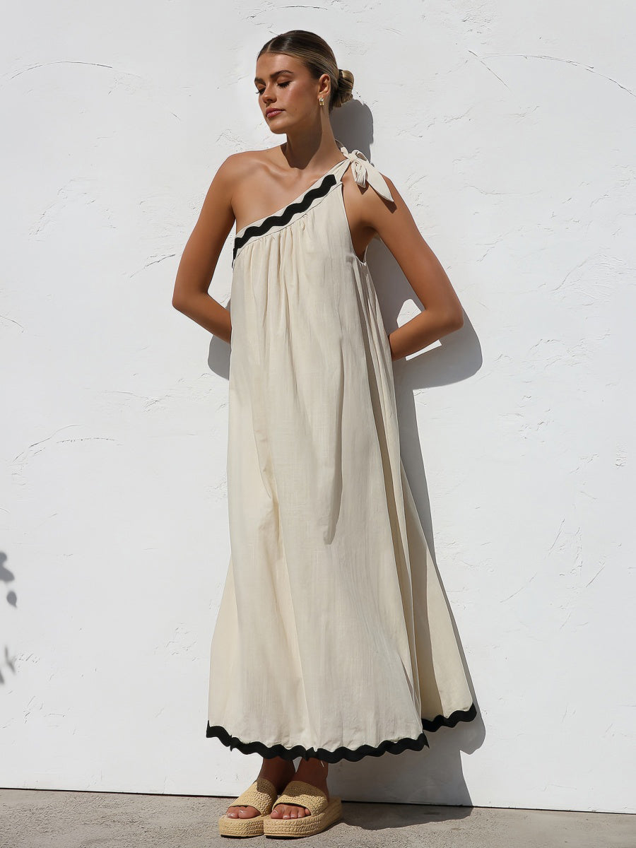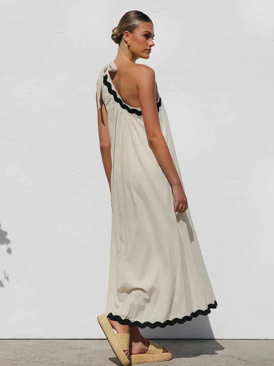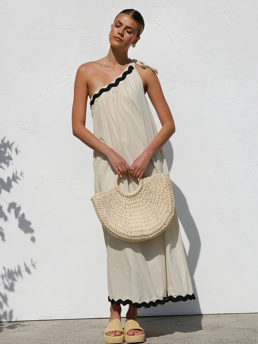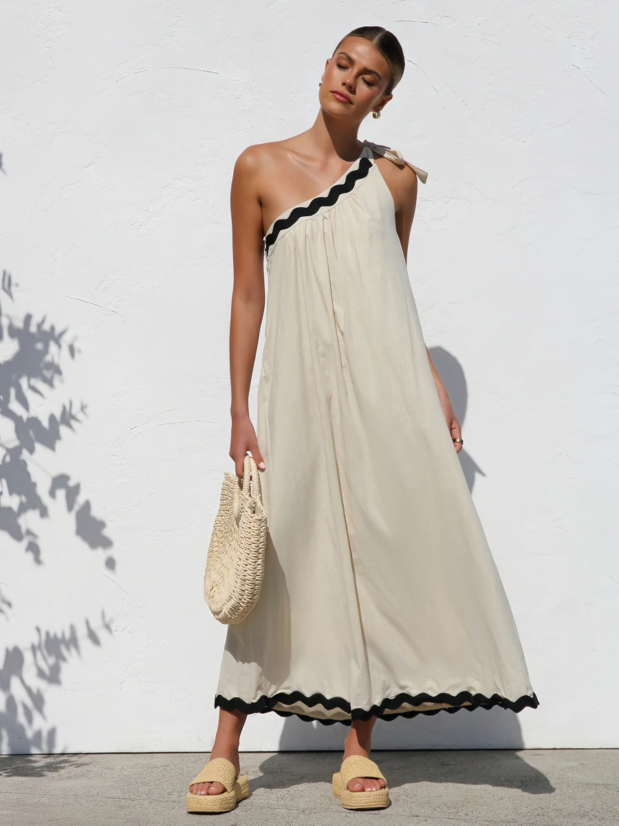 Tek omuz tasarımı ve kontrast etek ucu detayıyla göz alıcı bir yaz stili sunan bu maksi elbise, sırt dekoltesi ve bağlamalı omuz detayıyla feminen bir siluet yaratır. Plajdan akşam yemeğine şıklığınızla fark yaratın.