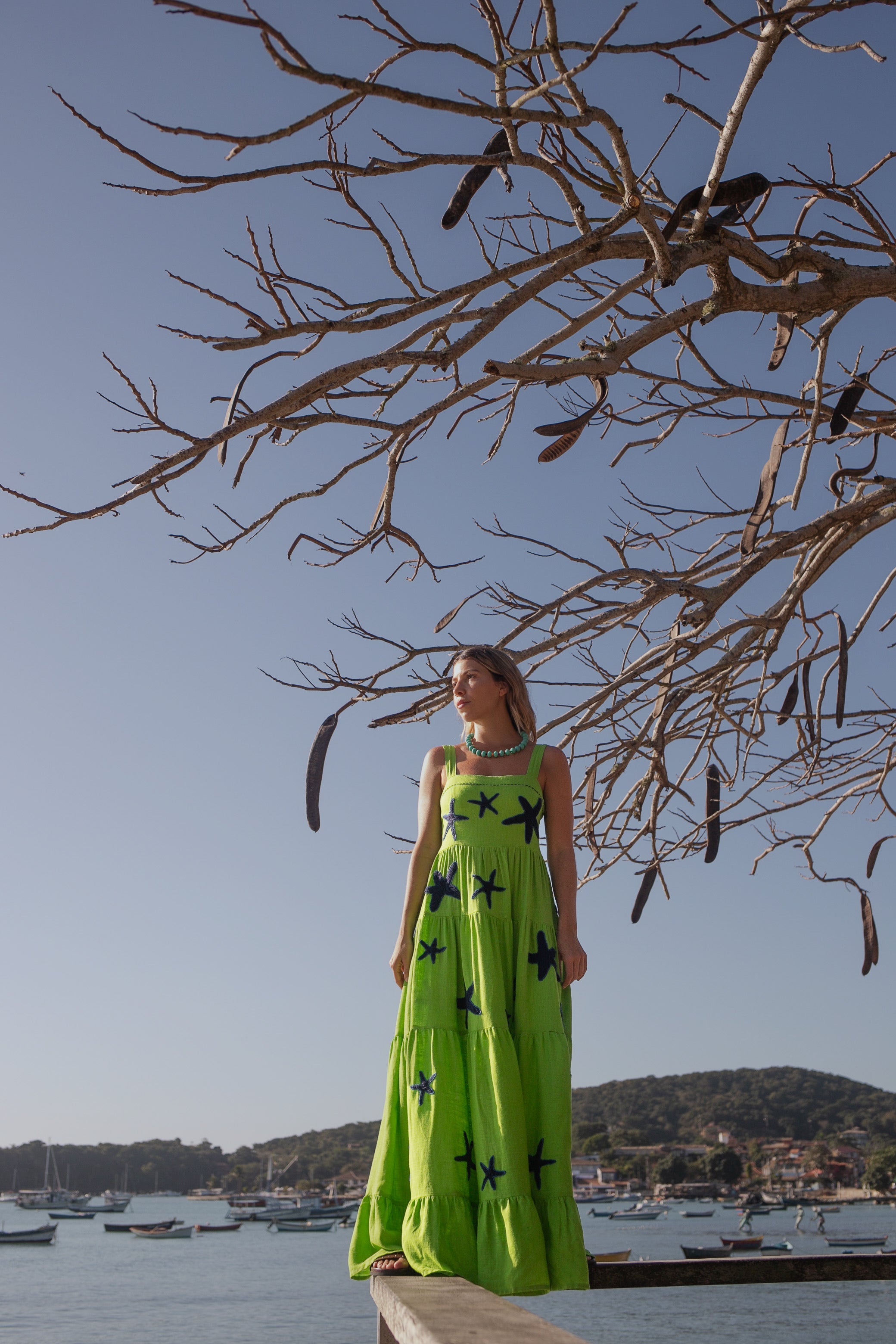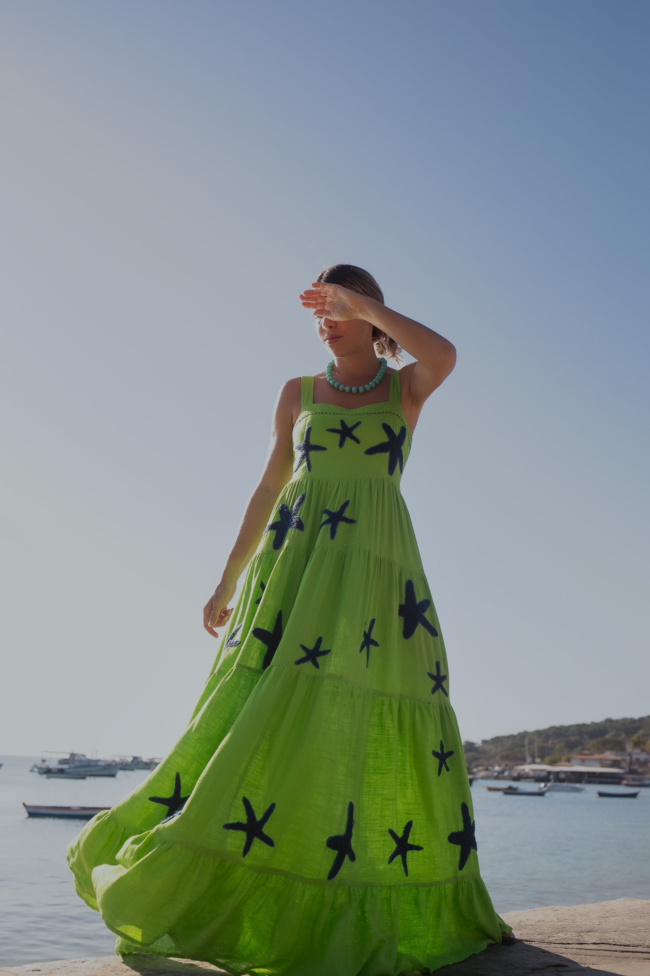 Coralia Elbise – Güzellik ve konforun kusursuz birleşimini arayanların gözdesi. El işçiliğinin en zarif örneklerinden biri olan bu model, her bir deniz yıldızı motifi için 3,5 saatlik titiz bir çalışma gerektirir. İki farklı nakış tekniği – dolgu amarrado ve gövde dikişi – ile tamamen elde işlenerek benzersiz bir görünüm kazanır. Yaz esintisini taşıyan bu özel parça, zarafeti ve doğal şıklığıyla gardırobunuzun imza elbiselerinden biri olacak.