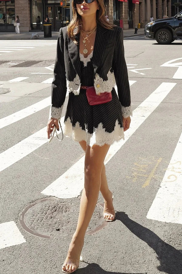 Liora Mini Elbise, modern şıklığı feminen detaylarla buluşturuyor. Çizgili dantel patchwork tasarımı dikkat çekici bir kontrast yaratırken, pileli yapısı hareketli ve zarif bir siluet sunar. Vücuda oturan slim fit kesimi her ortamda şıklığı garanti eder.